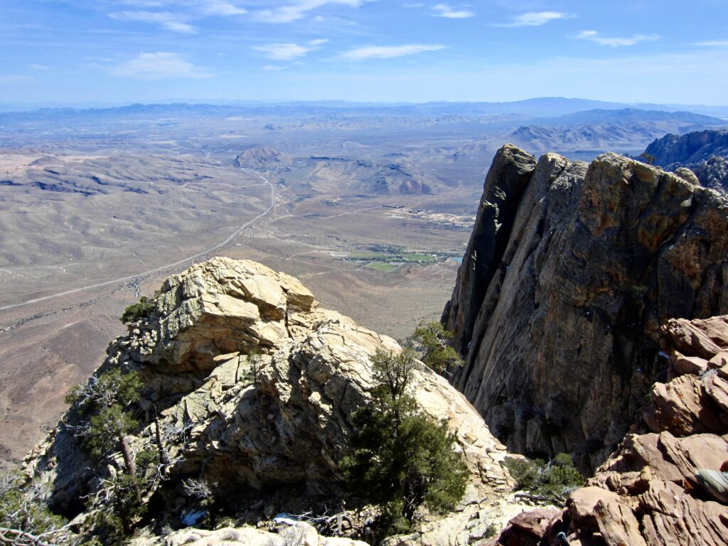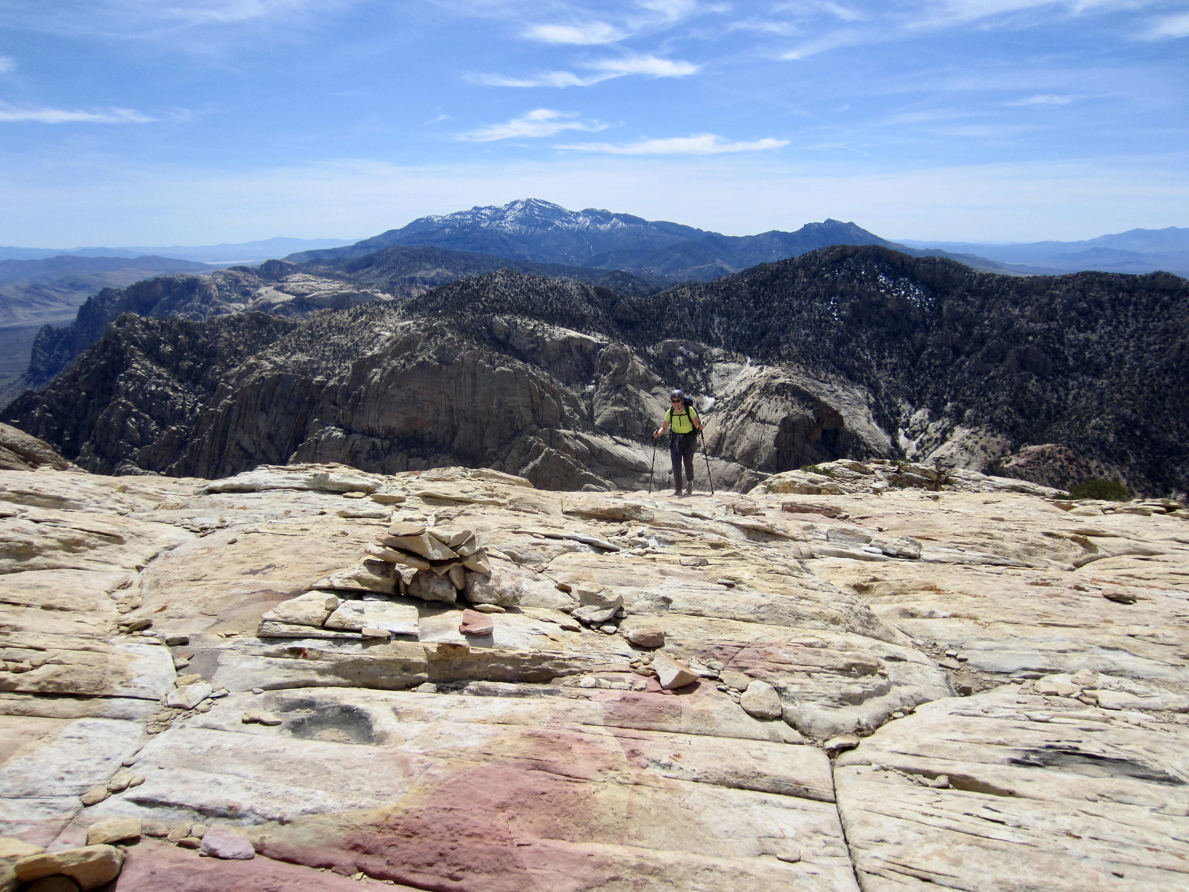The weather was mild, calm, and clear, so we were able to enjoy a long lunch on the summit. As expected, Mt. Wilson provides a marvelous view of Red Rock Basin, more than 3000 feet below the precipitous east face. The sprawling city of Las Vegas stretched out to our northeast, and the snowy crown of Charleston Peak was visible 17 miles to our northwest.