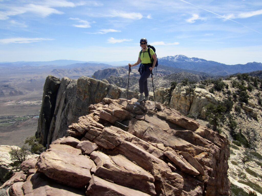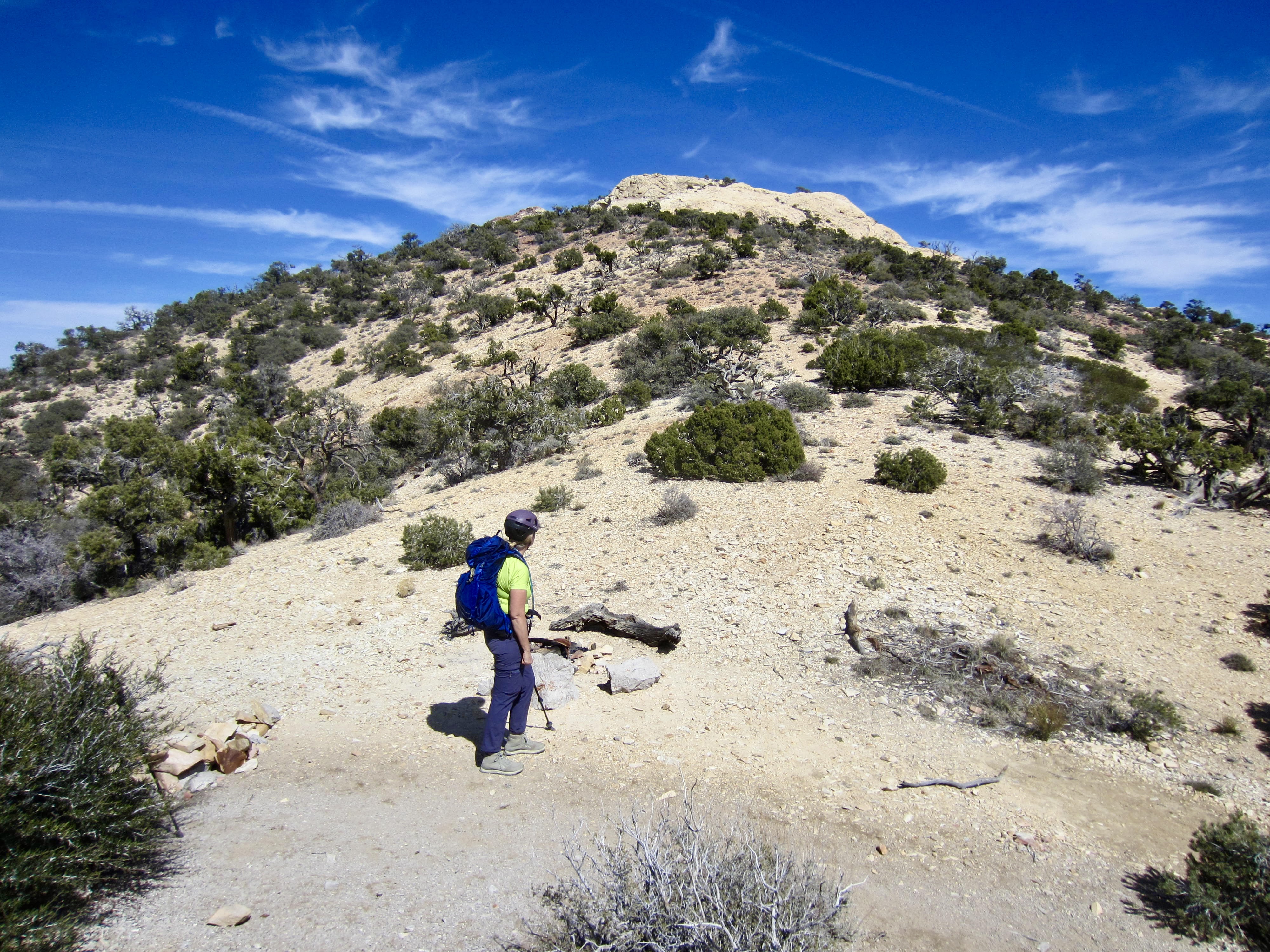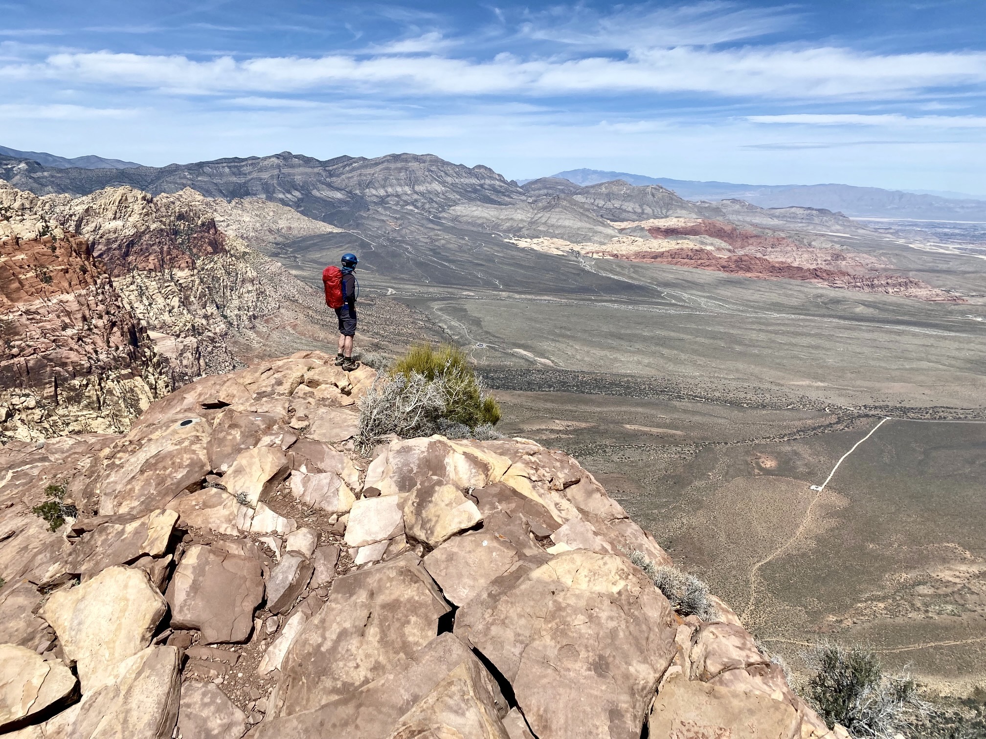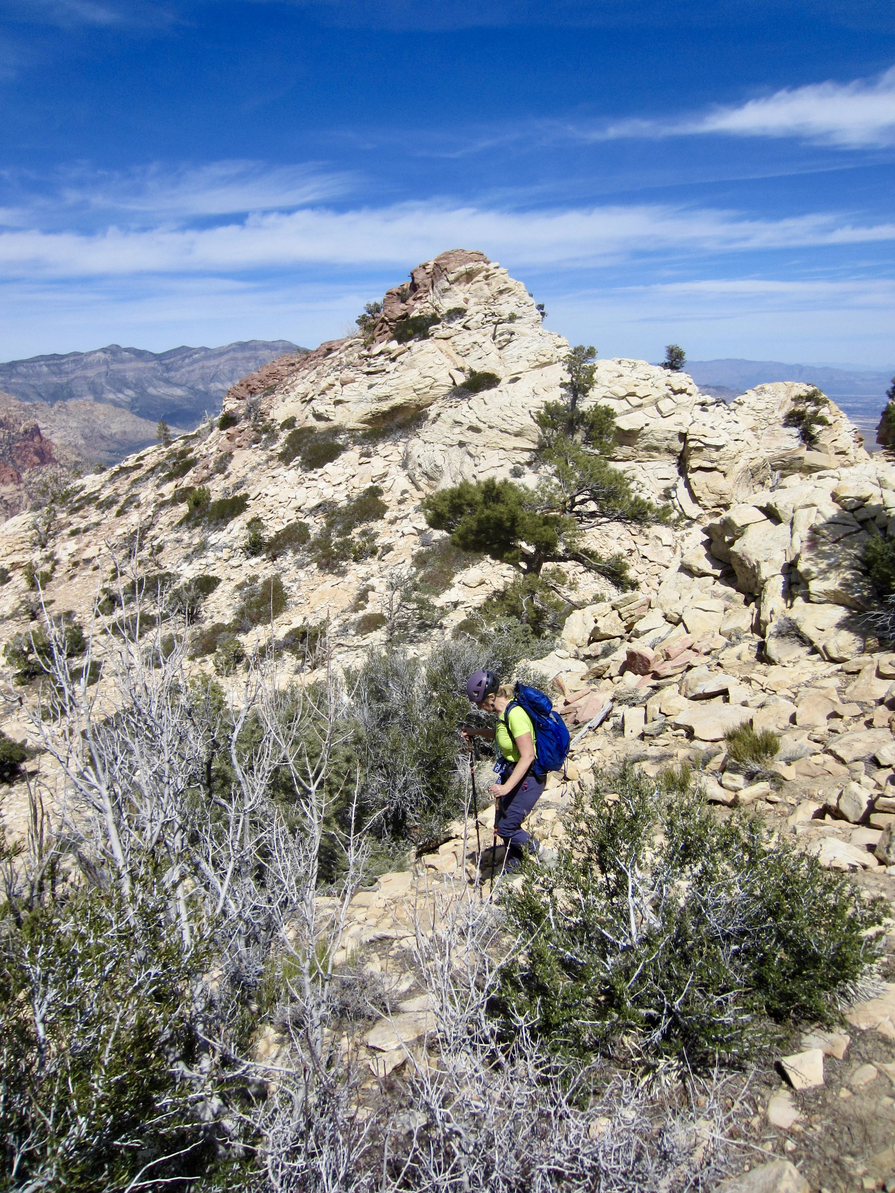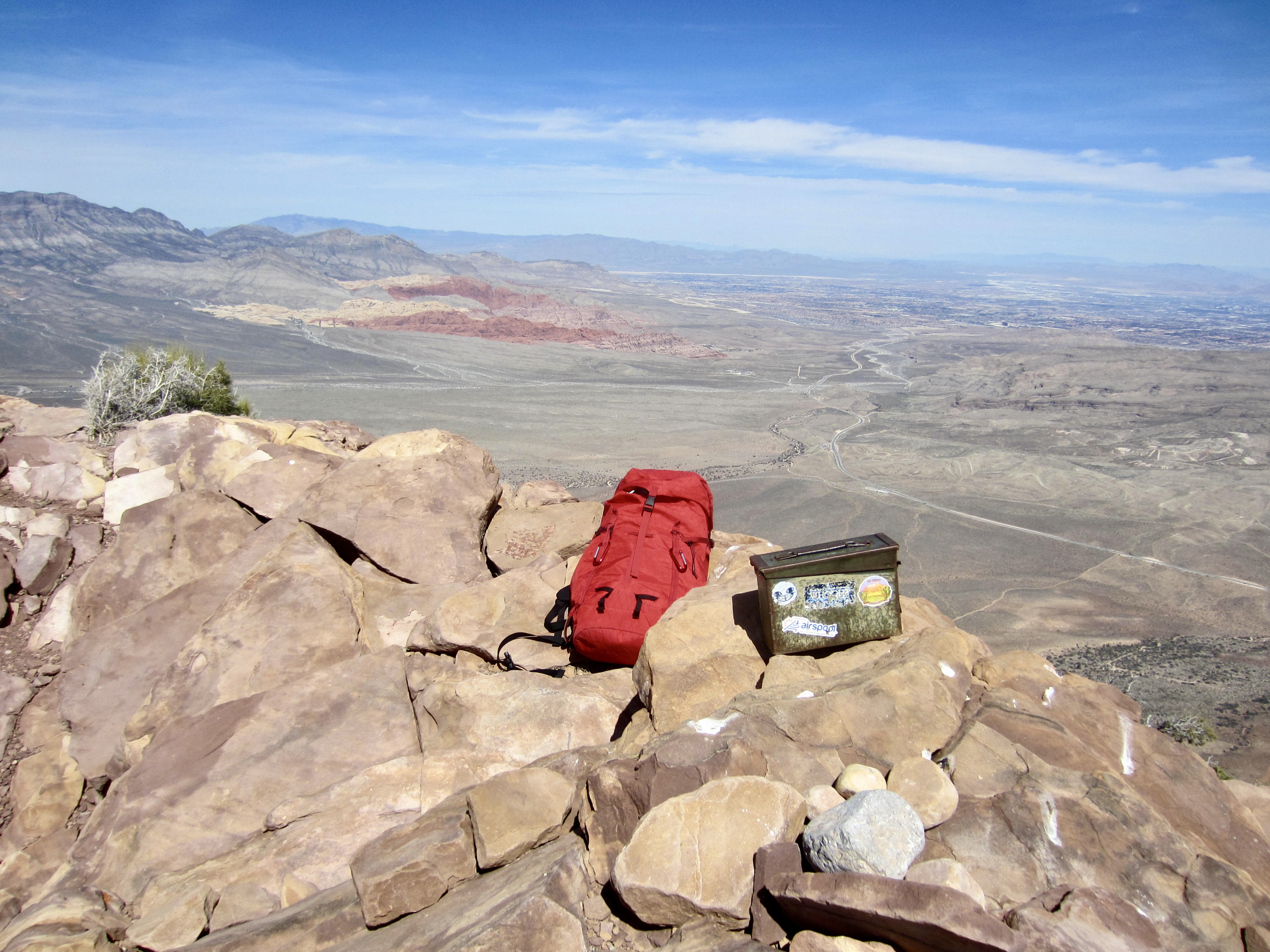 Mt. Wilson is not only the highest peak in the Sandstone Bluffs that tower above Red Rock Canyon National Conservation Area (“Red Rocks”) but also the most massive when viewed from any point in the basin. These attributes, combined with the fact that it is widely known to be one of the most difficult “hikes” at Red Rocks, make it a particularly irresistible summit objective. I use the term “hikes” loosely because the standard approach via First Creek Canyon involves a LOT of scrambling and bouldering. In fact, the most difficult part of the total ascent is, by far, the canyon approach; once you are out of the canyon, the mountain becomes surprisingly benign.