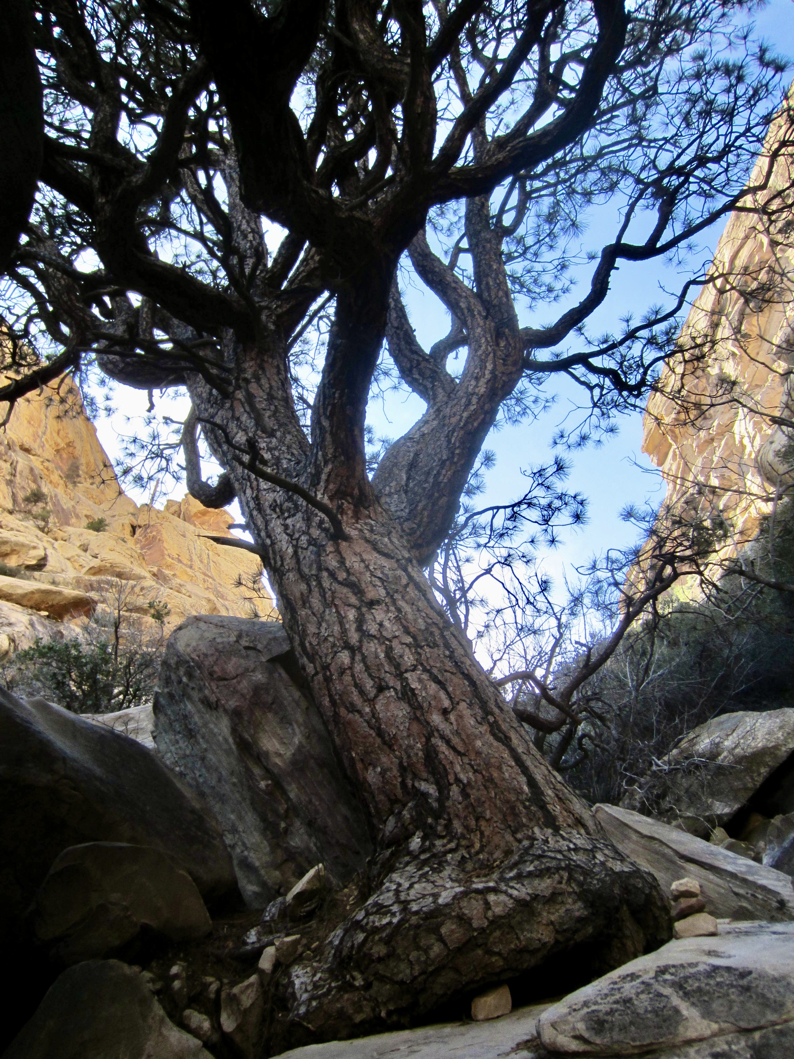 Along the way, we got off-route and had to use our 10-meter scramble rope in order to surmount a tricky rock step. This was followed by a short bushwhack through dense vegetation before we were able to regain the trail. Once back on-route, we kept scrambling up the canyon invert past a remarkably large and twisted ponderosa pine that grows in a shady grotto (4.3 hours + 1500 feet from TH).