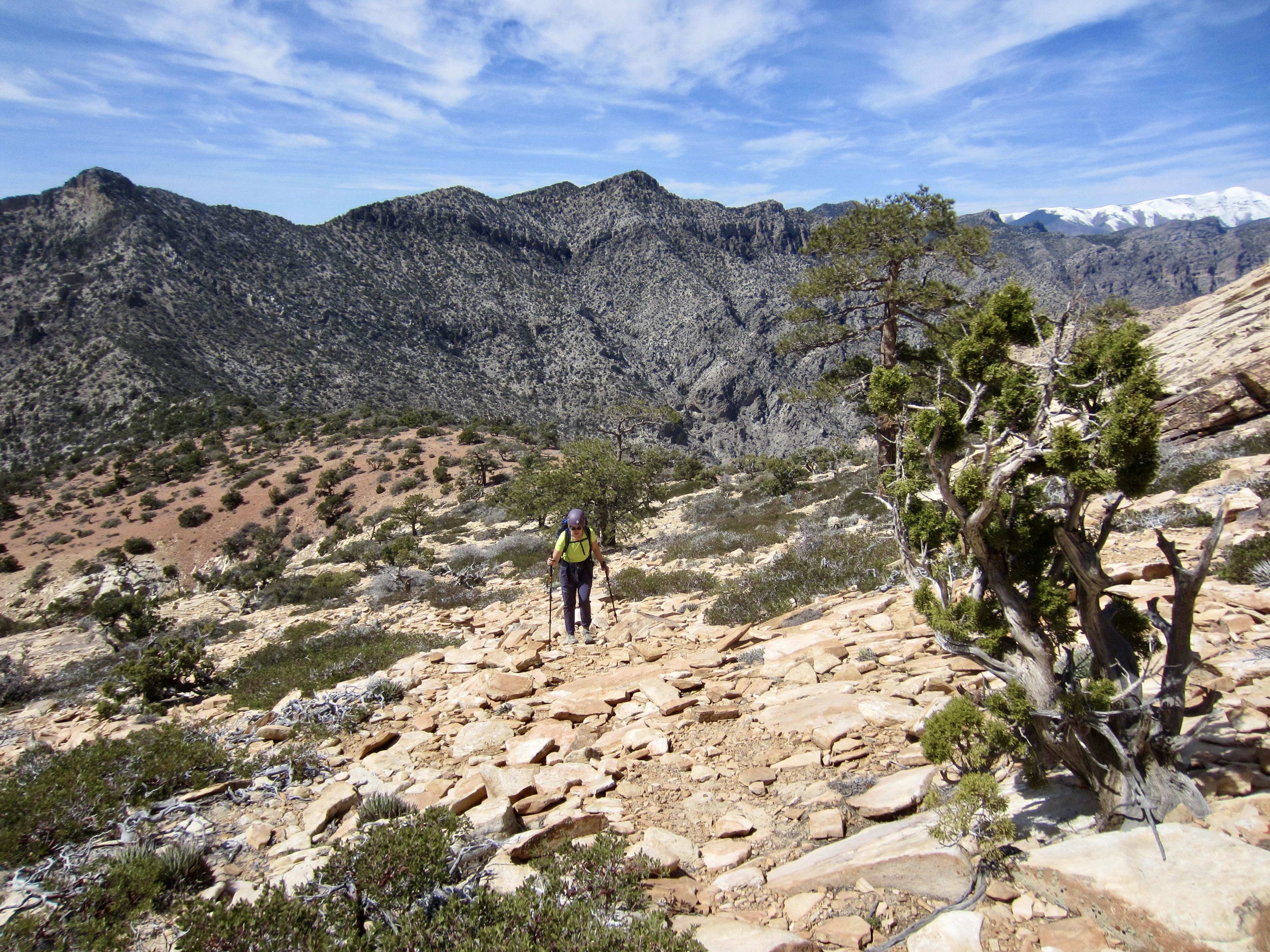 After several hours of frustratingly slow progress, we came to a point where the trail climbs steeply rightward out of the canyon invert. A bit farther up, it makes another right-hand turn and begins a rising northeasterly traverse across an open slope of scree and talus. We were very happy to finally leave the canyon behind, as our traverse took us to a 6450-foot saddle on Mt. Wilson’s southwest ridge (5.8 hours + 2850 feet).
