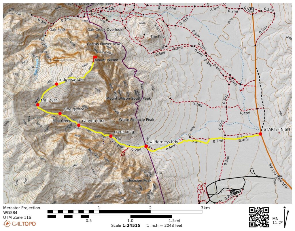 Way Points: First Creek Spring & First Creek lower crossing & First Creek Canyon fork & pine grotto & trail turn & Southwest Wilson Saddle & pine cleft & false summit & Mt. Wilson summit (trail hike & rock scramble)