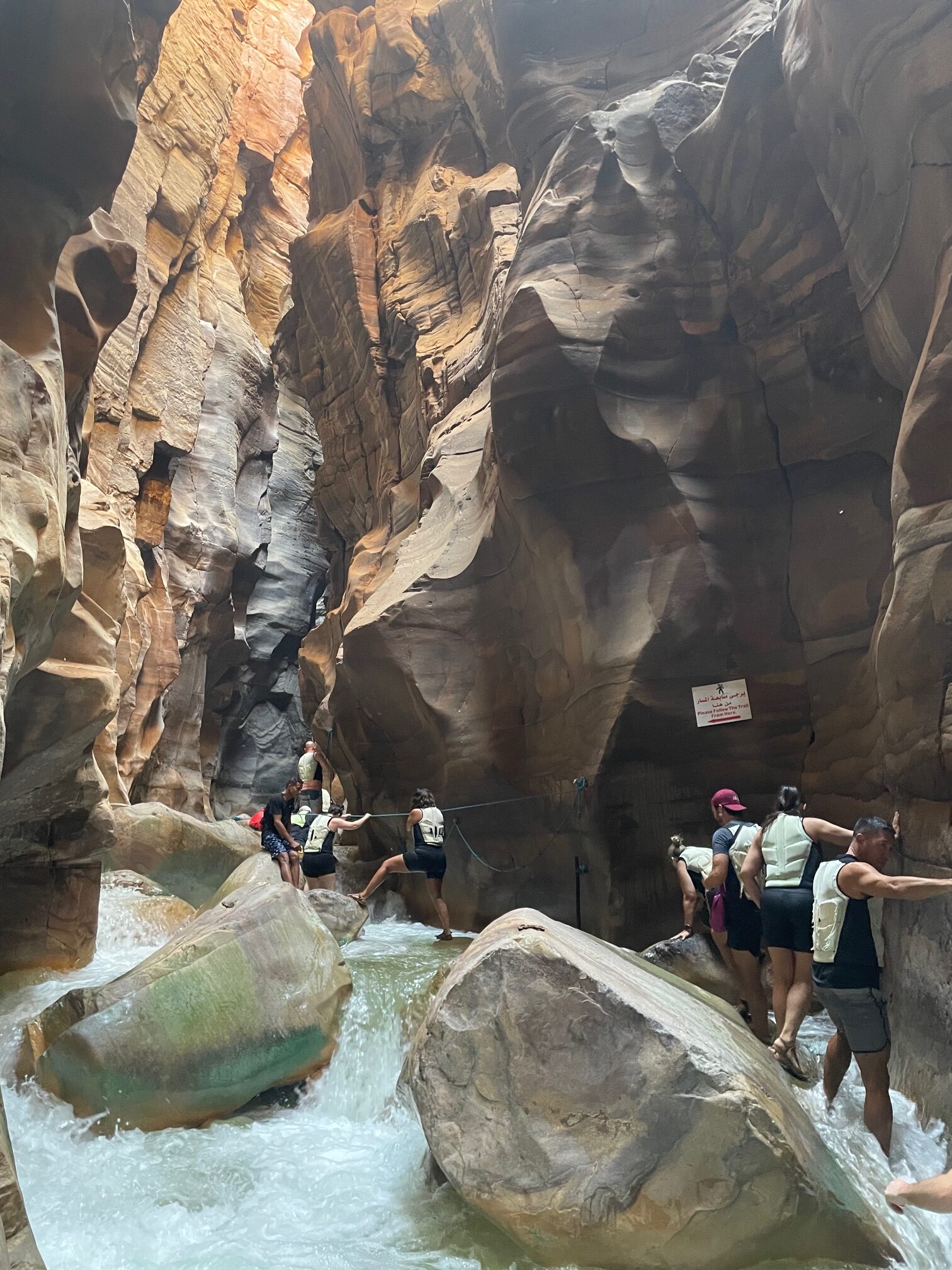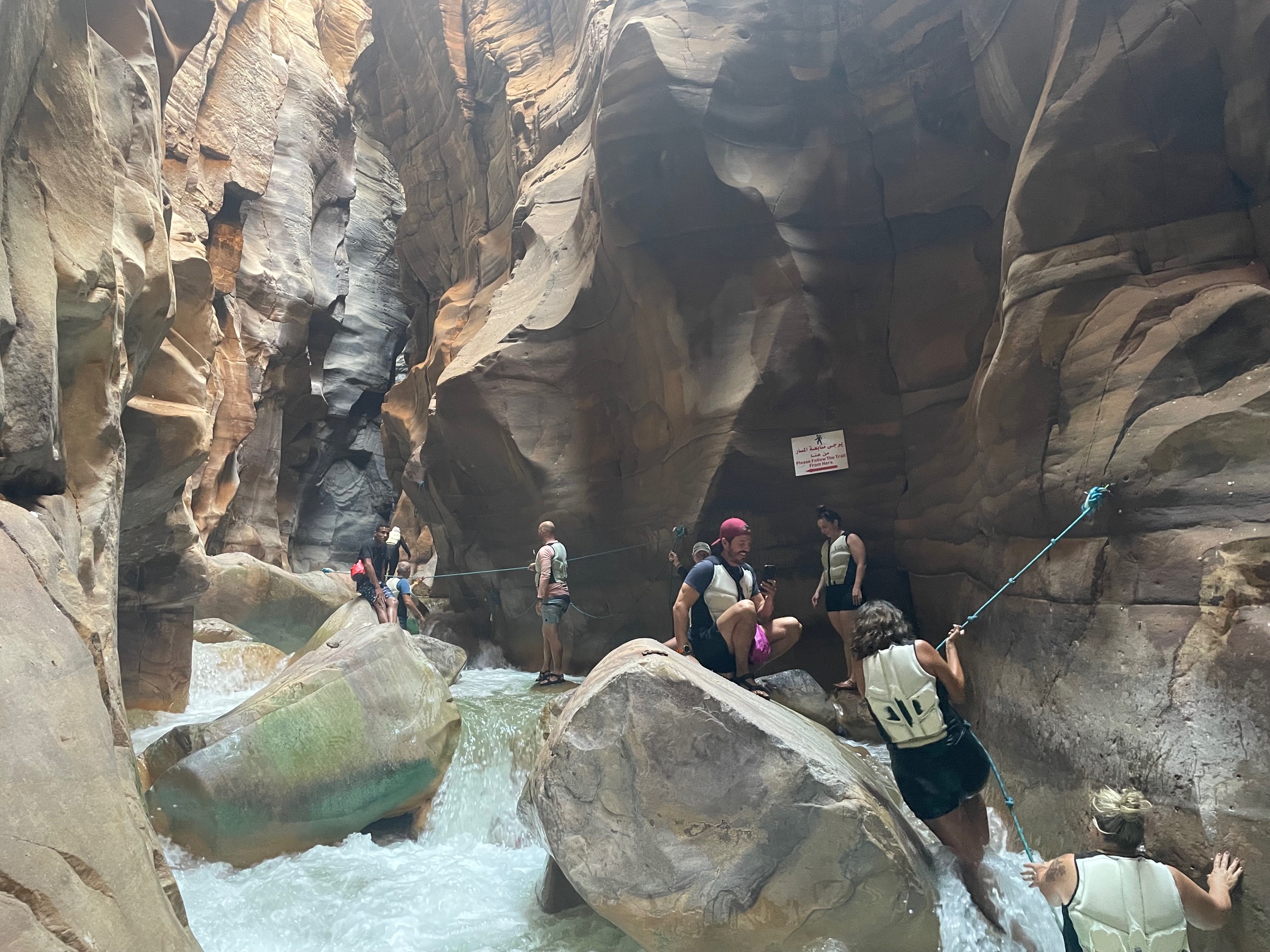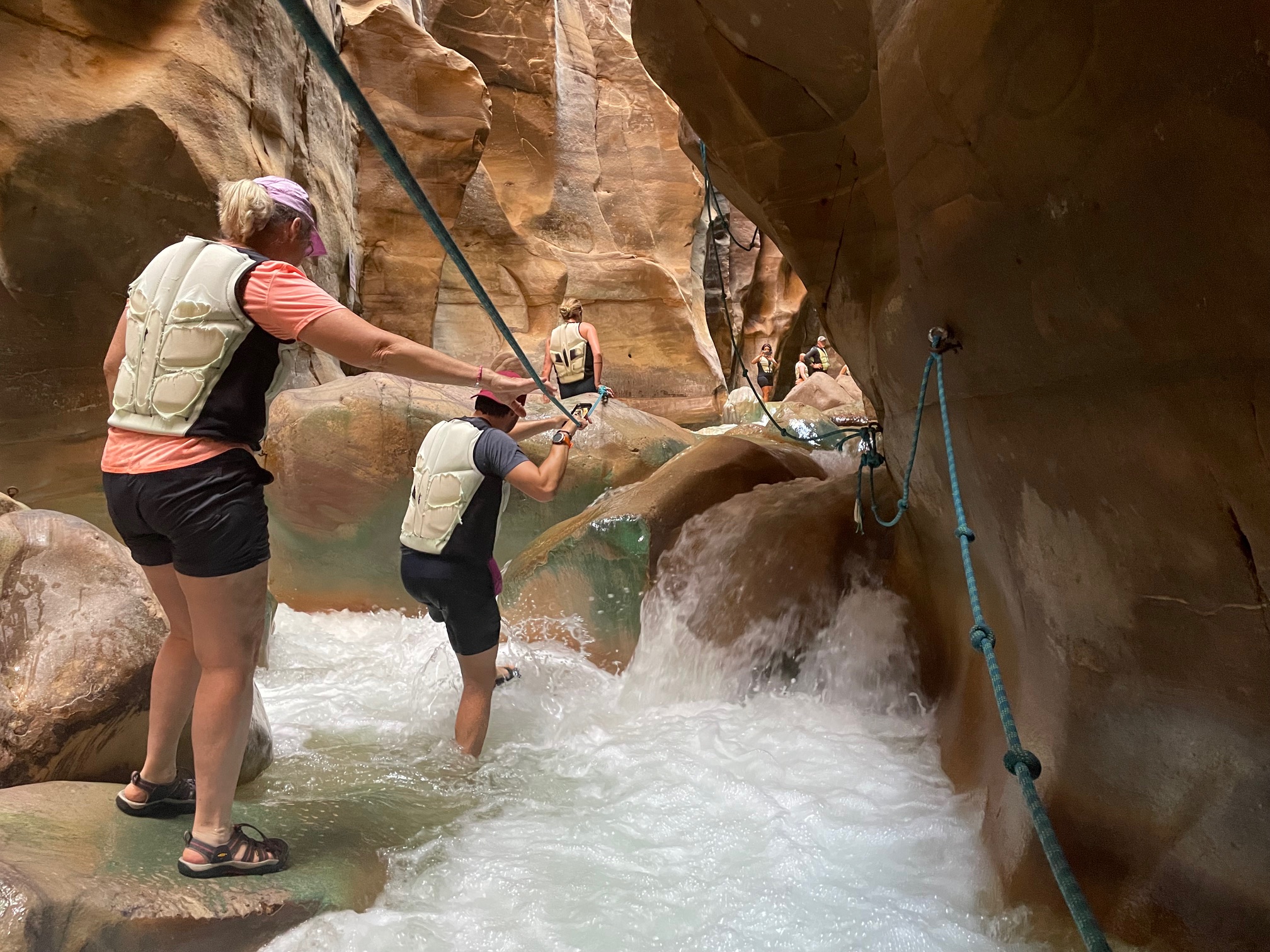 Eileen and I wrapped up our Jordan adventure vacation by exploring Wadi Mujib, or Mujib Canyon, with our 15-person trekking group, which included executive guides Brooke and James of Adventures Beyond (provisional name); regional guide Mahmoud of Experience Jordan Adventures; and ten other clients: Barbara, Brian, Courtney, Edwin, Elizabeth, Josh, Laura, Melissa, Stephen, and Storm.