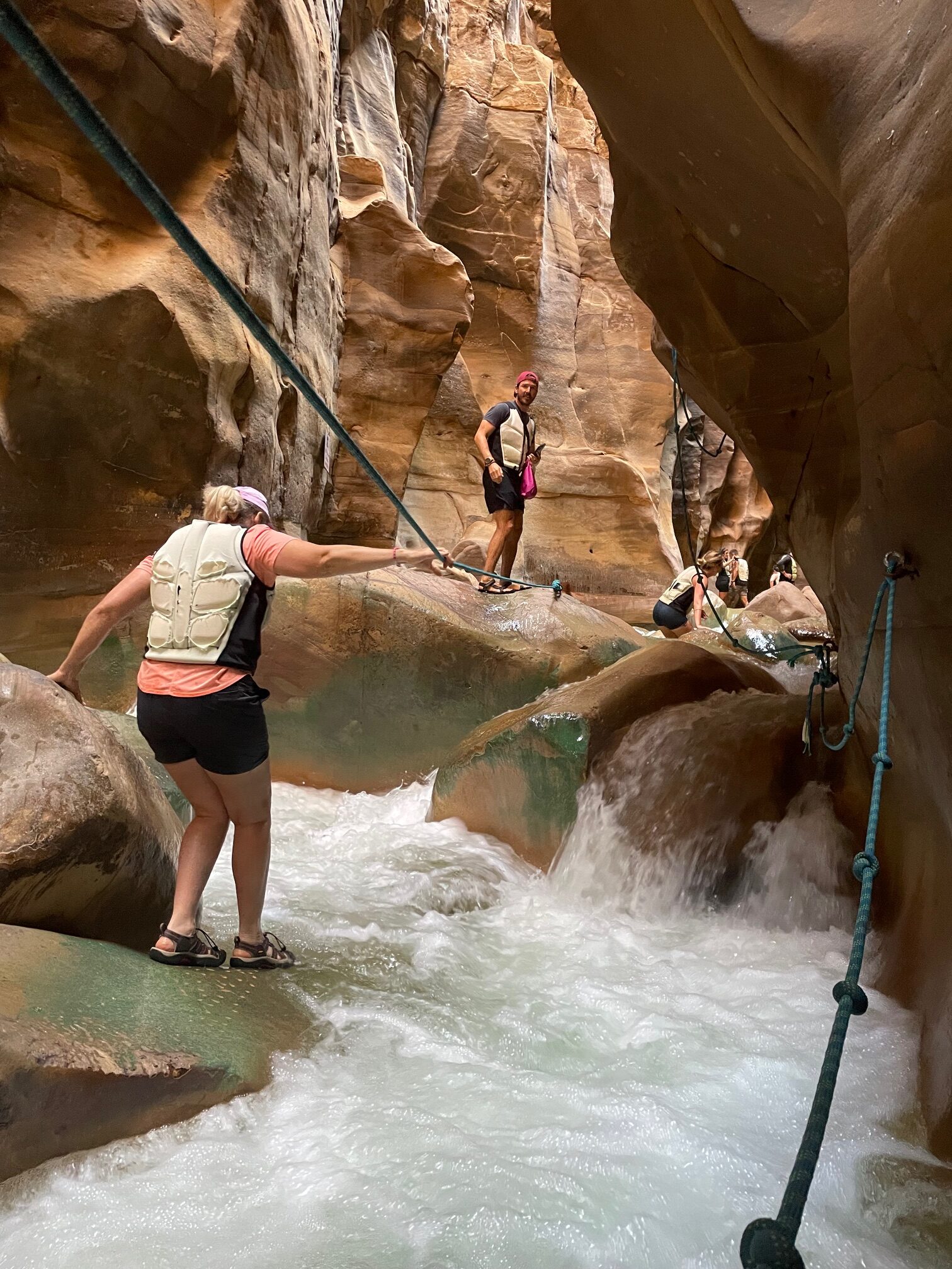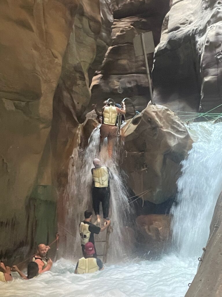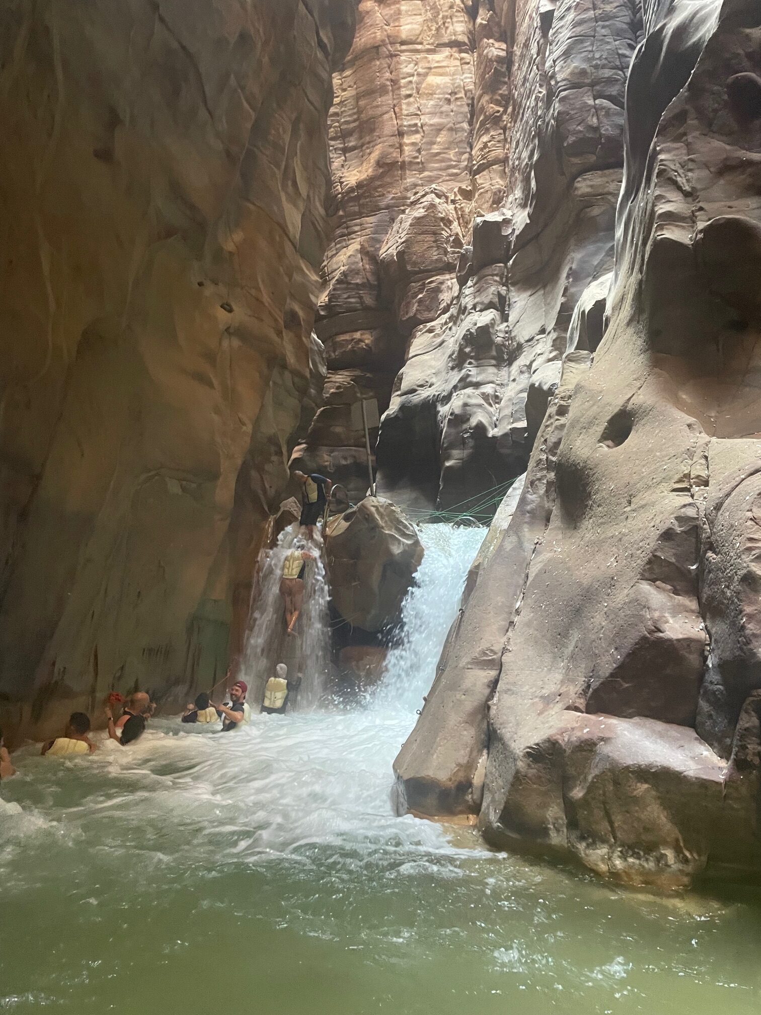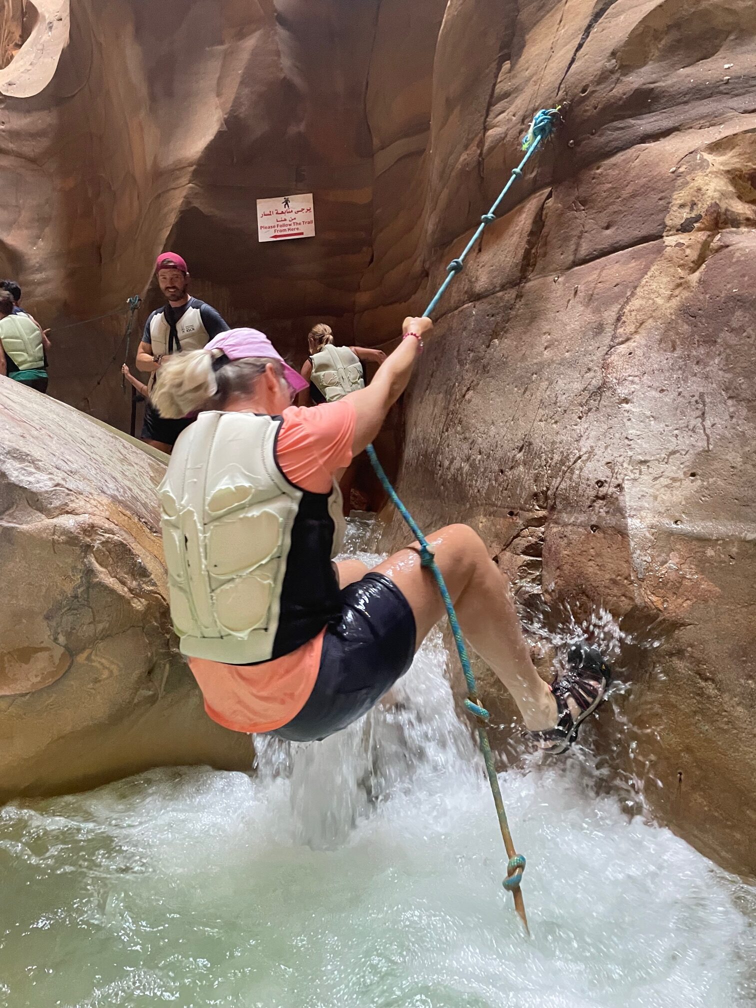 Mujib Canyon is a visually stunning gash in the sandstone plateau bordering the Dead Sea. It narrows down to a deep, twisting slot with multiple waterfalls. To provide visitors with a fun and safe experience, a variety of fixed ropes, ladders, rungs, and cleats have been attached to the rock walls. Borrowing from rock-climbing terminology, the exploration of Mujib Canyon could best be described as sport canyoneering.
