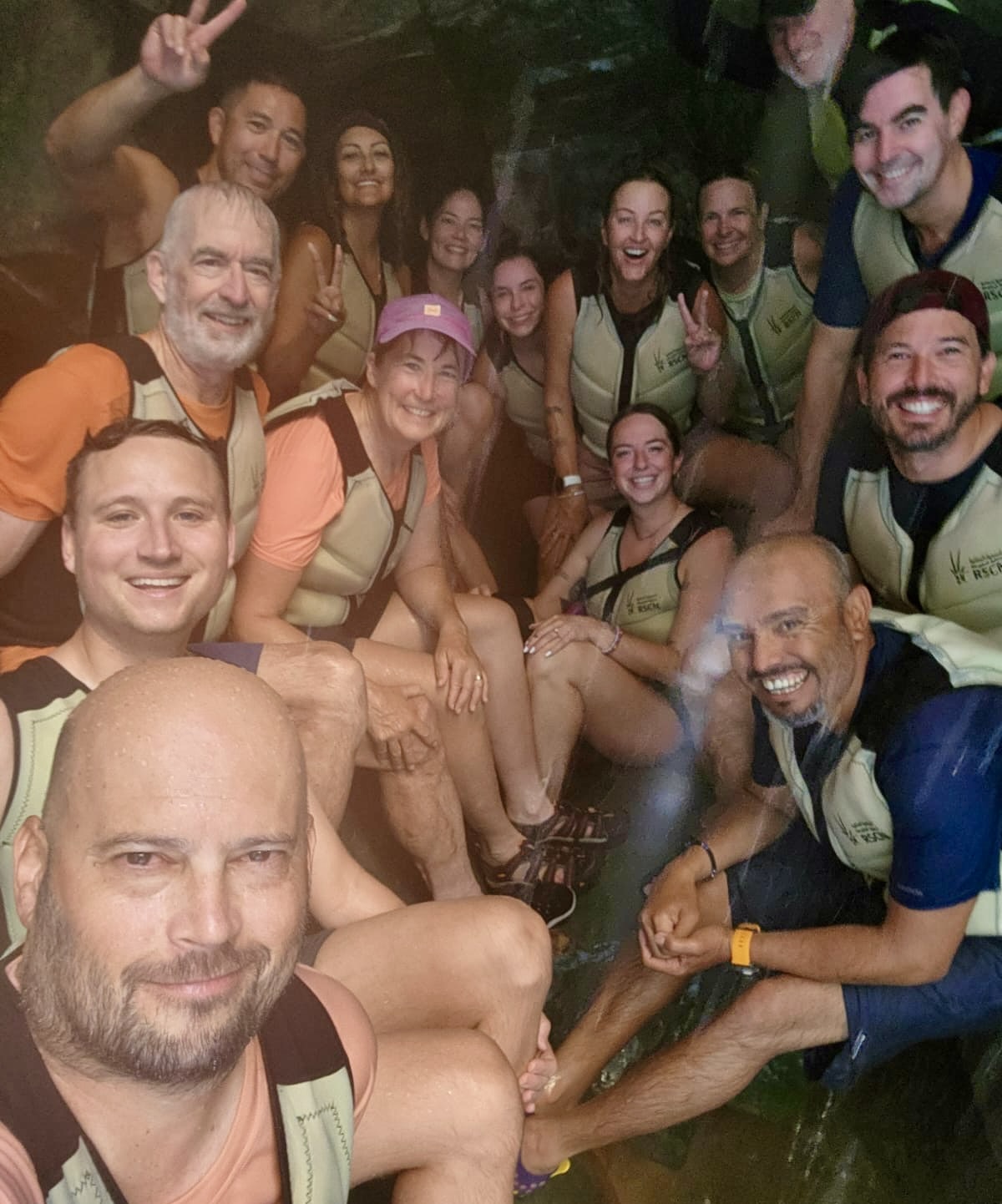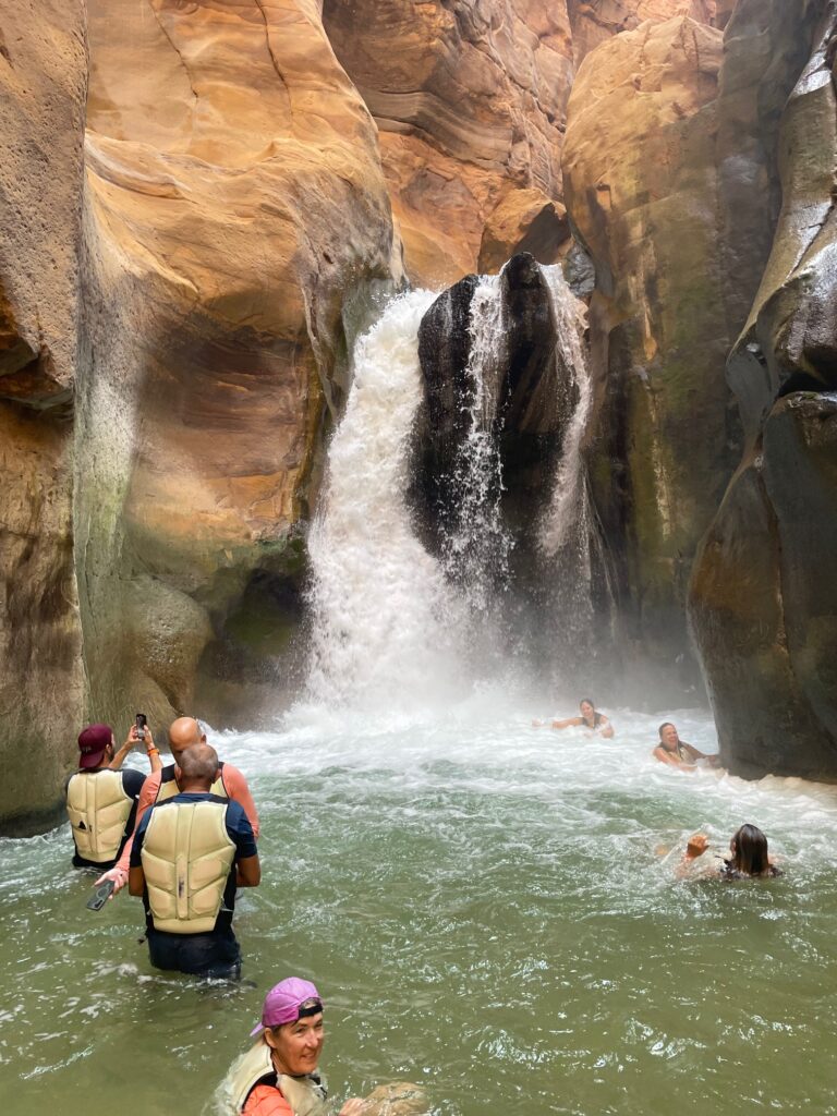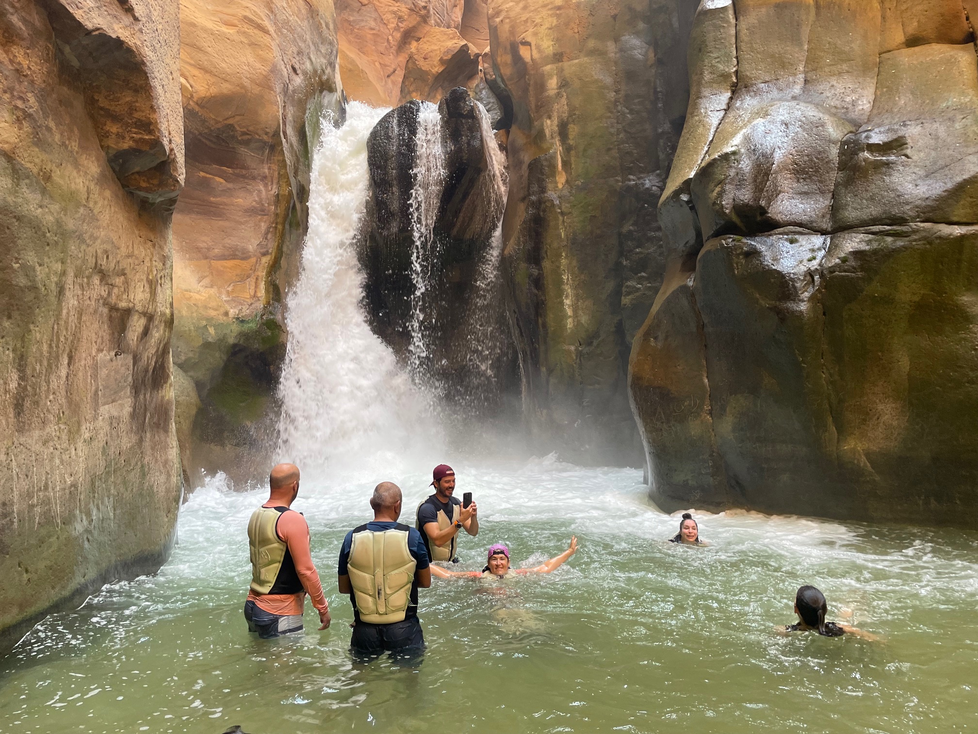 After an hour of steady travel, we passed under a giant chockstone and arrived at our destination: an impressive waterfall measuring approximately 25 feet / 7 meters high. Everyone ducked into a cave behind the waterfall and huddled for a group photo.