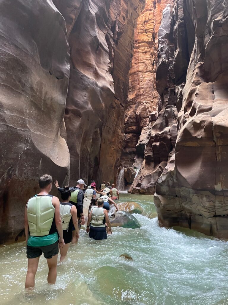 We began our trek at the Mujib Adventures Center alongside the Dead Sea Highway. This starting point has an elevation of -1280 feet / -390 meters. Yes, those are minus signs; we actually started that far below sea level! Each of us was given a flotation vest and water shoes before heading into the canyon mouth.