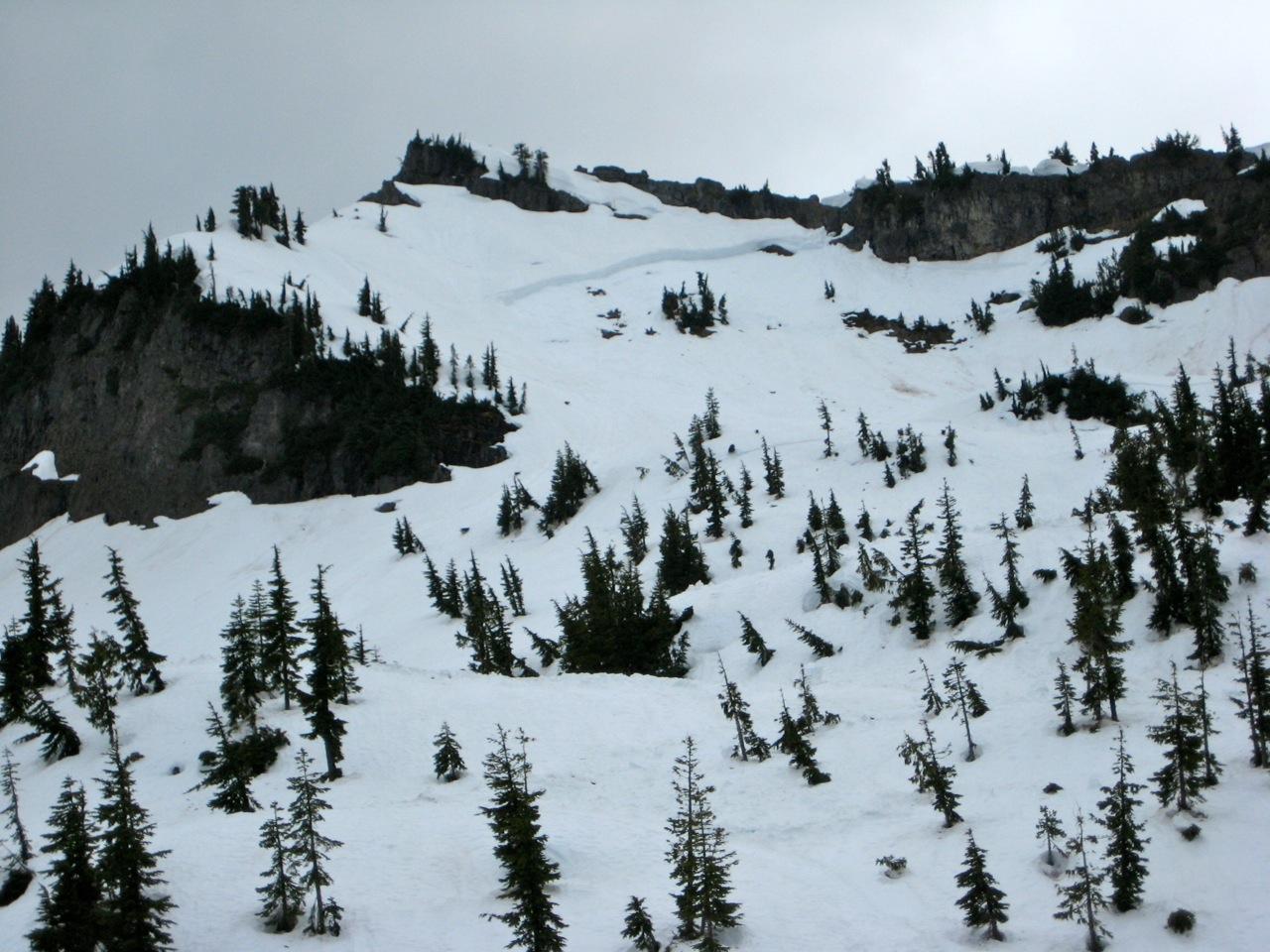 After climbing back up toward Naches Basin, we continued our counter-clockwise loop around Naches Peak. This made for a more interesting return to Chinook Pass, and it afforded us a look at an impressive slab avalanche that had released closely below the summit. We estimated the fracture crown to be 3 to 5 feet high—and not more than a week old.