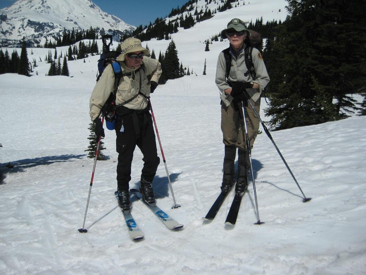 While traversing through Naches Flats, we encountered a solo skier coming over a small ridge. It turned out to be Eva Meassick, whom I had encountered several years ago in pretty much the same location. If you don’t know Eva, you really should. She is 75 years young and serves as a volunteer backcountry ski ranger for Mt Rainier National Park. Her current schedule involves ski-patrolling the backcountry 2 to 3 days per week throughout the entire winter and spring—always alone.