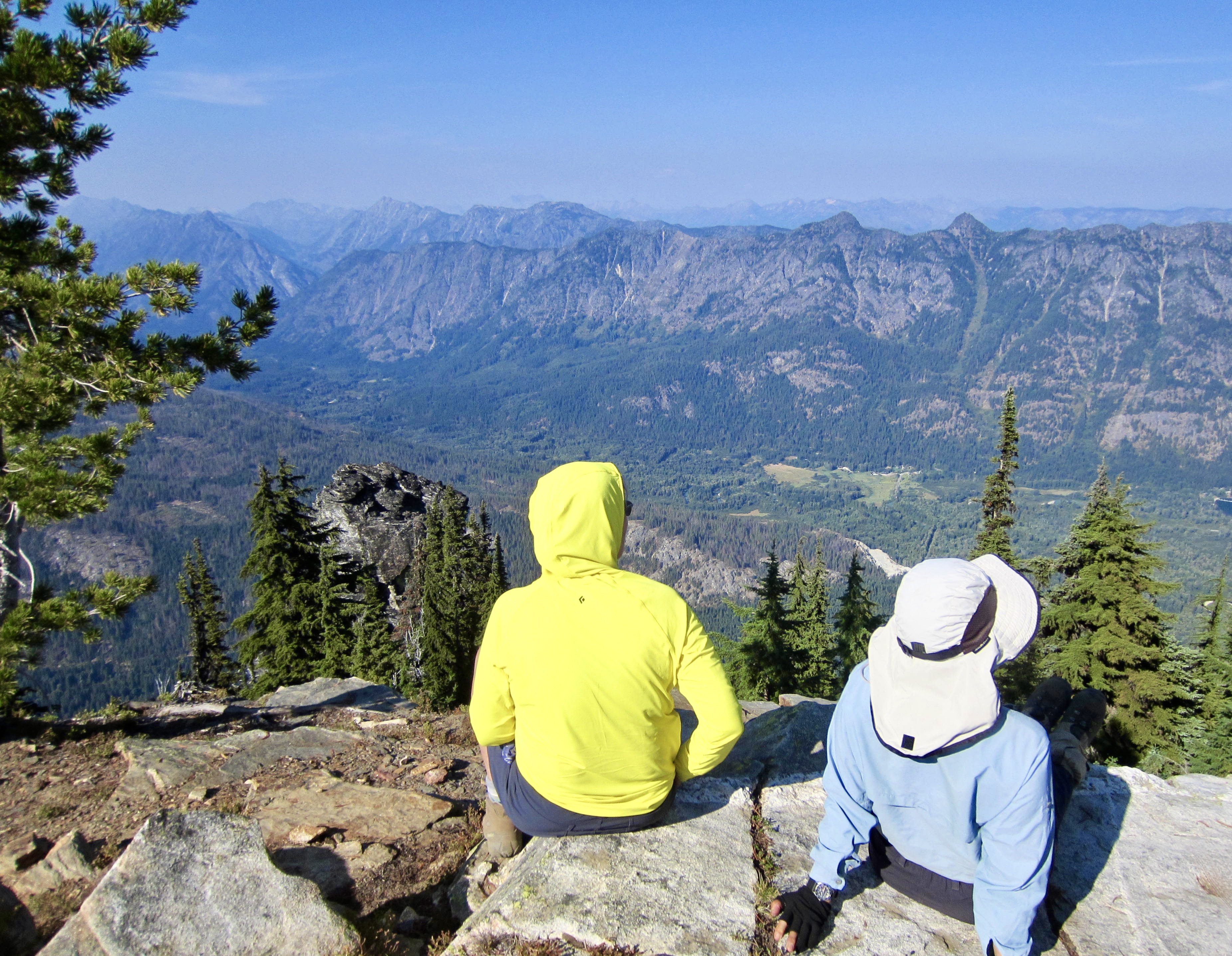 Views from the lookout were greatly limited by hazy air hanging over the mountains, but at least we could clearly see Mt. Howard and Rock Mountain along tomorrow’s route. More locally, we were intrigued by an angular tower of metamorphic rock standing just below the cabin. This tower is visible from many distant locations, including Lake Wenatchee and Highway 2.