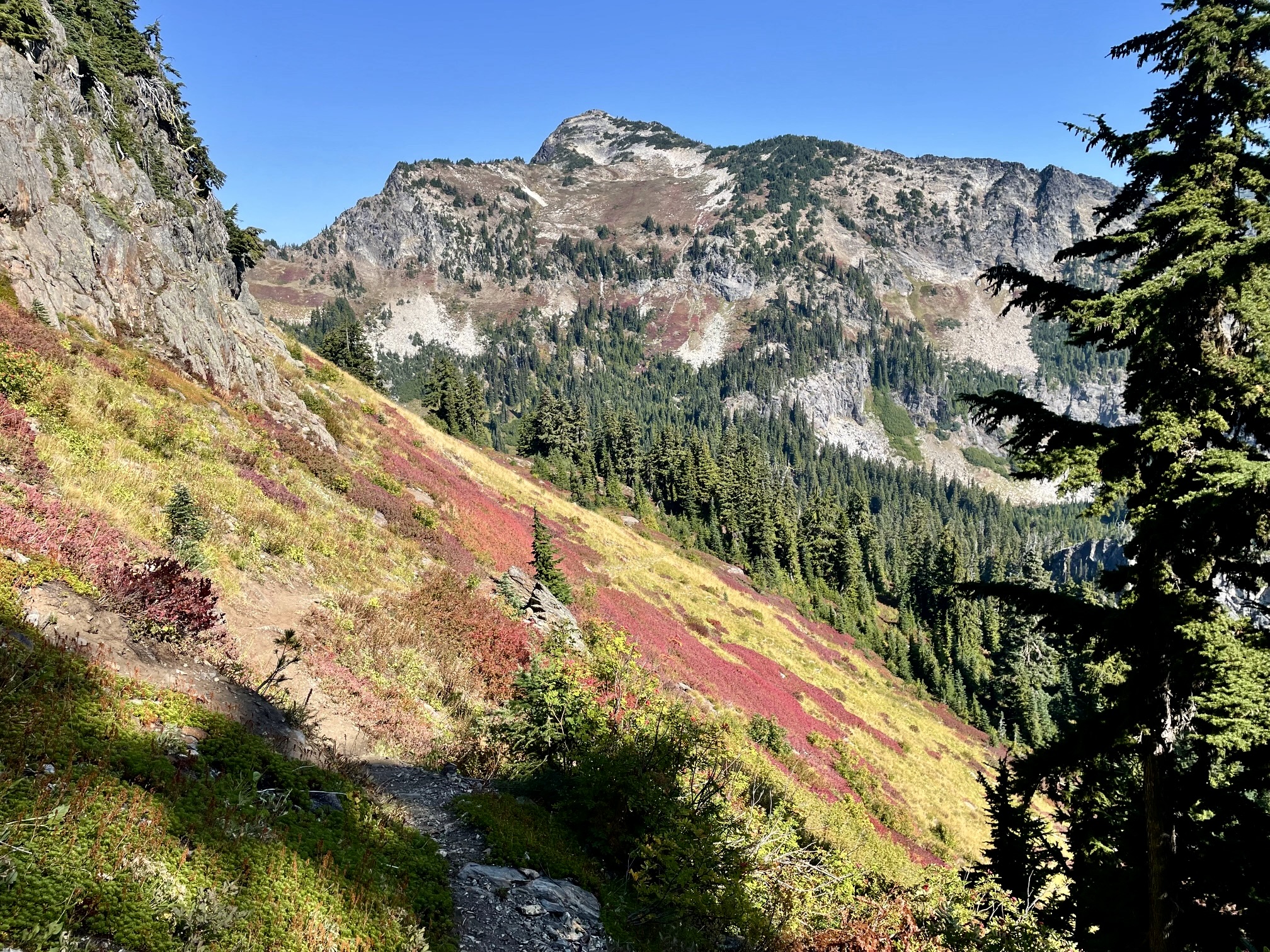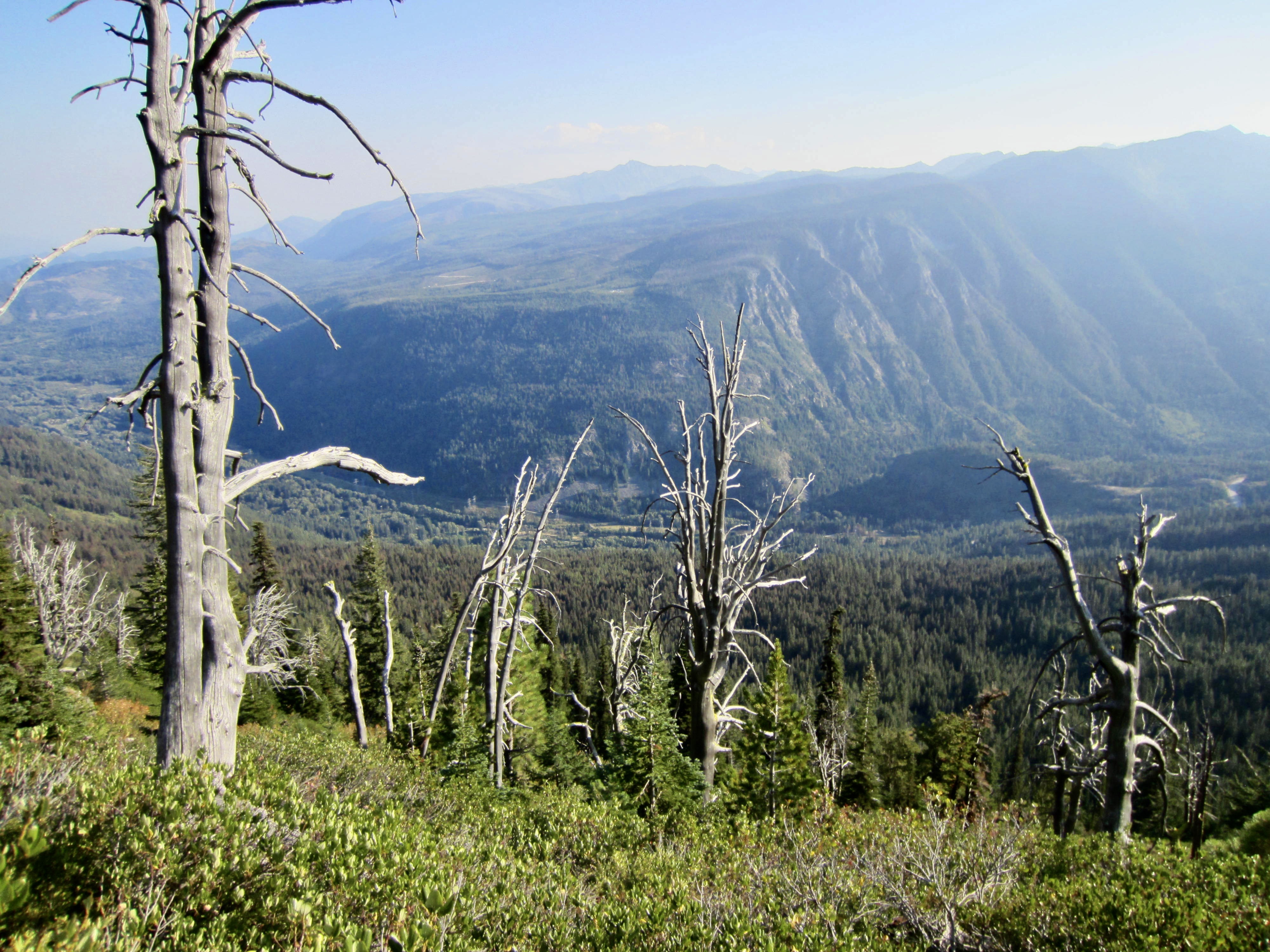 After returning to the junction, we kept hiking westward across the southern side of the crest. This part of the Nason Ridge Trail passes through an old burn and does not appear to have gotten any recent maintenance; there are large segments overgrown with dense brush and decorated with silver snags.