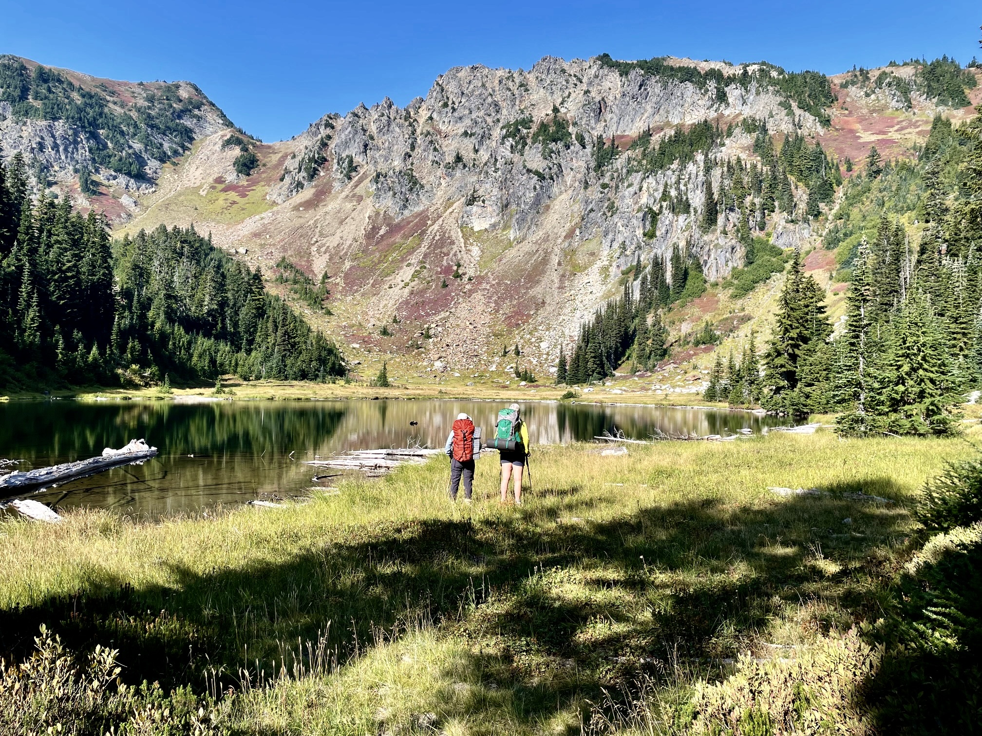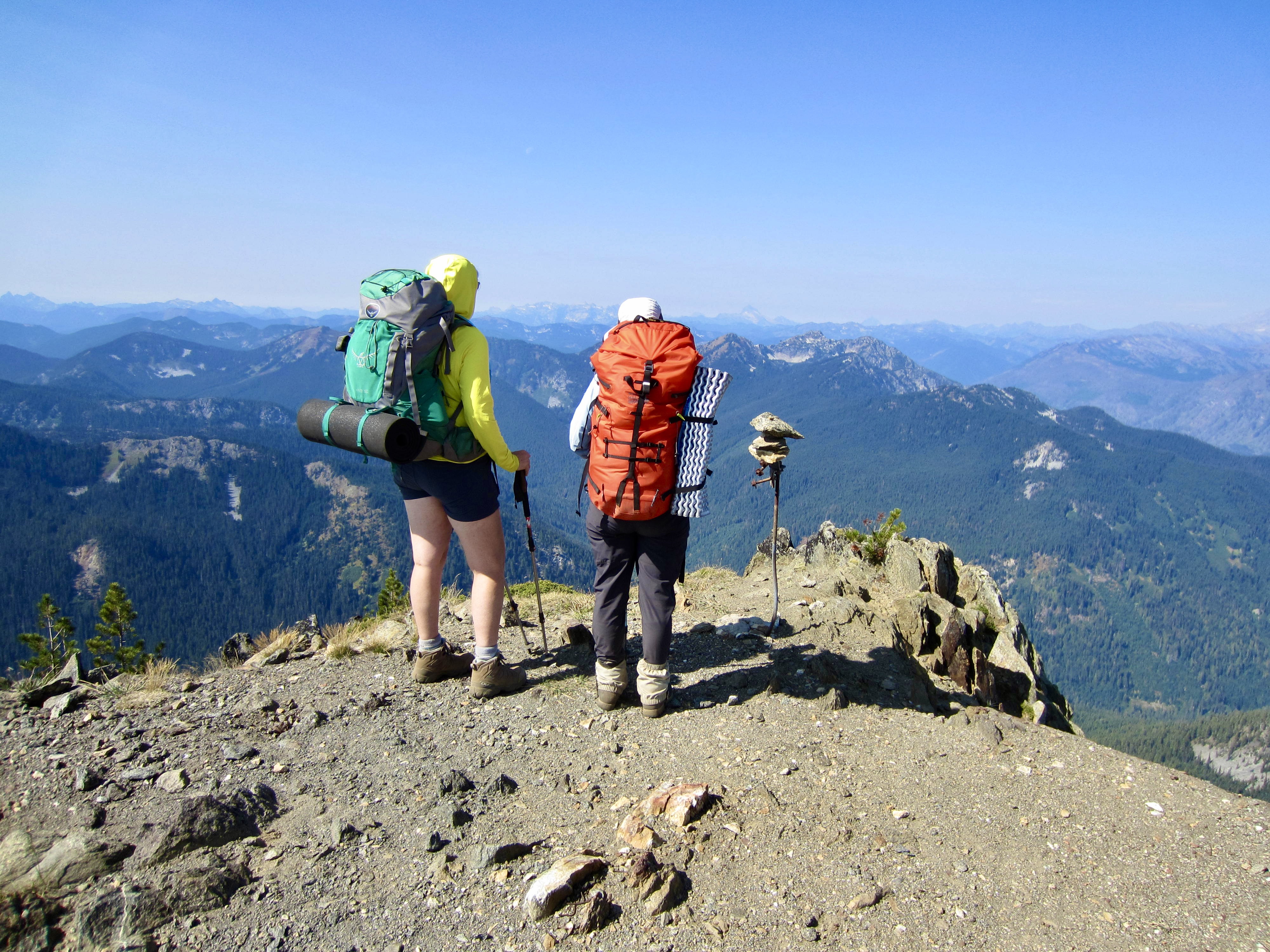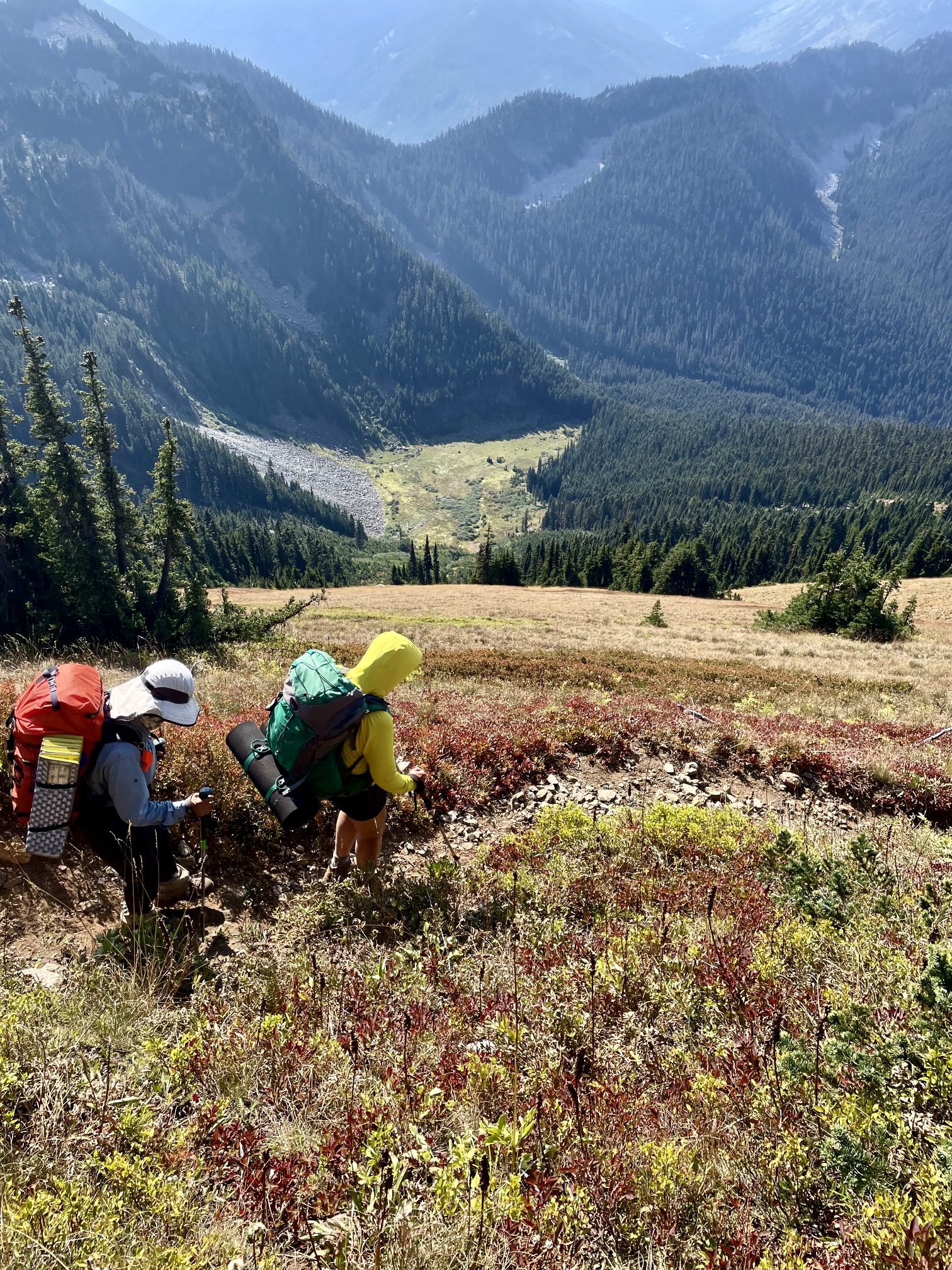We continued hiking westward on the well-constructed and well-maintained trail, which wanders up and down along the crest. One last short ascent followed by a 900-foot descent delivered to the West Nason Ridge Trailhead at Rainy Pass (12.2 hours + 12.8 miles + 4550 feet from camp), ending an excellent two-day traverse. And no, we didn’t forget to drive down the road to pick up Eileen!