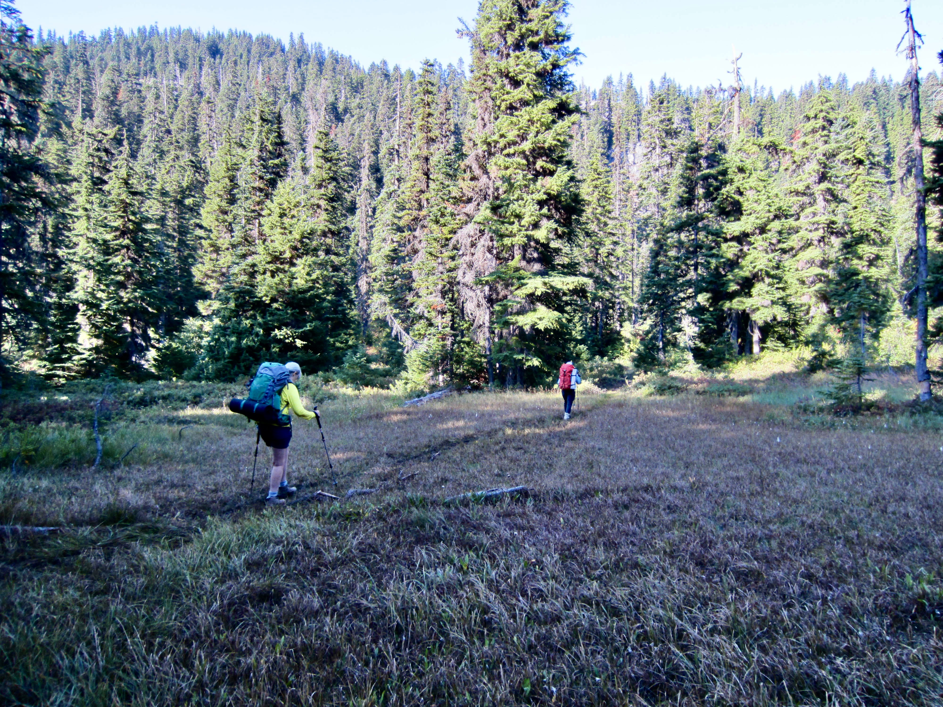 Our first way point was Royal Creek, which emanates from Canaan Lake 1000 feet above. This creek offers a reliable water source but only meager camping at best. Although the adjacent meadow initially looks like a fine campsite, it remains soggy throughout the summer and fall.