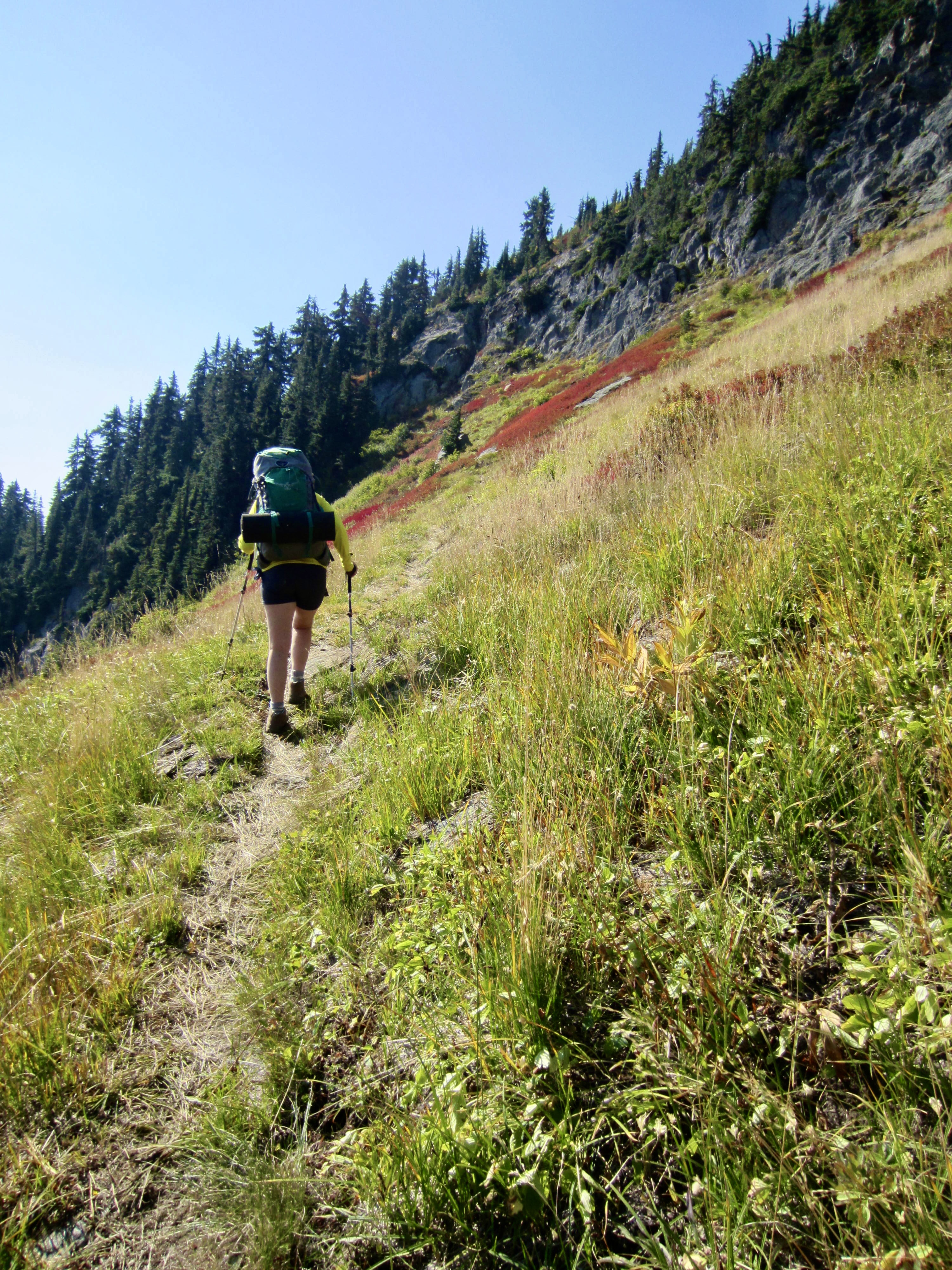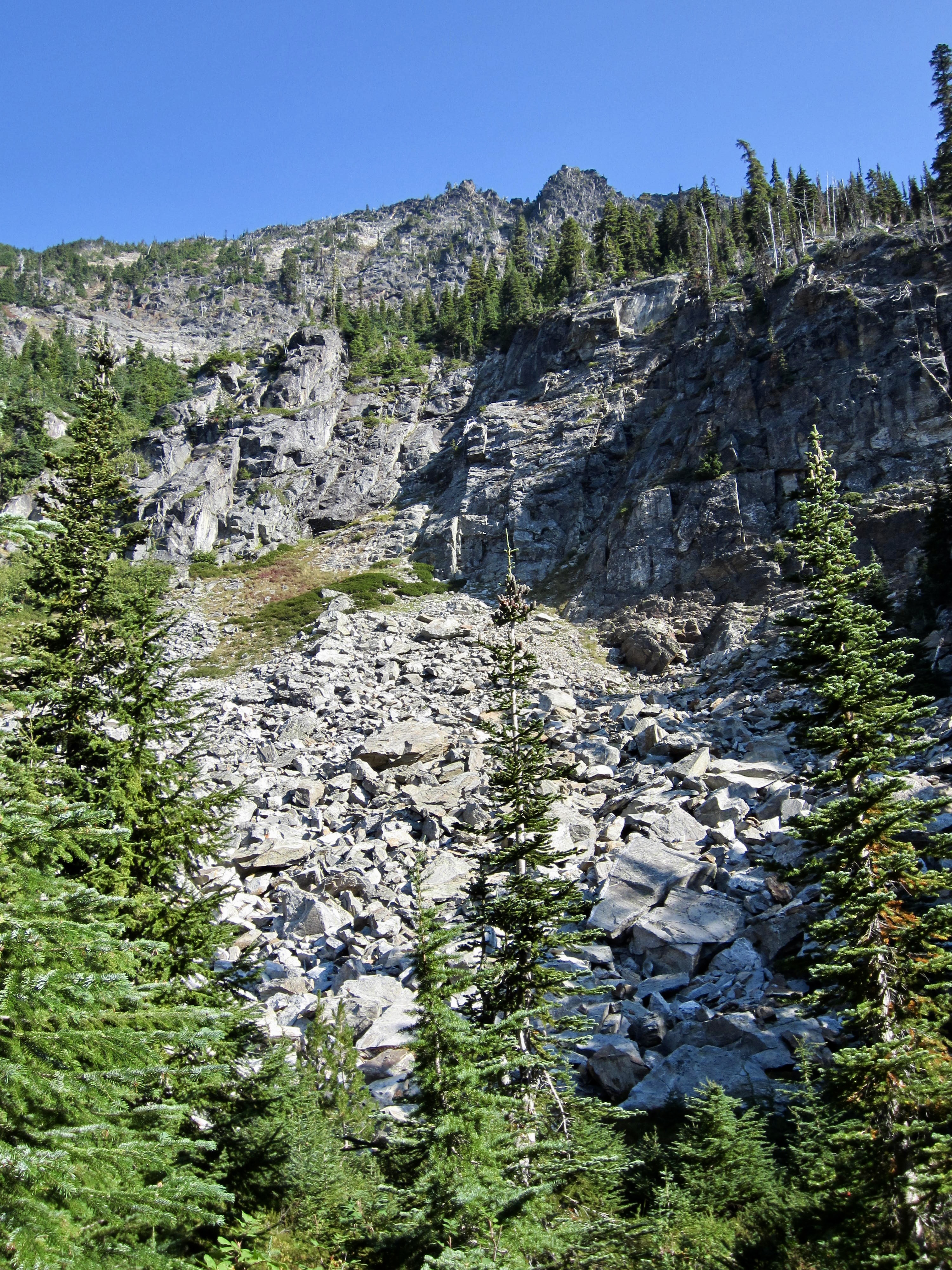 Our third ascent led us out of the lake bowl, across grassy slopes, and over the sharp crest of “Artillery Ridge,” where an ominous WSDOT sign warns hikers about avalanche-control artillery strikes here. The trail then contoured a barren slope over to the large bowl holding Rock Lake.