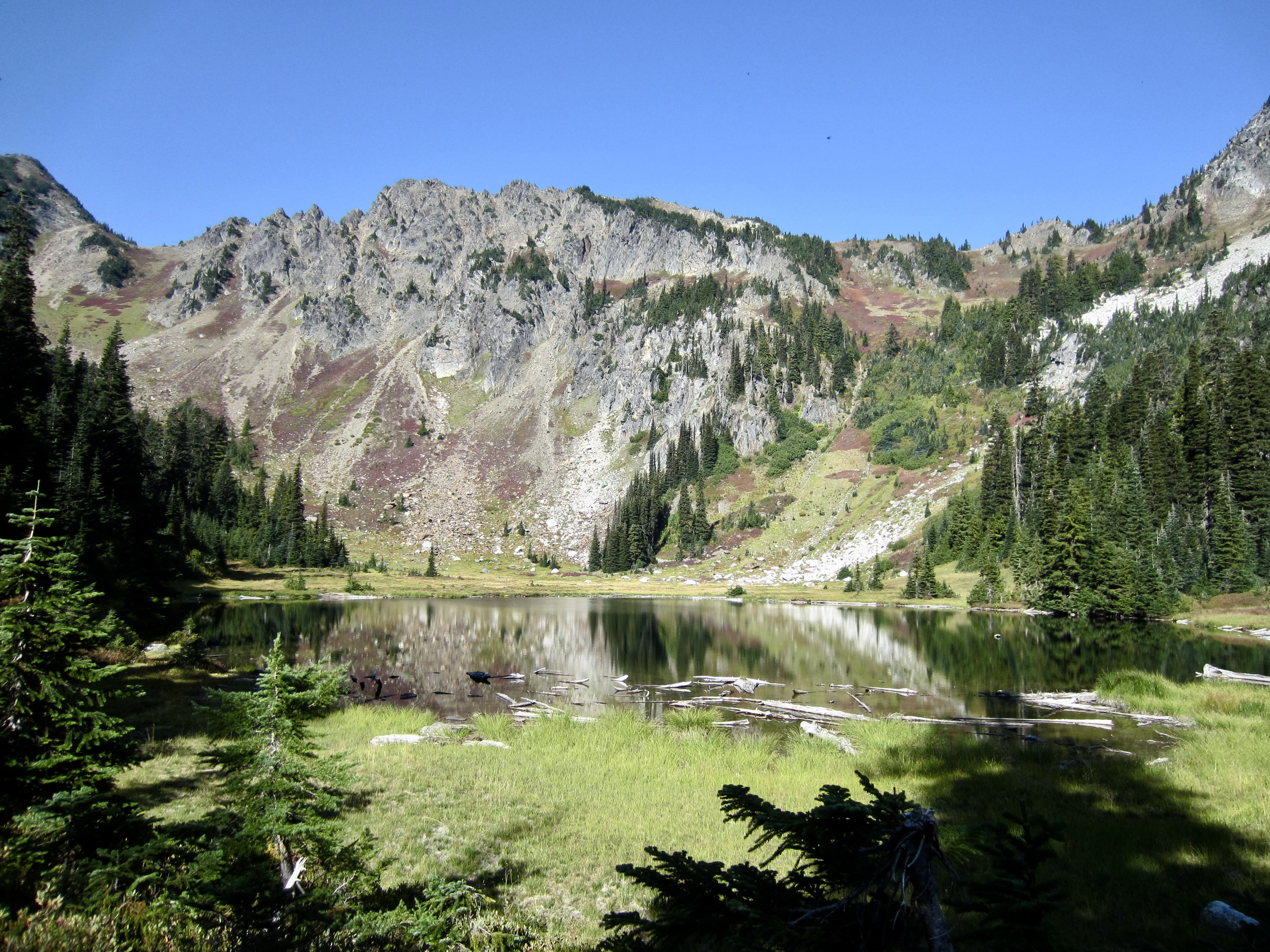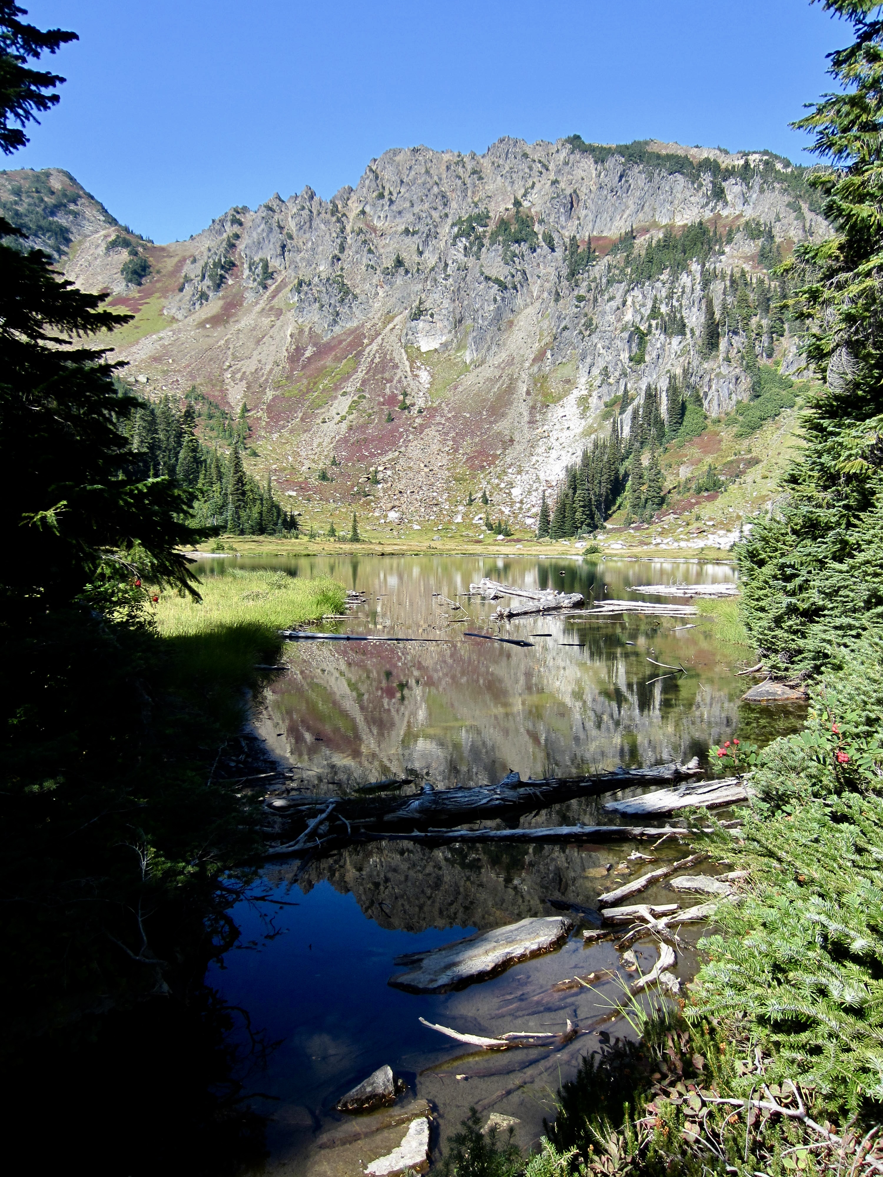 The Nason Ridge Trail swings around the head of Rock Lake, thereby providing a splendid view of this beautiful alpine pool. We refilled our water bottles from the barely flowing inlet stream (Schilling Creek) before continuing on.