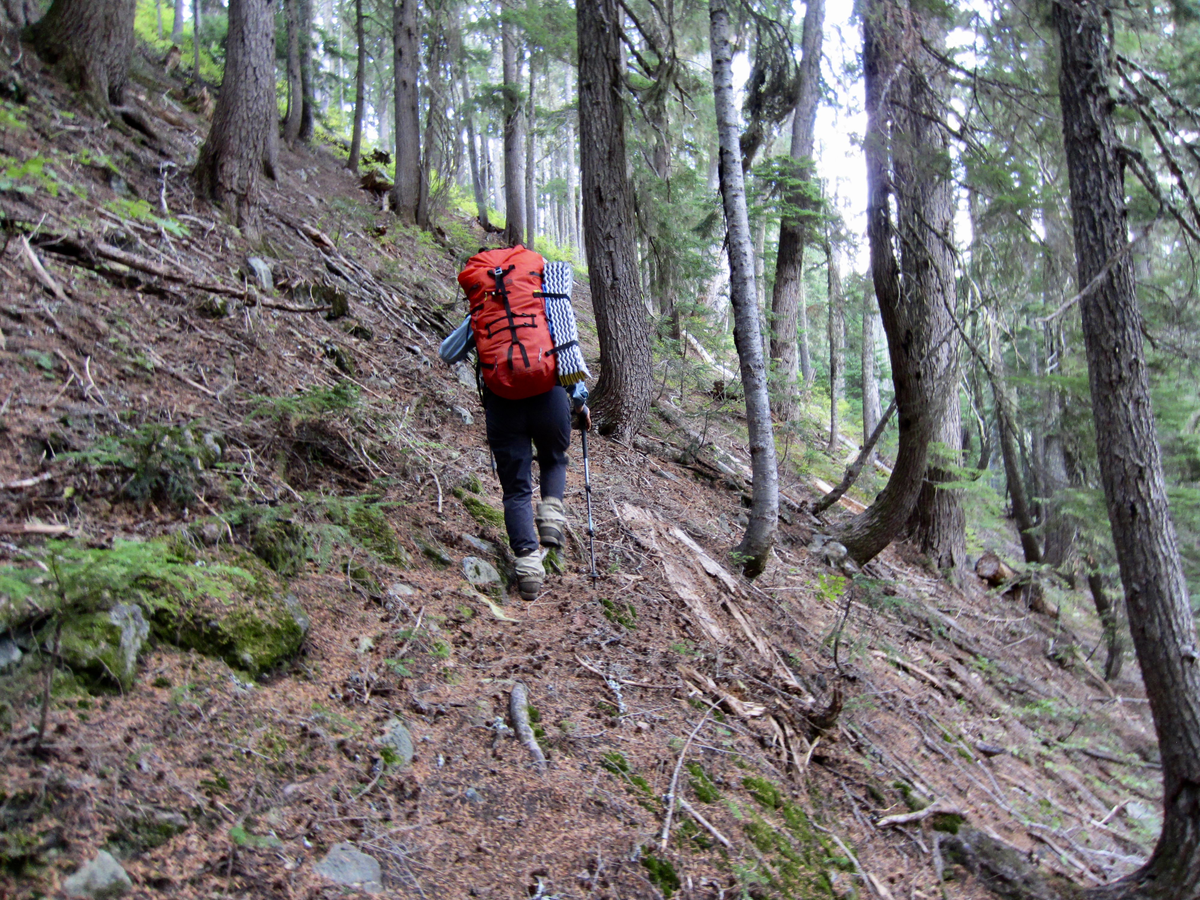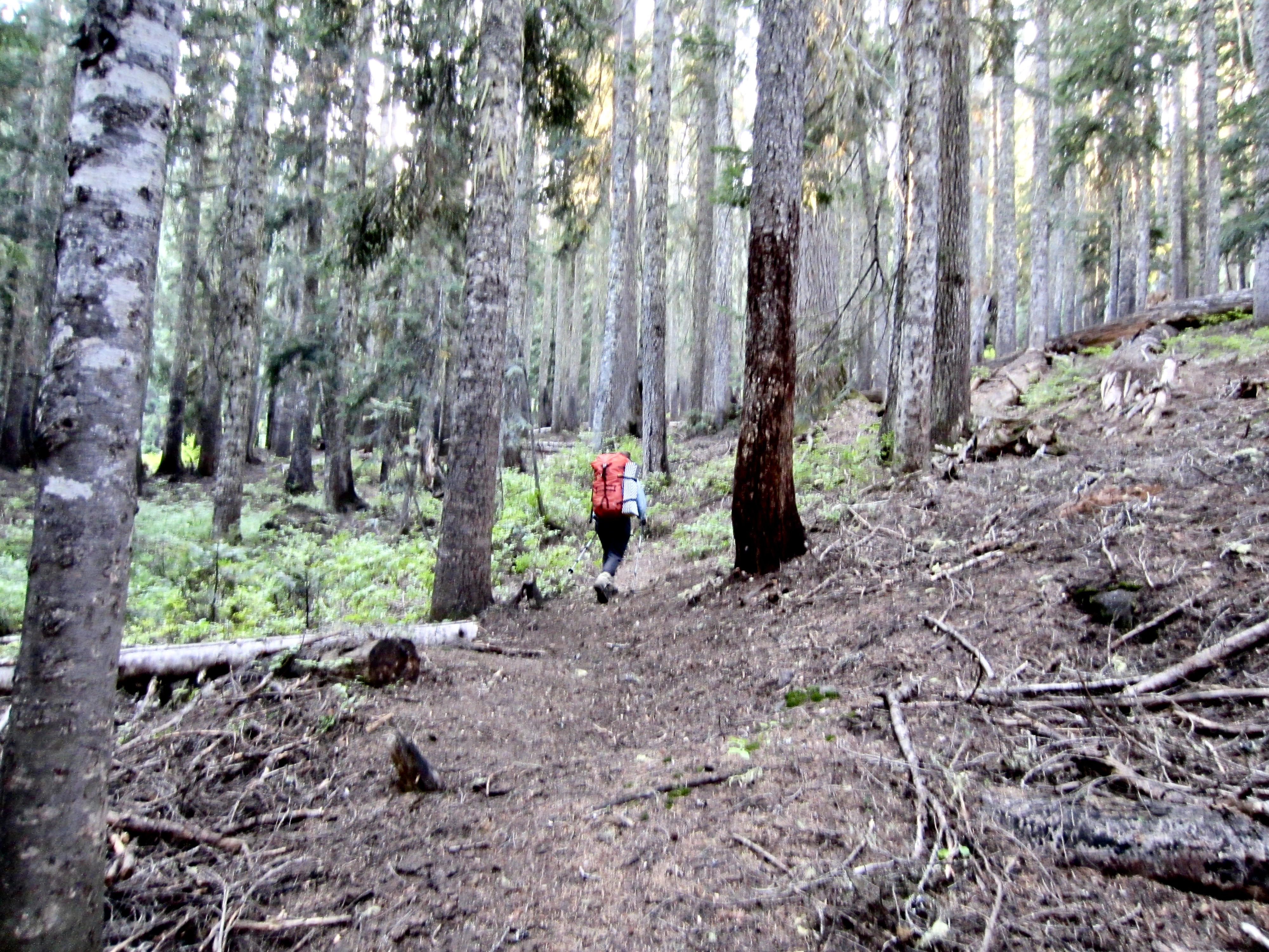 Our fears that this seldom-traveled western extension might be impassable proved to be unfounded. The trail is somewhat faint but easy enough to follow, and there are numerous cut logs—both old and recent—along the way. No trail bed has been cut into the regolith, indicating that this segment is just a boot-beaten path and not a constructed trail.