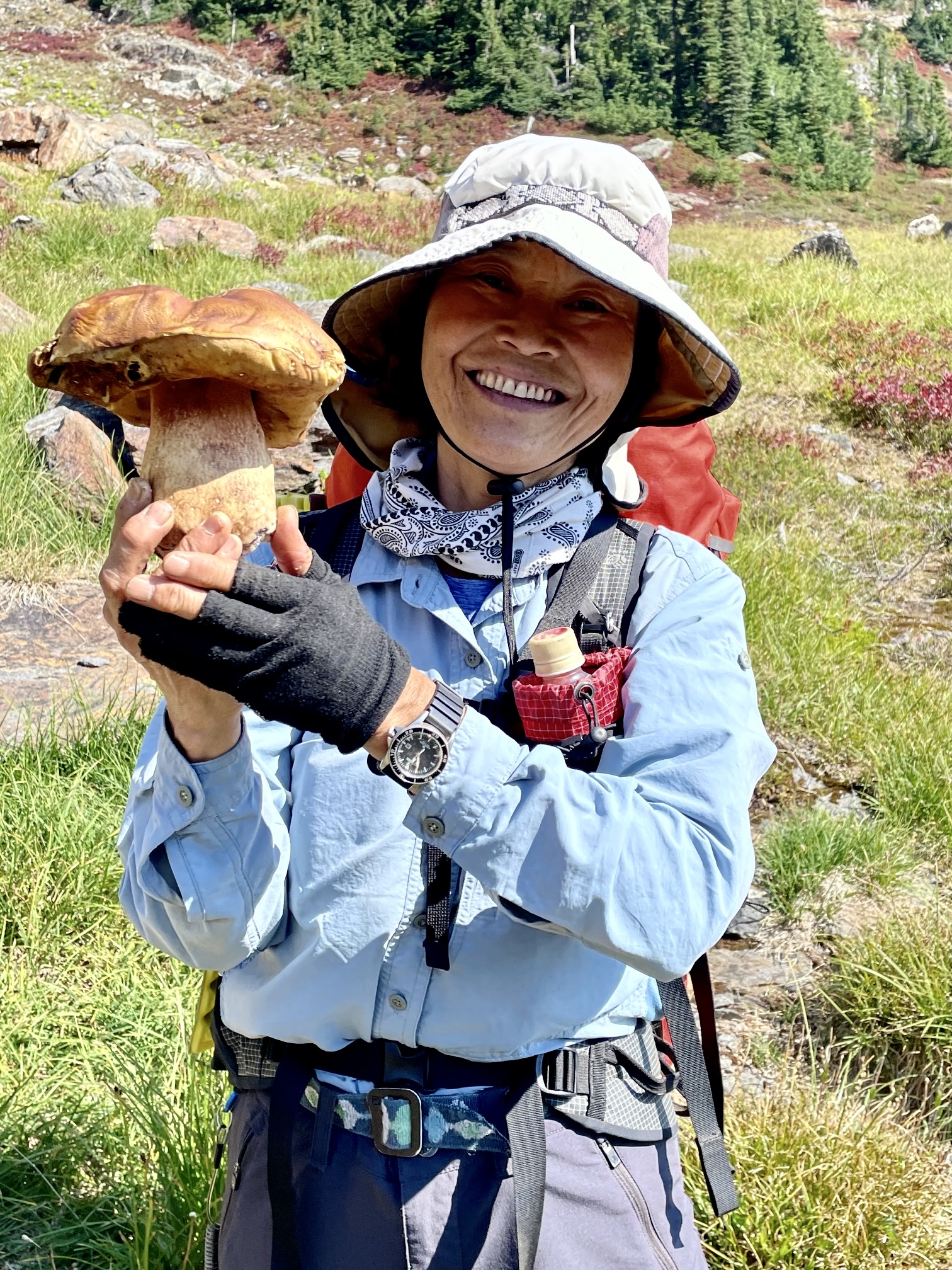 From the saddle, we plunged down a vast, grassy hillslope to reach the lush meadows of Snowy Creek Basin. We had now crossed onto the northern side of Nason Ridge, and Yoko was thrilled at the variety of mushrooms erupting from the ground or clinging to trees. She emerged from the forest proudly holding a large specimen and wearing a huge grin!
