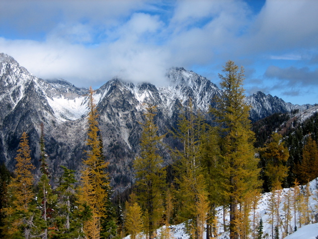 Granite peaks of the Stuart Range rise into swirling clouds above golden larch trees