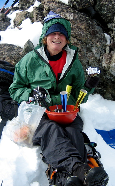 On Saturday, Kathleen, Karen, and I joined Beth for a hike up Navaho Peak to celebrate her annual “39th birthday.” The Teanaway supplied golden larches and sunny weather, while Karen supplied cupcakes and party favors. Beth was radiant all day long and, quite honestly, didn’t look a day over 29!