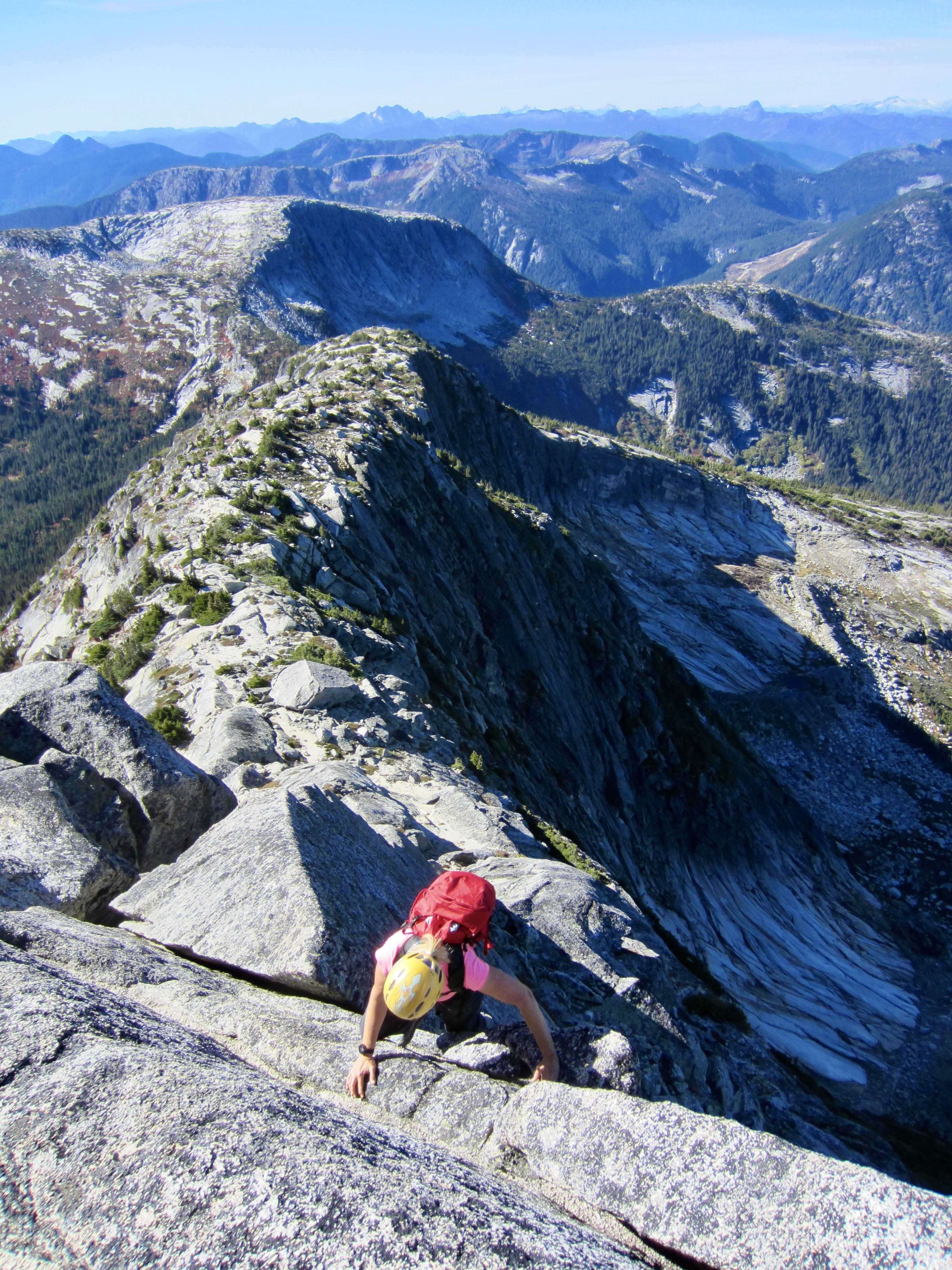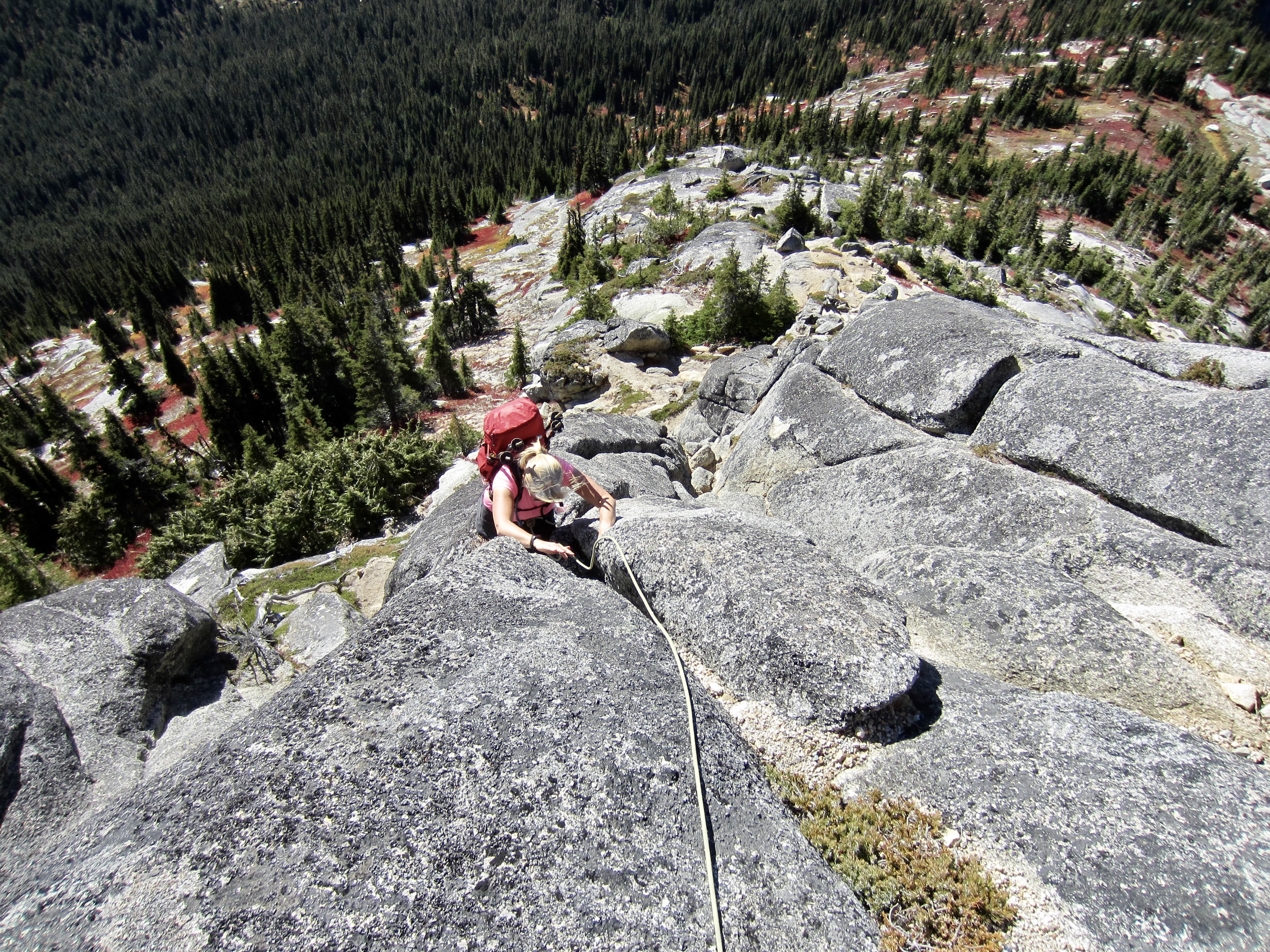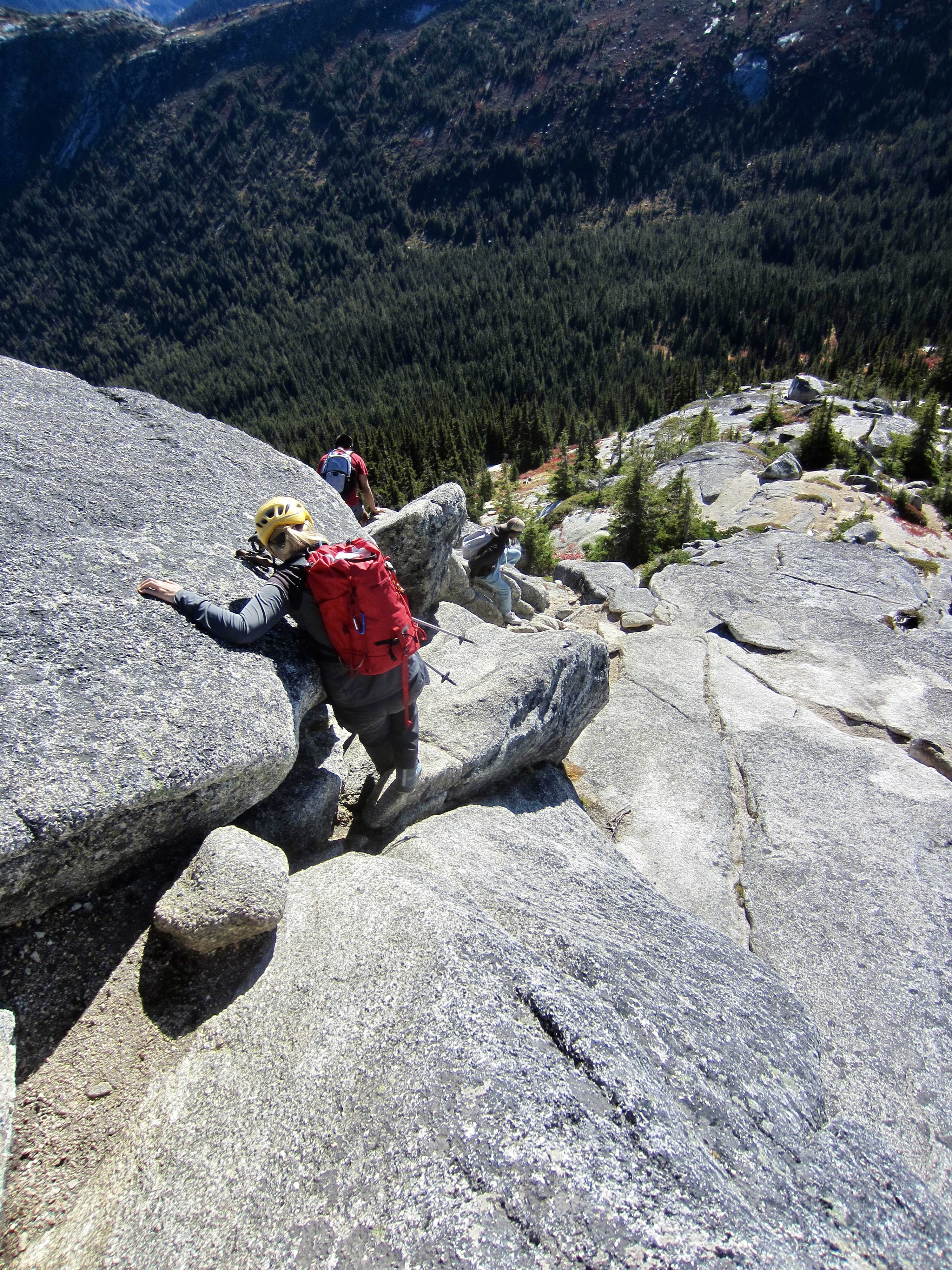 Shortly beyond the junction, our trail became a rough climber’s path that ends at a rocky nose. Scrambling up this nose, we quickly found ourselves on moderately exposed Class 4 terrain that prompted the use of a handline. (It was later discovered that we were slightly off route; there is a reasonable Class 3 crack/ramp just left of our up-route.)