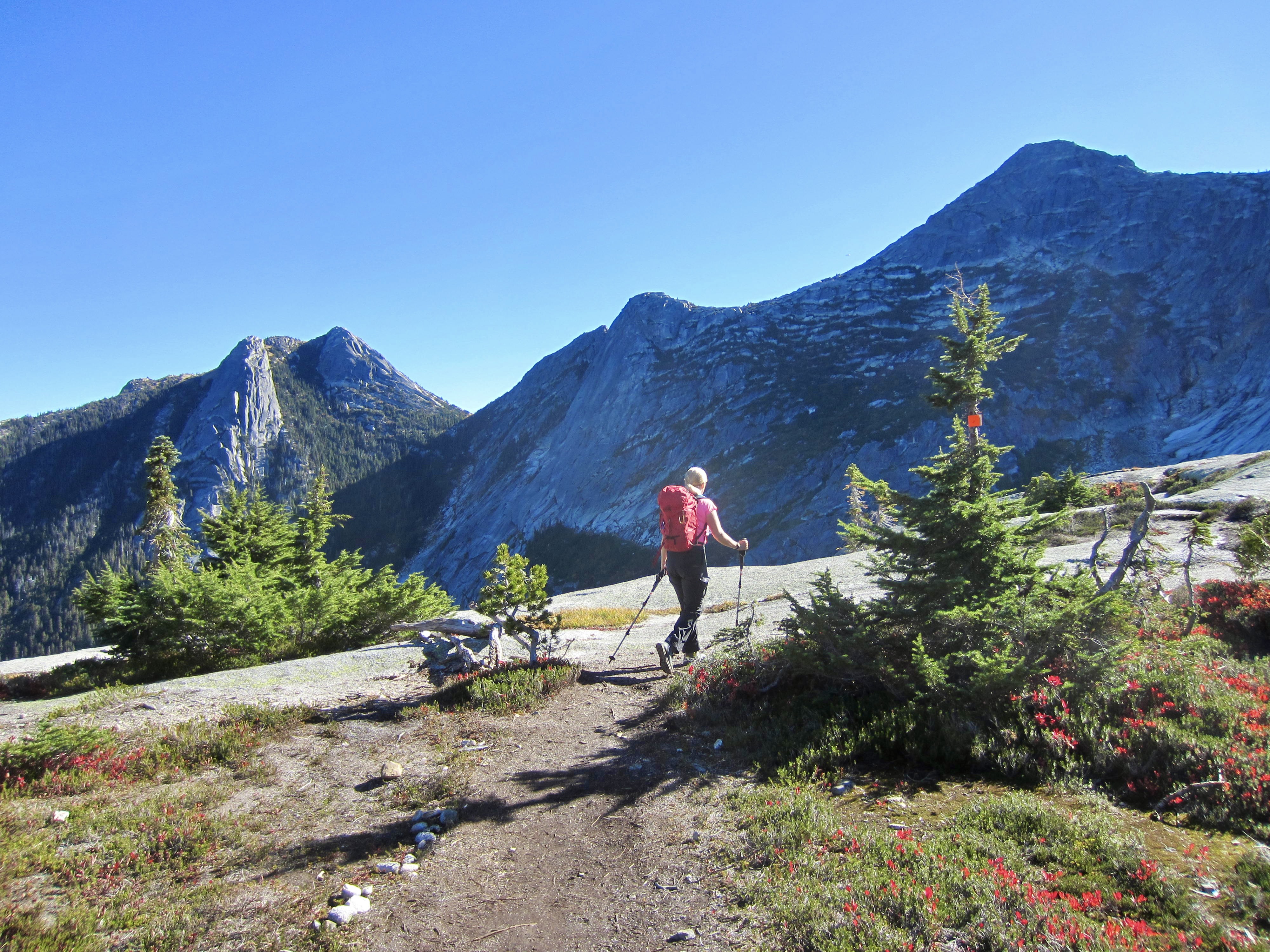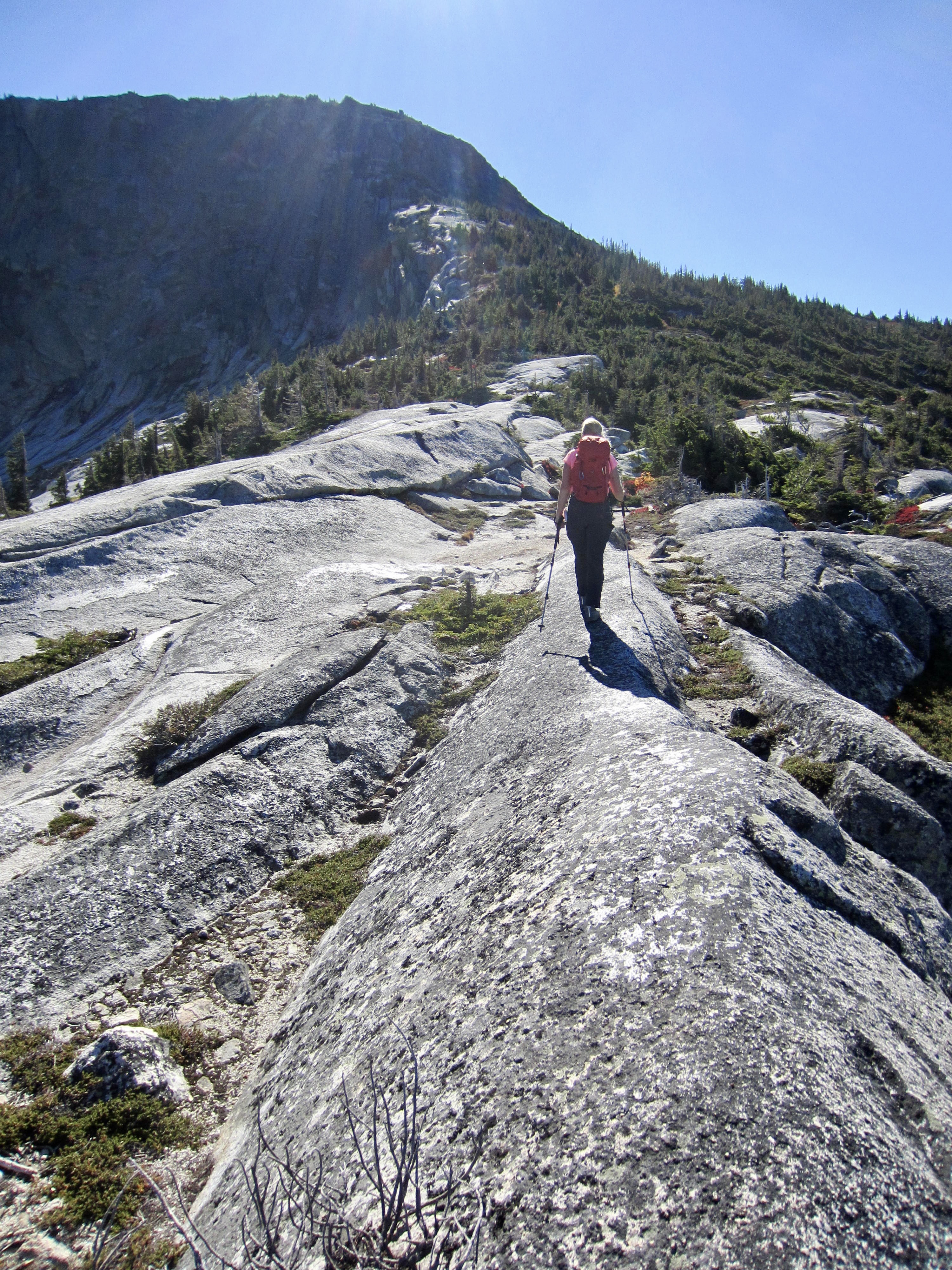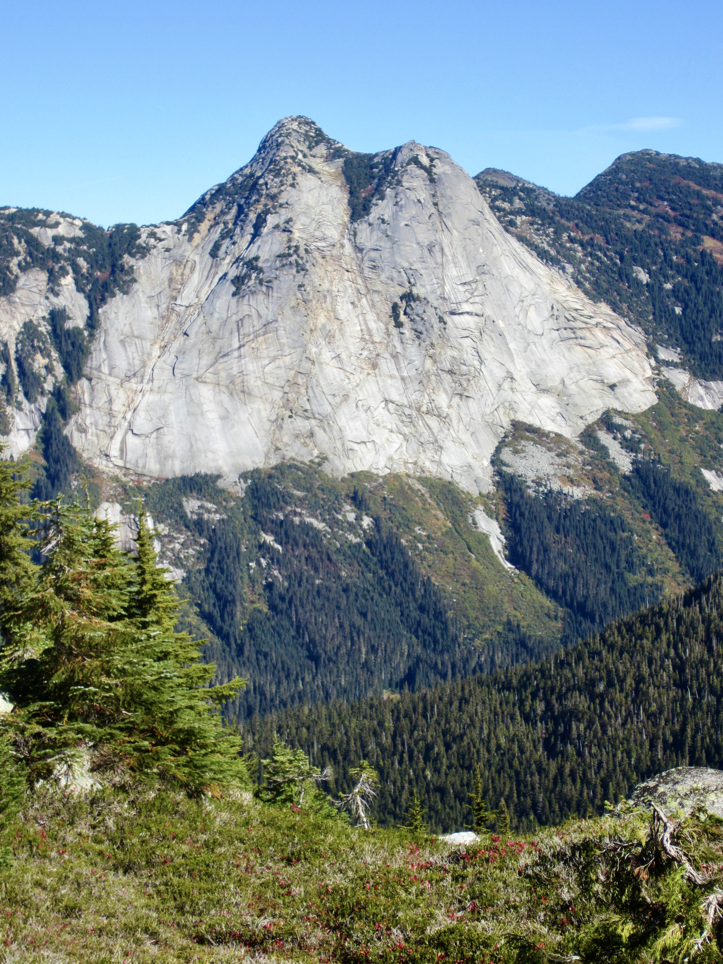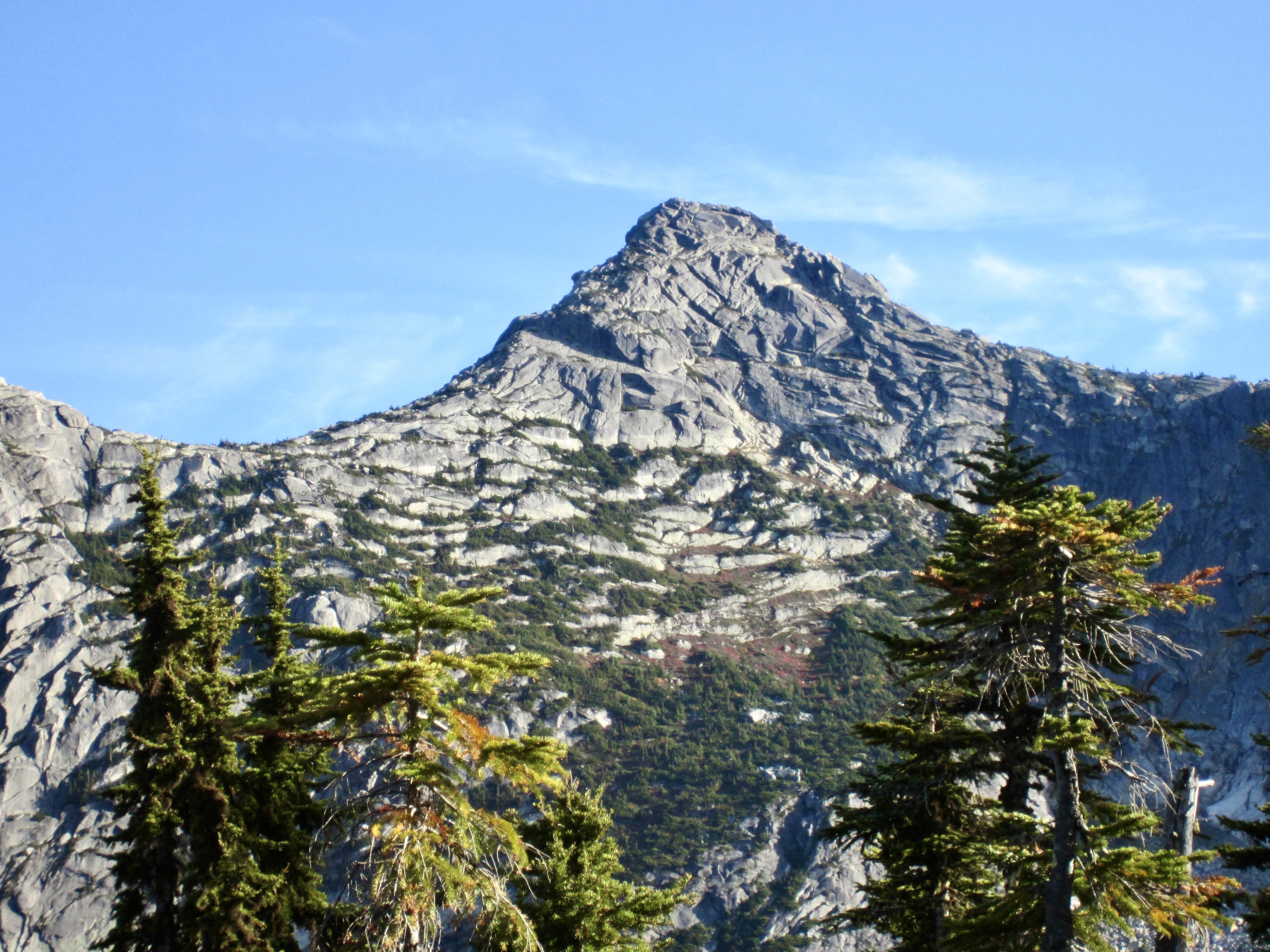 We hiked up the well-traveled trail through the construction zone and then up a steep, muddy forest slope, eventually gaining the shoulder of Needle Peak’s northwest arm. Yak Peak, with its sweeping granite apron, is particularly impressive from this vantage.