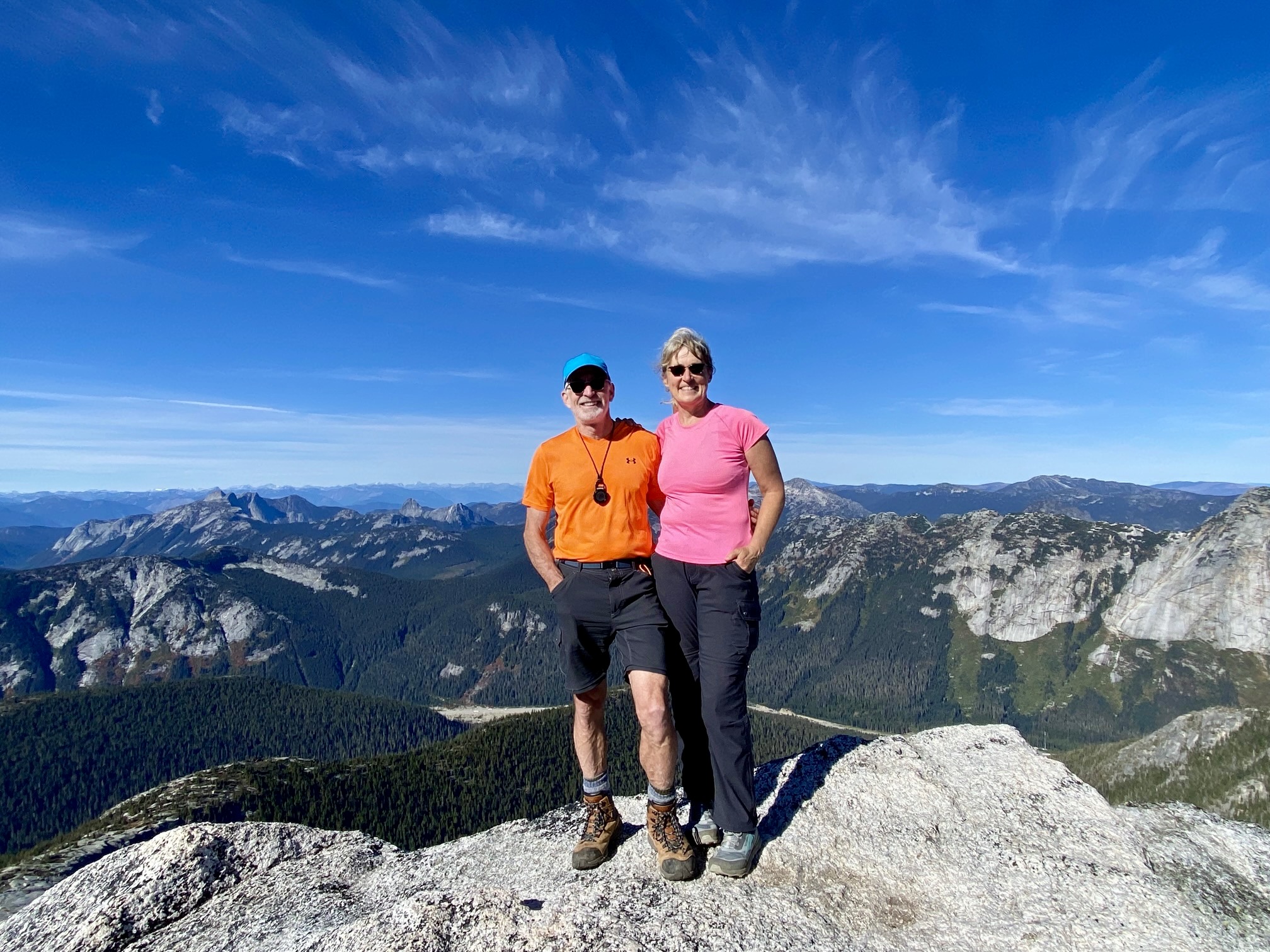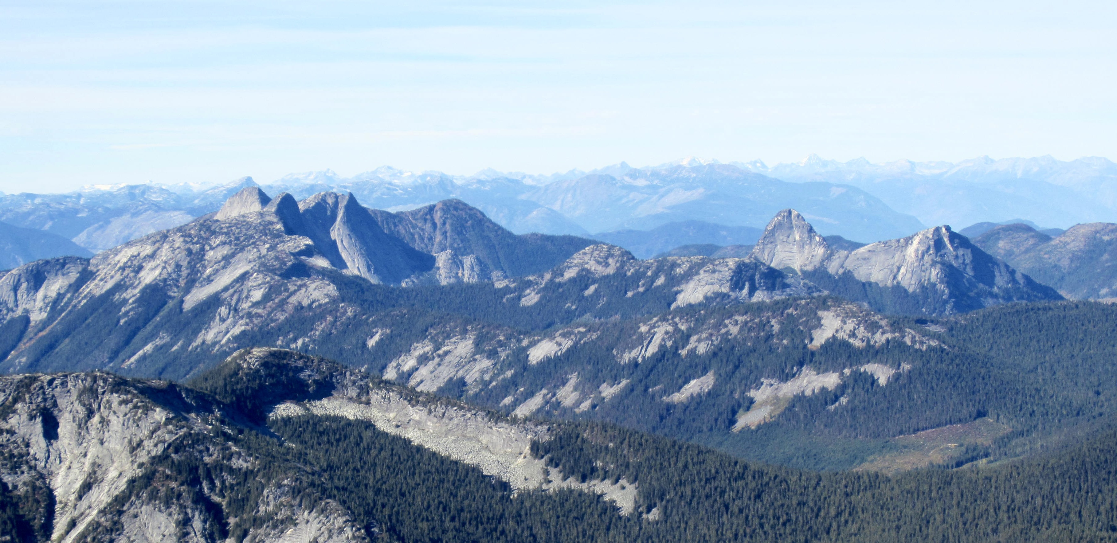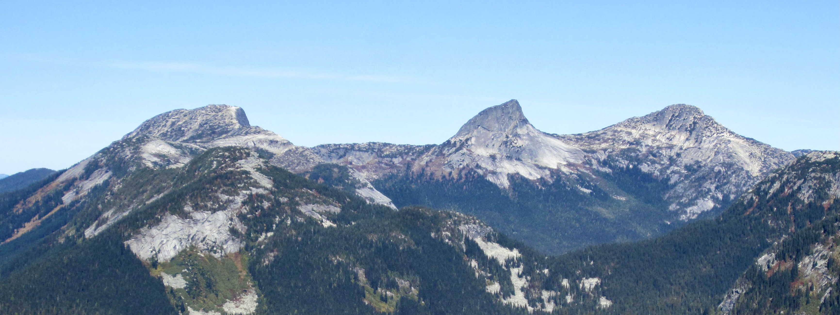 Eileen and I stepped onto the summit at 2:00pm (4.0 hours + 2900 feet from TH), closely behind the other climbers. We spent some time studying our surroundings and trying to identify the other Coquihalla peaks—all of which were familiar to us in name only. Farther to the south were the very familiar peaks located near Chilliwack and the international border.