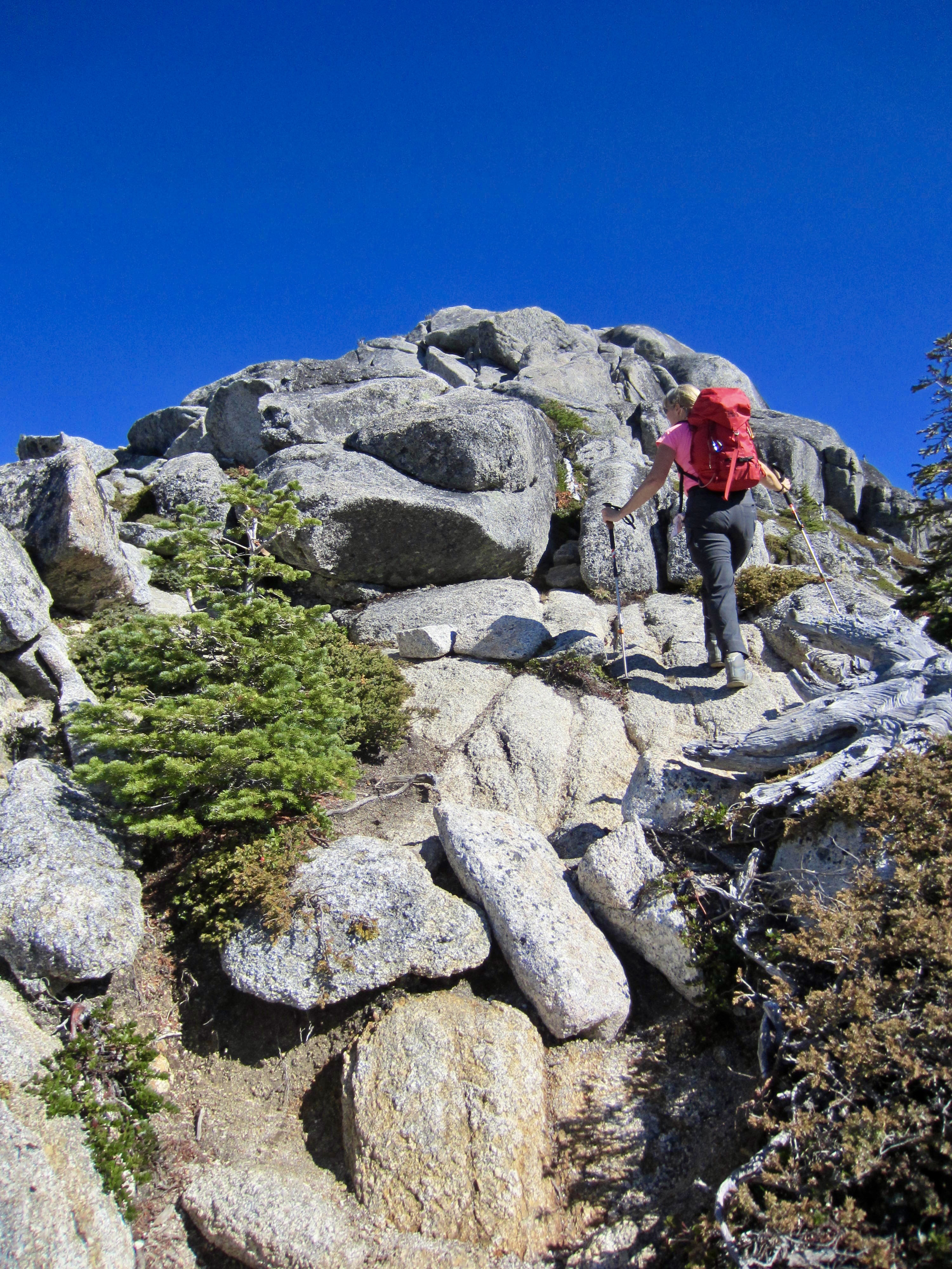 More pleasant hiking and easy scrambling took us along the ridge crest, weaving around granite outcrops and across grassy benches. We soon arrived at the base of the summit block. There was no obvious route ahead, so we tried scrambling directly up the west face but got stymied by a steep wall. Fortunately, a faster pair of hikers overtook us at this time, and one of them knew from a previous ascent that the easiest route is farther around to the right (south).