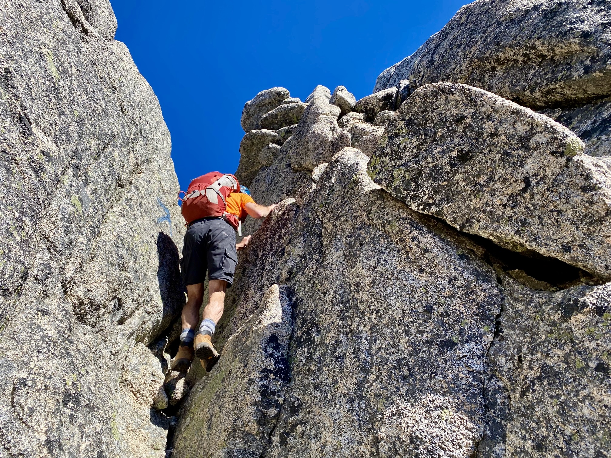 We followed the other pair up a narrow dihedral and then over several blocky steps. The coarsely crystalline rock was solid and grippy, the scrambling was easy and fun, and the exposure was never too serious. Along the way, I noticed numerous blue arrows painted on the rock, presumably marking the easiest route. Now greatly faded with age, these arrows require a watchful eye.