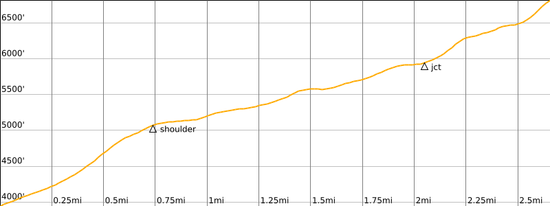 Approximate Stats: 5.4 miles traveled; 2950 feet gained & lost; 4.0 hours up; 2.5 hours down.