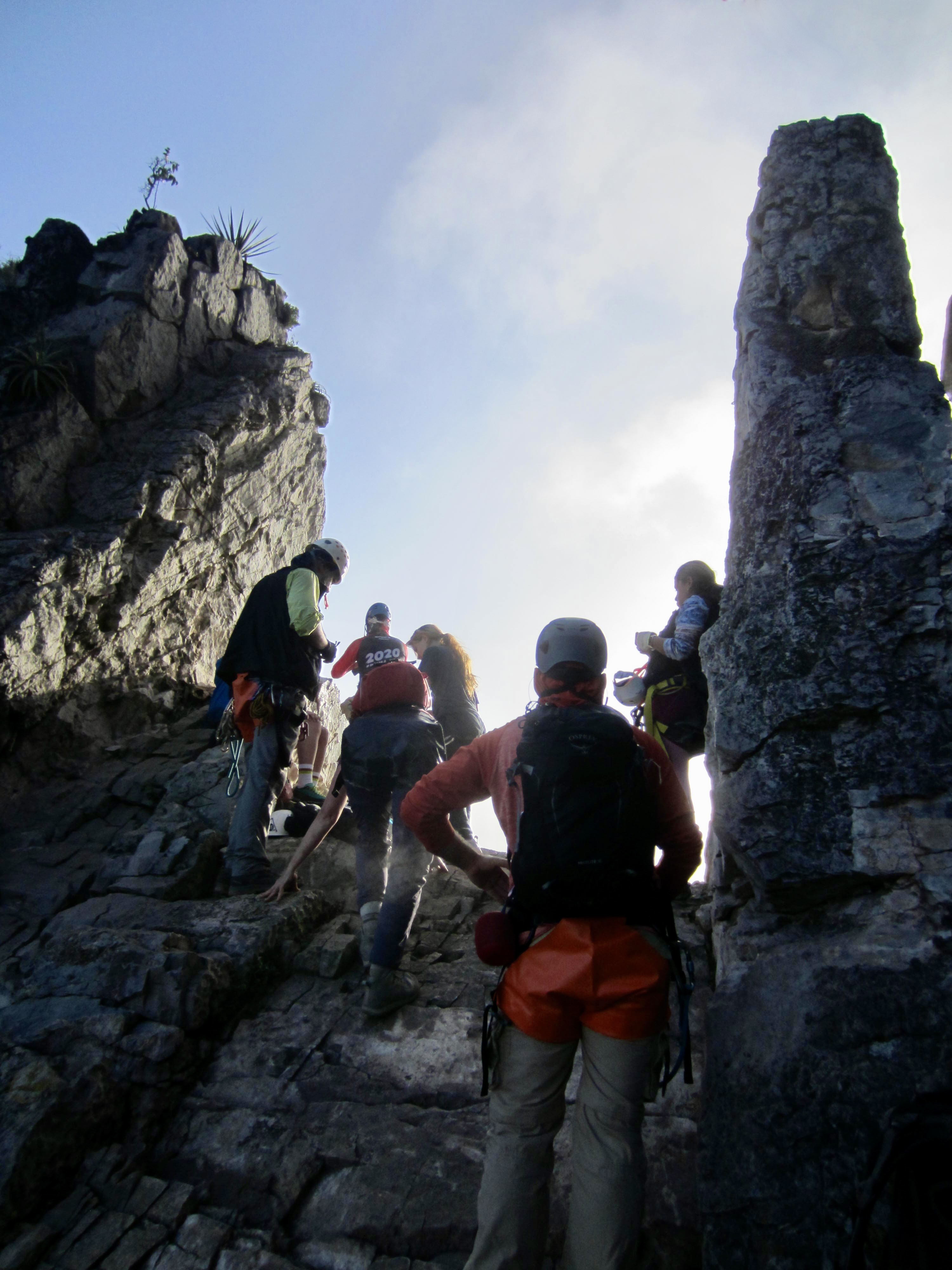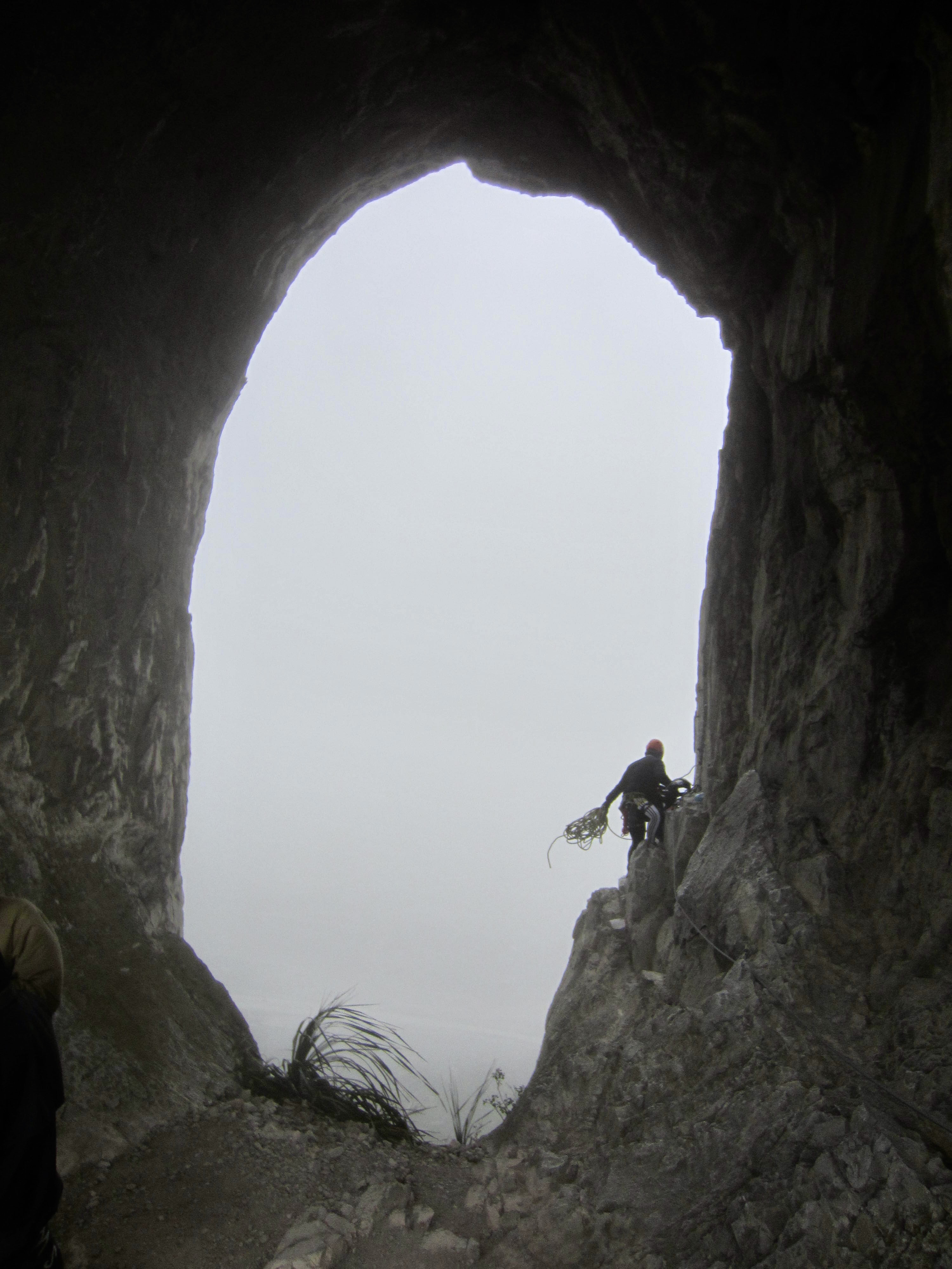 I was amazed to discover that our rappel had delivered us to the mouth of a short, cylindrical tunnel. We were now in the Eagles’ Nest! This remarkable natural opening extends completely through the narrow ridge and serves as a window onto the city below. It also serves as a wind tunnel, which instantly sent us rummaging in our rucksacks for warm clothing.