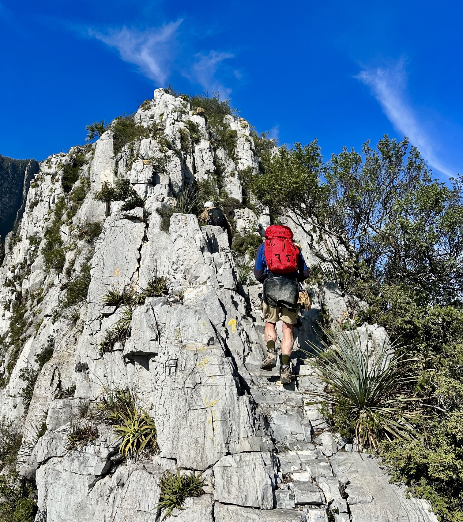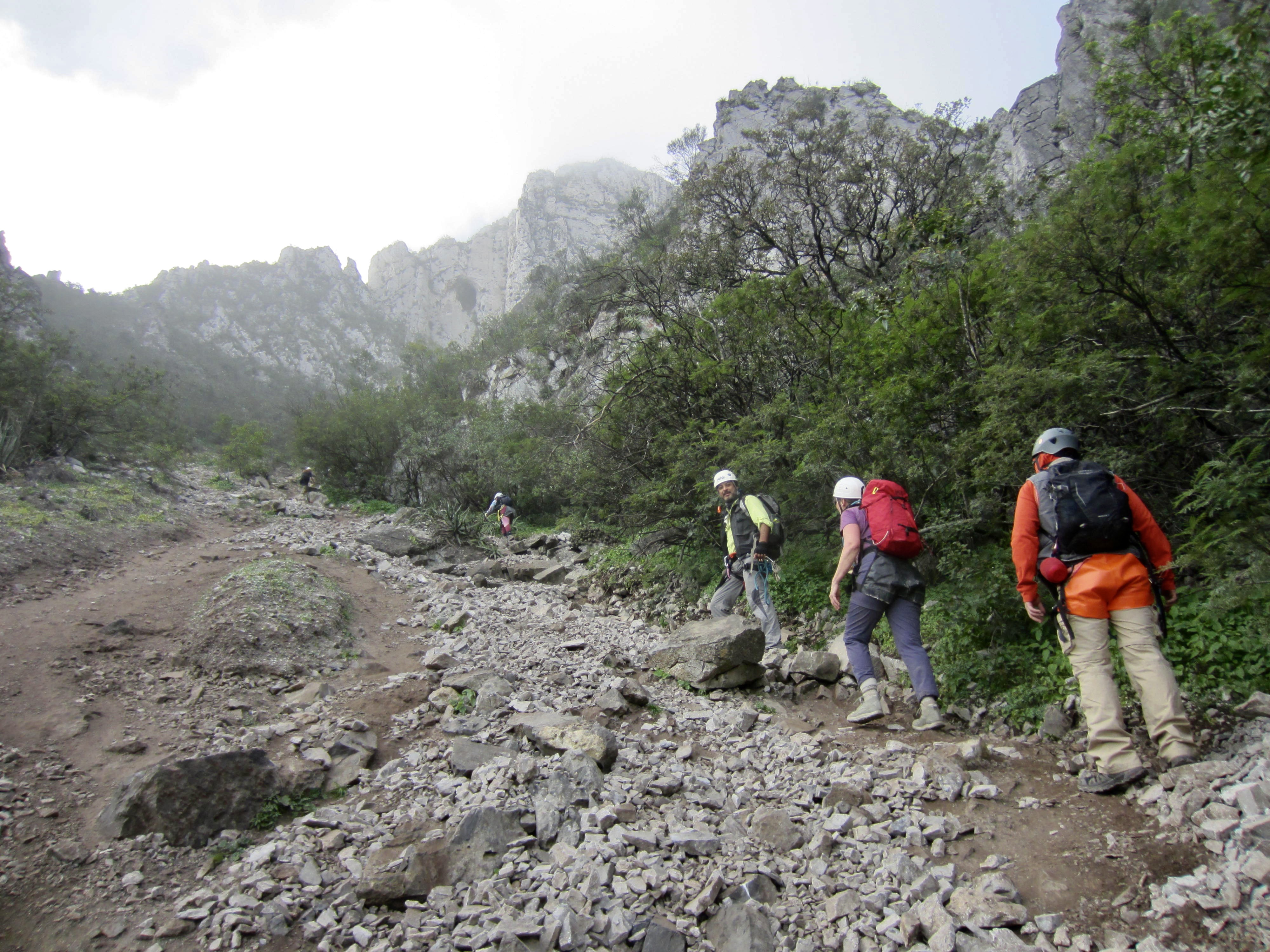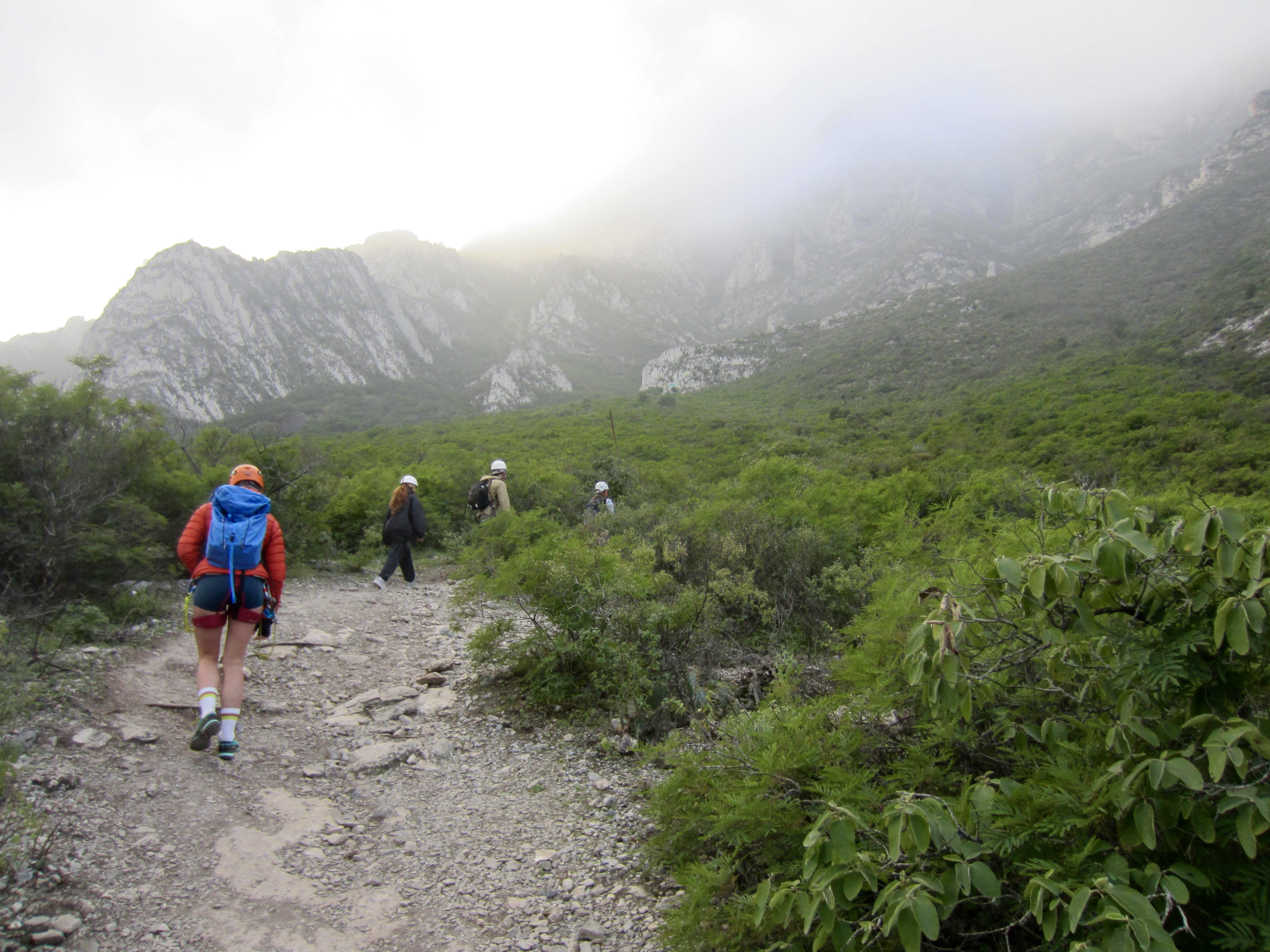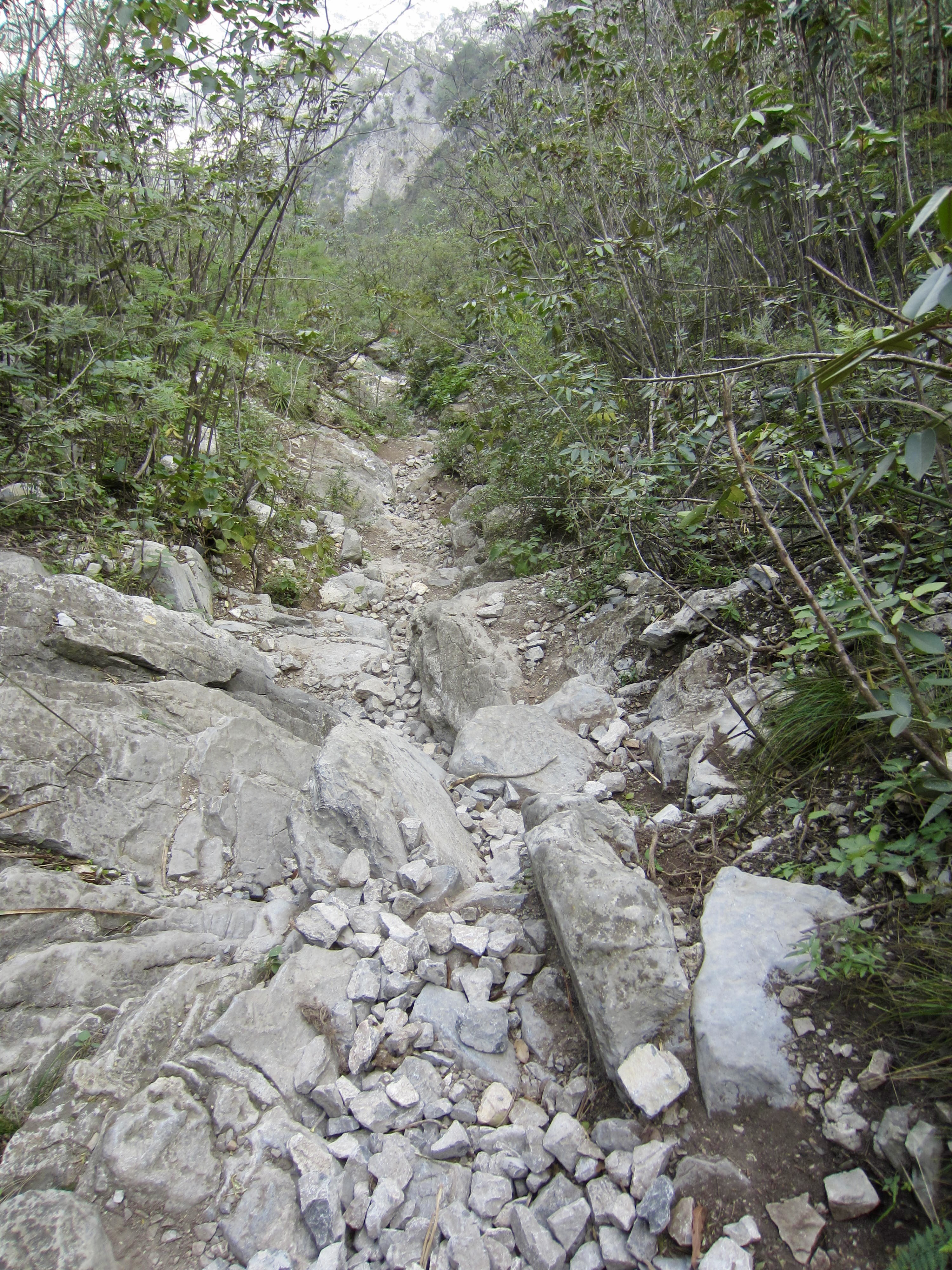 Our trek started at a nondescript pullout adjacent to Saltillo–Monterrey Tollway 40D, directly beneath a rugged limestone ridge on the northern fringe of Cumbres de Monterrey National Park. We walked through an underpass and began hiking up the bushy hillslope on a well-travelled and nicely graded trail. It was comfortably cool on this overcast Monday morning.