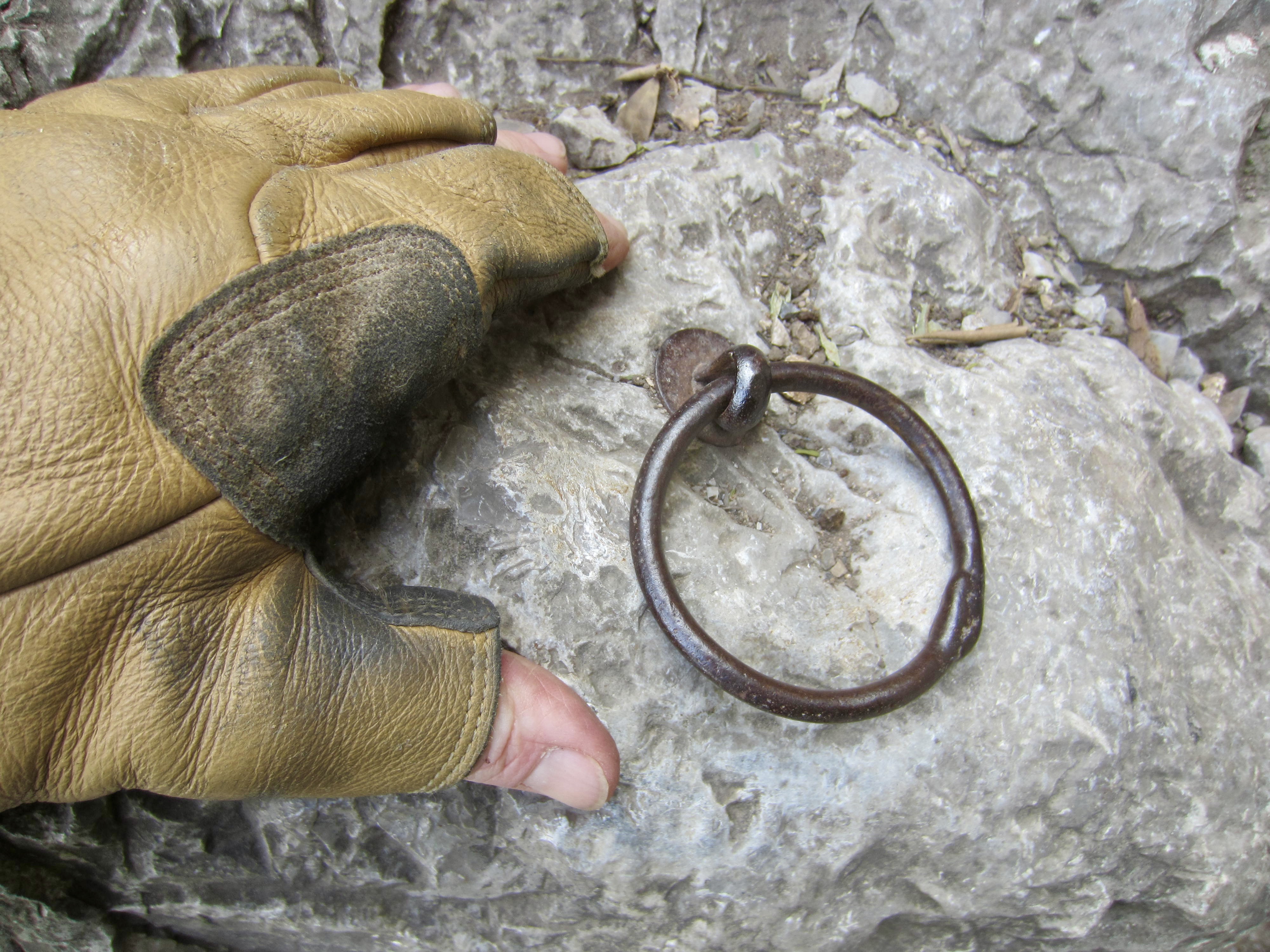 When everyone finished rappelling down the vertical face, we scrambled down a gully for a short distance and then performed one final rappel. This last rappel took us farther down the same gully and through a vertical chimney. Some minor rockfall here made us glad to be wearing helmets! I was also intrigued by the dozen or so iron ring bolts visible in the rock, reportedly installed by first-ascent climbers circa 1950.