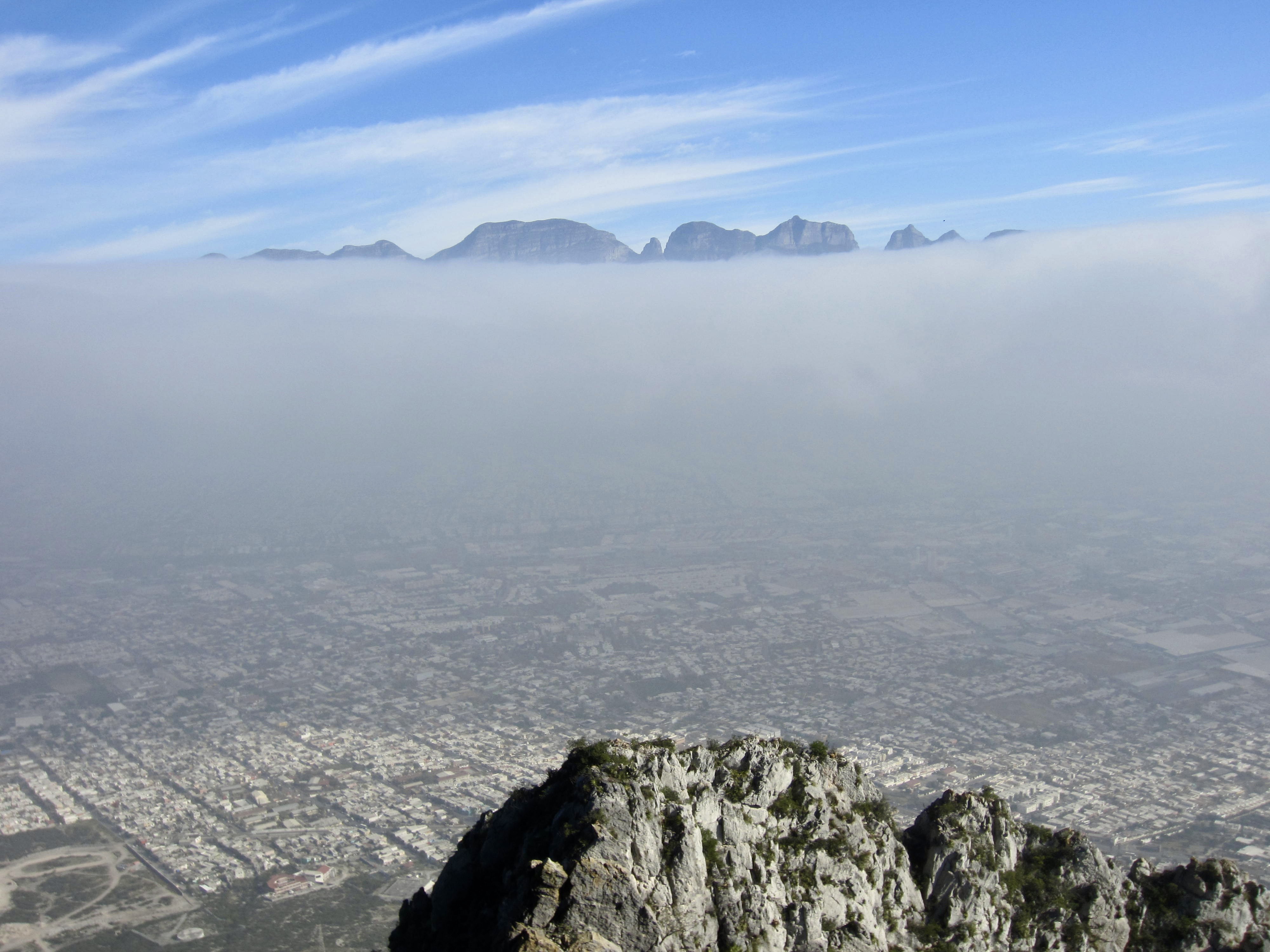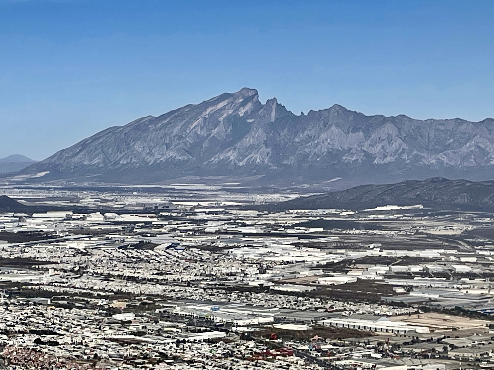 Our weather was warm and calm, so we were able to enjoy a relaxed lunch inside the tunnel. At the opposite end of the tunnel, the city of Monterrey—with its population of 5 million people—spread out northward until bumping up against Pico Fraile (“Friar’s Peak”).