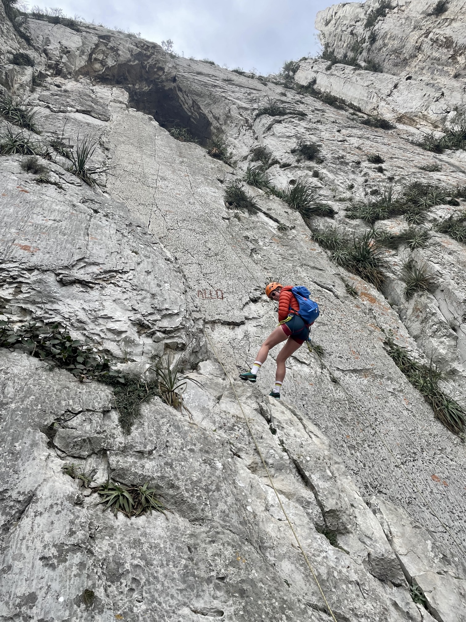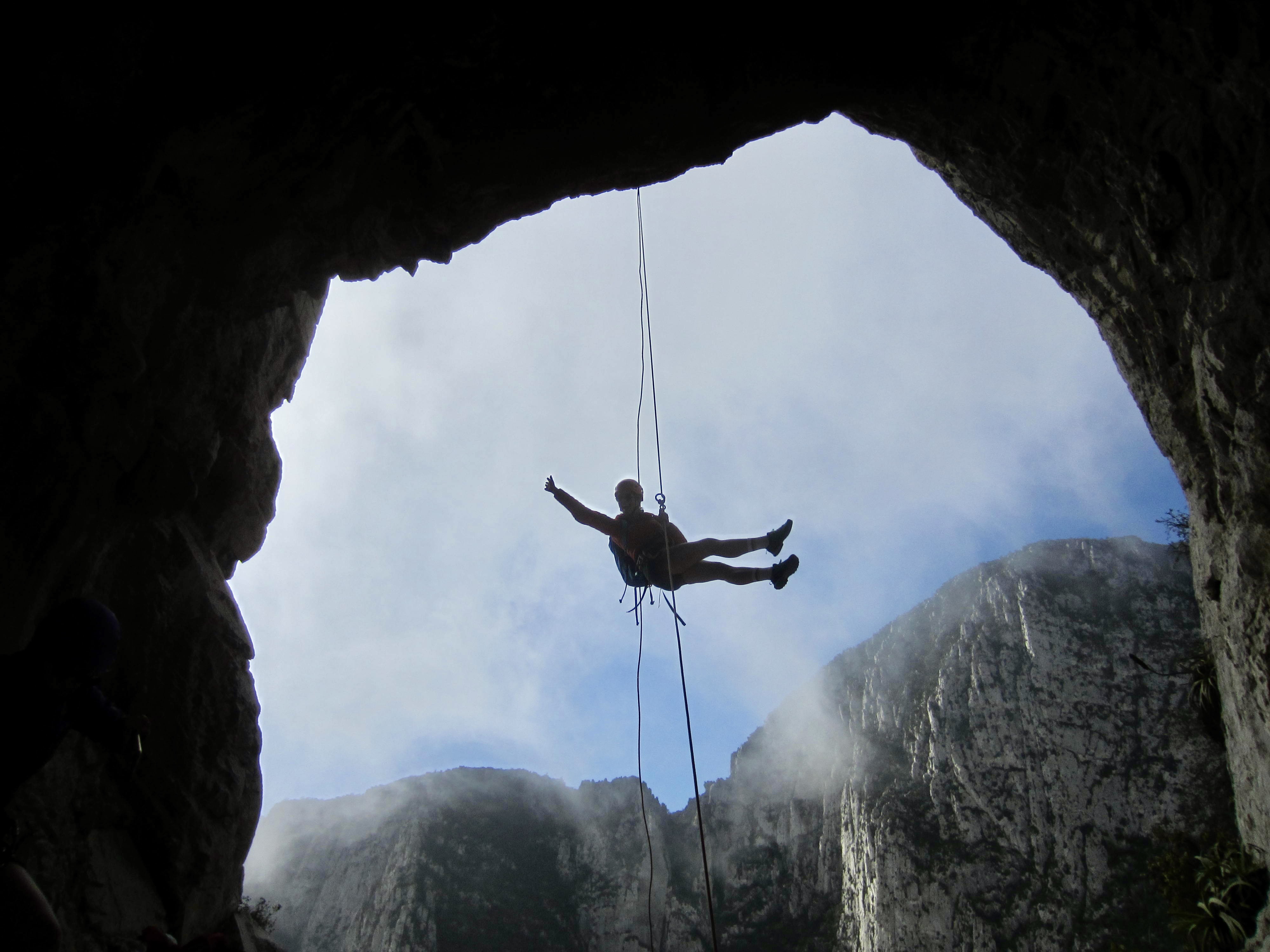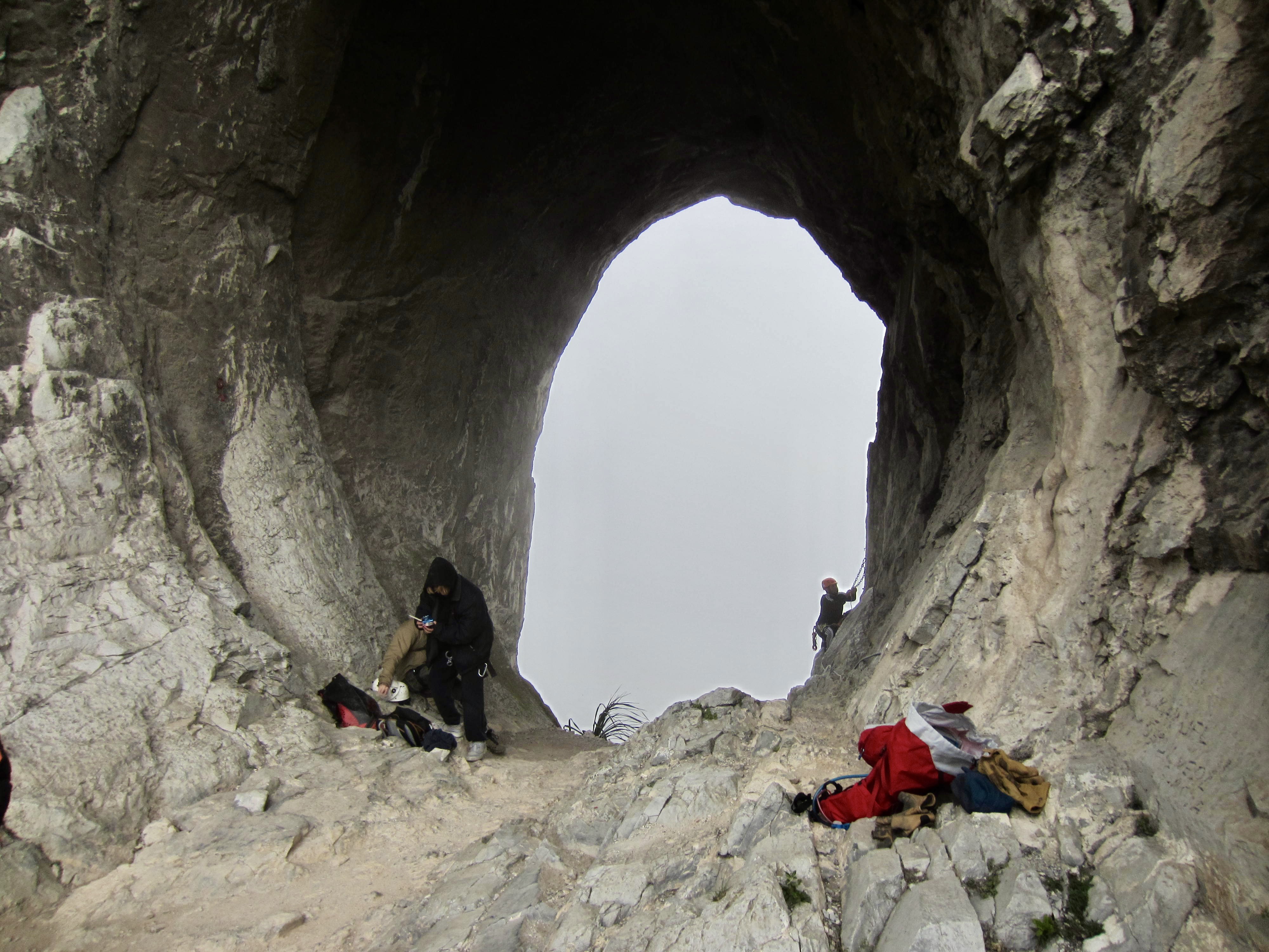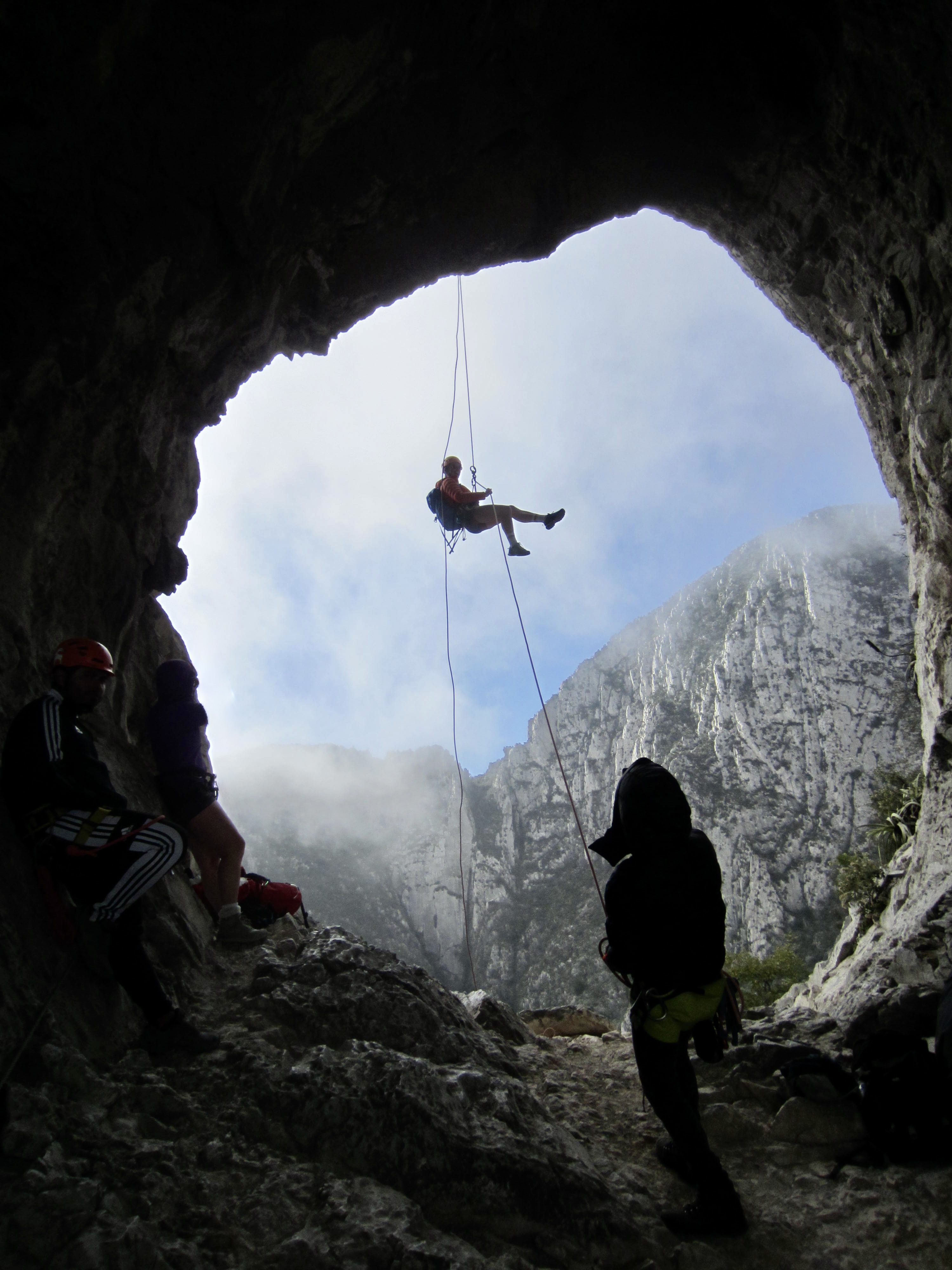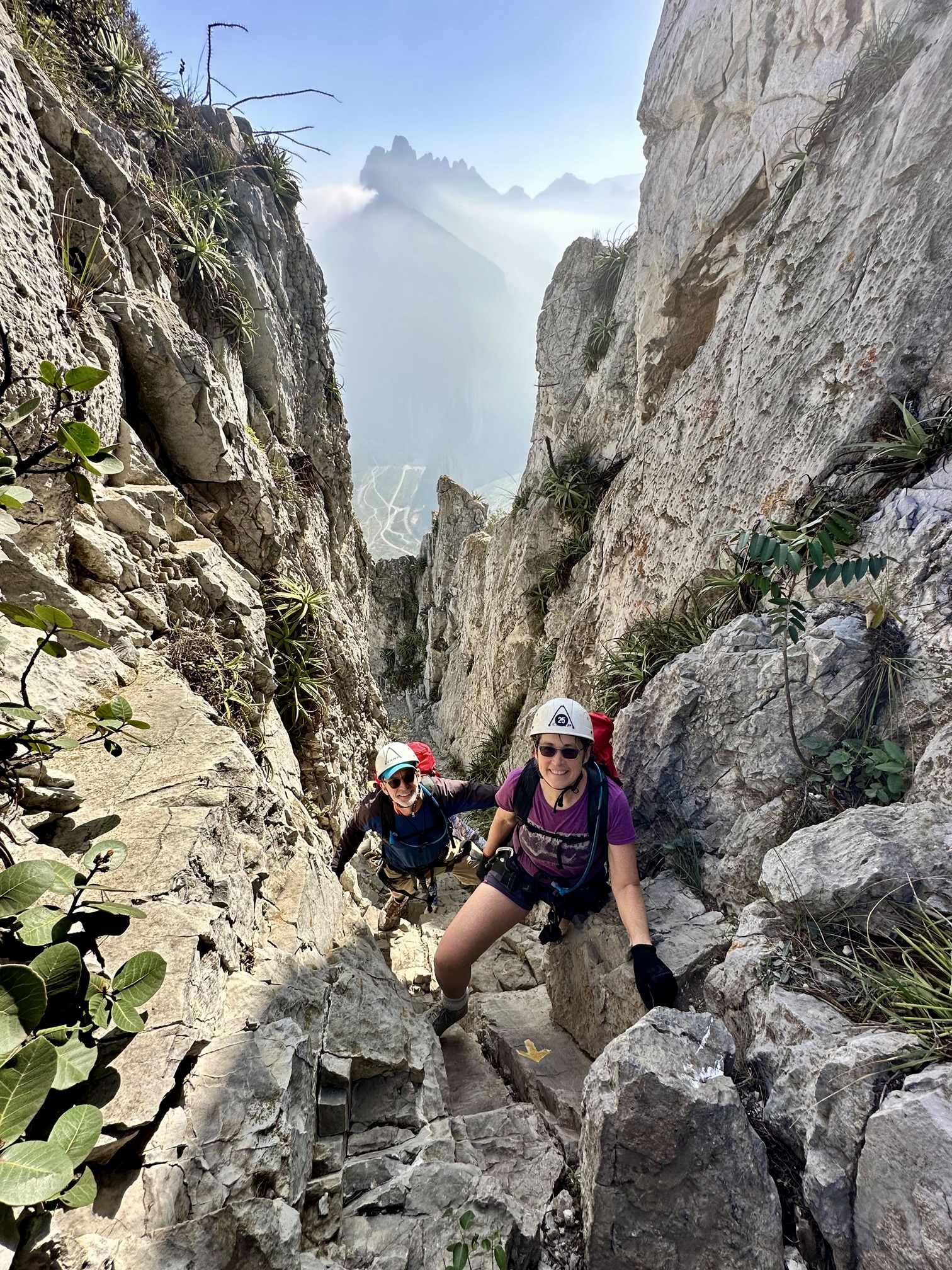 A fun scramble and via feratta climb along the East Ridge took us to the key rappel station. Here, an exciting 30-meter rappel dropped us into the mouth of The Eagles’ Nest (3.4 hours + 1600 ft / 500 m from start). Even having been here before, I found it to be an incredible experience!