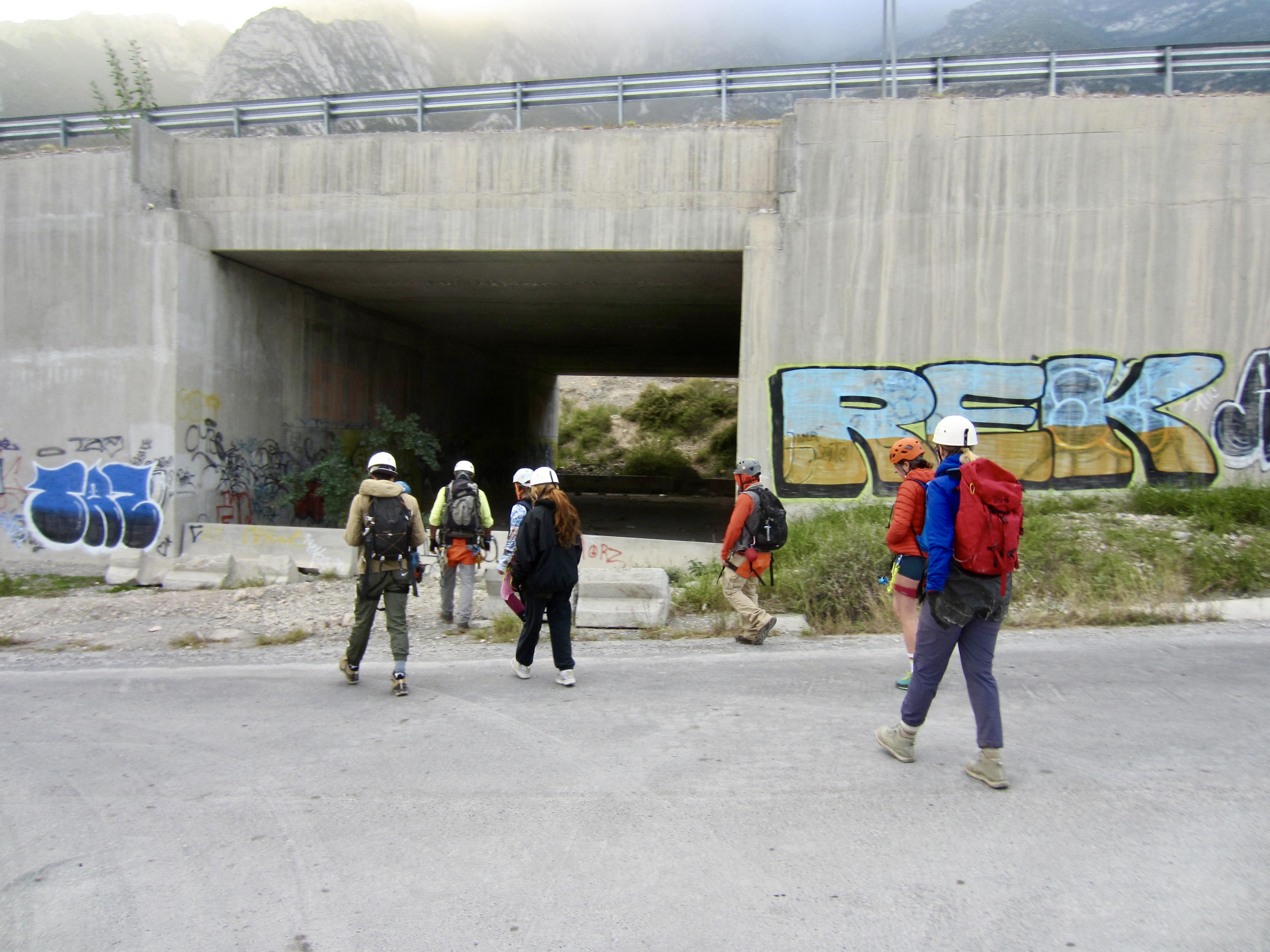 It was a great relief to finally reach the graffiti crag and upper end of the graded trail. Spirits rose as we quickened our pace down the trail without further mishap. We ended our fine adventure at the tollway underpass in early afternoon (5.3 hours + 1600 feet / 500 meters for total trek). Many thanks to the Gaia Xtreme trio for giving us such a memorable day in Monterrey!