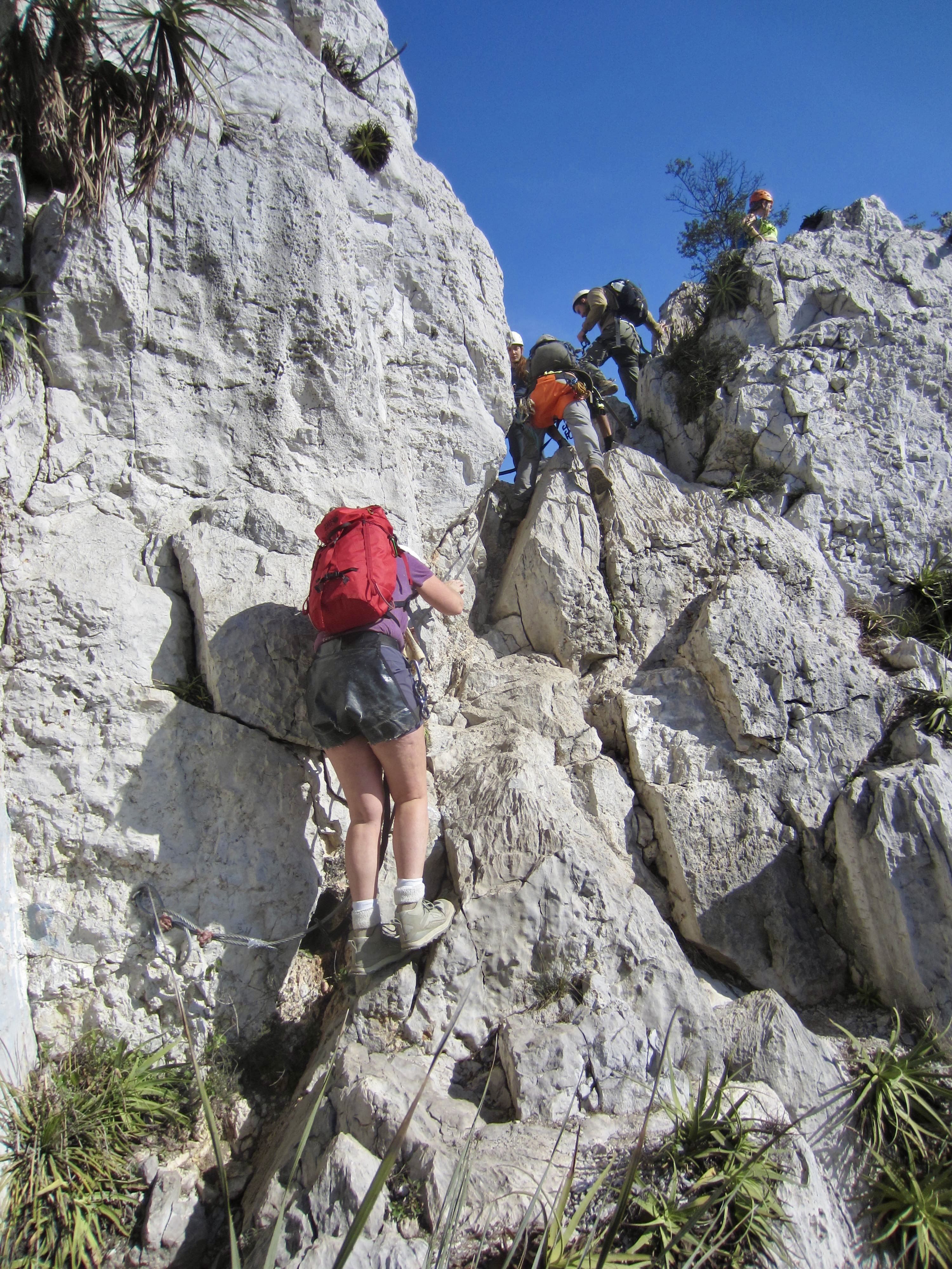 When it was time to get moving again, we began scrambling up the narrow crest on broken limestone. The scrambling difficulty never really exceeded Class 3, but the highly polished rock and considerable exposure made parts of it feel like Class 4. Thankfully, there was always a chain to grab or a cable to clip at these locations, in the style of a via ferrata climb.