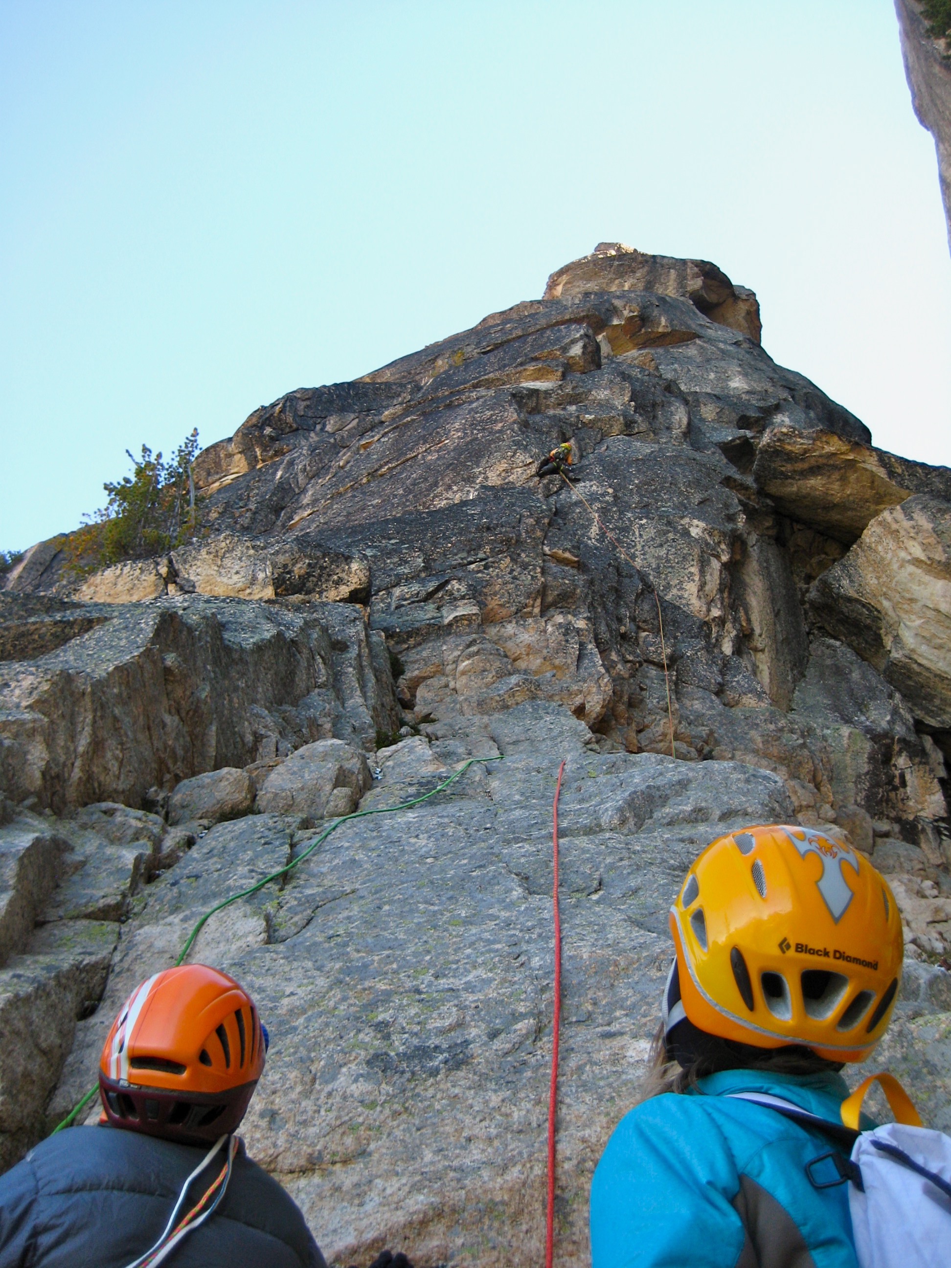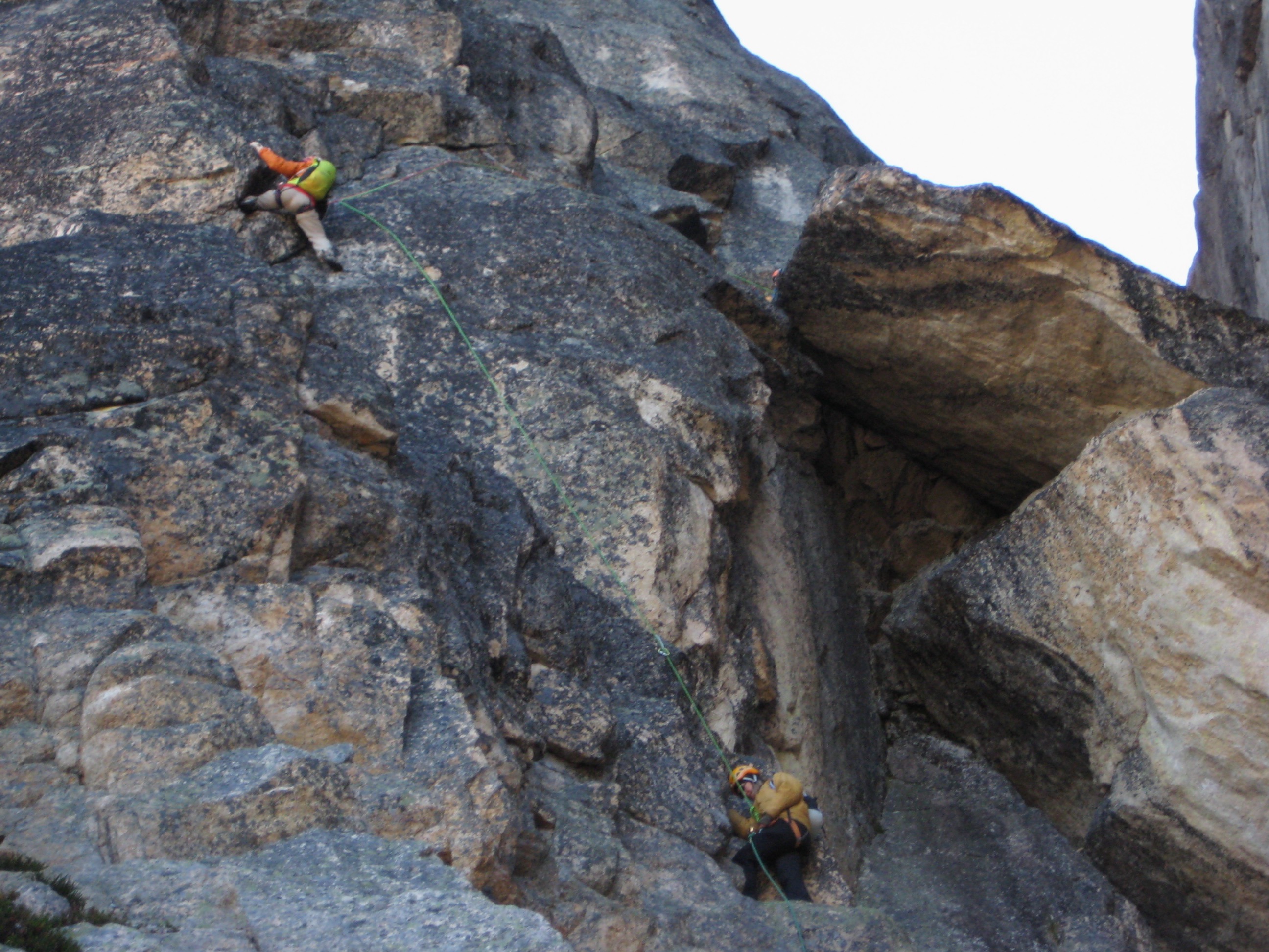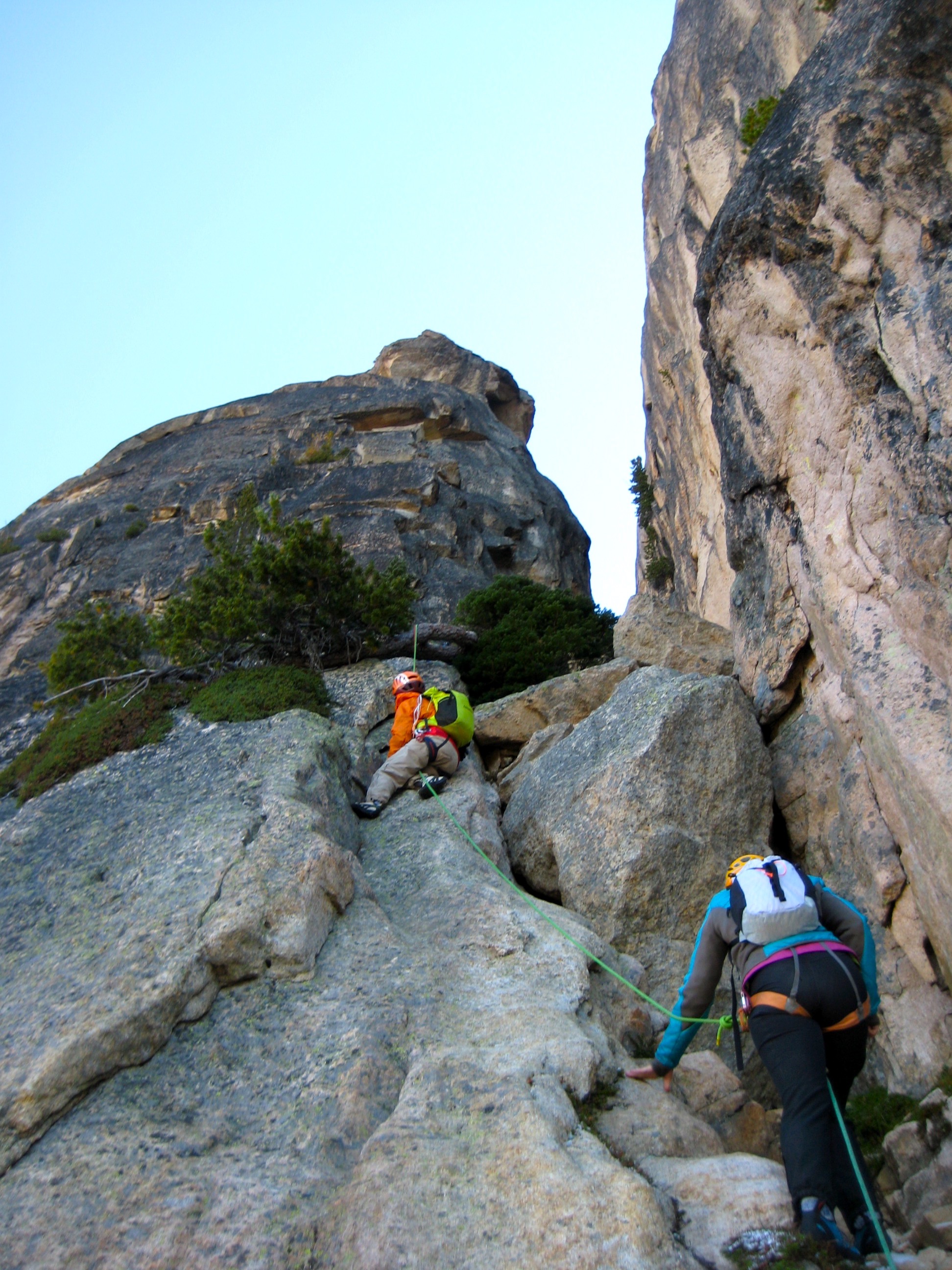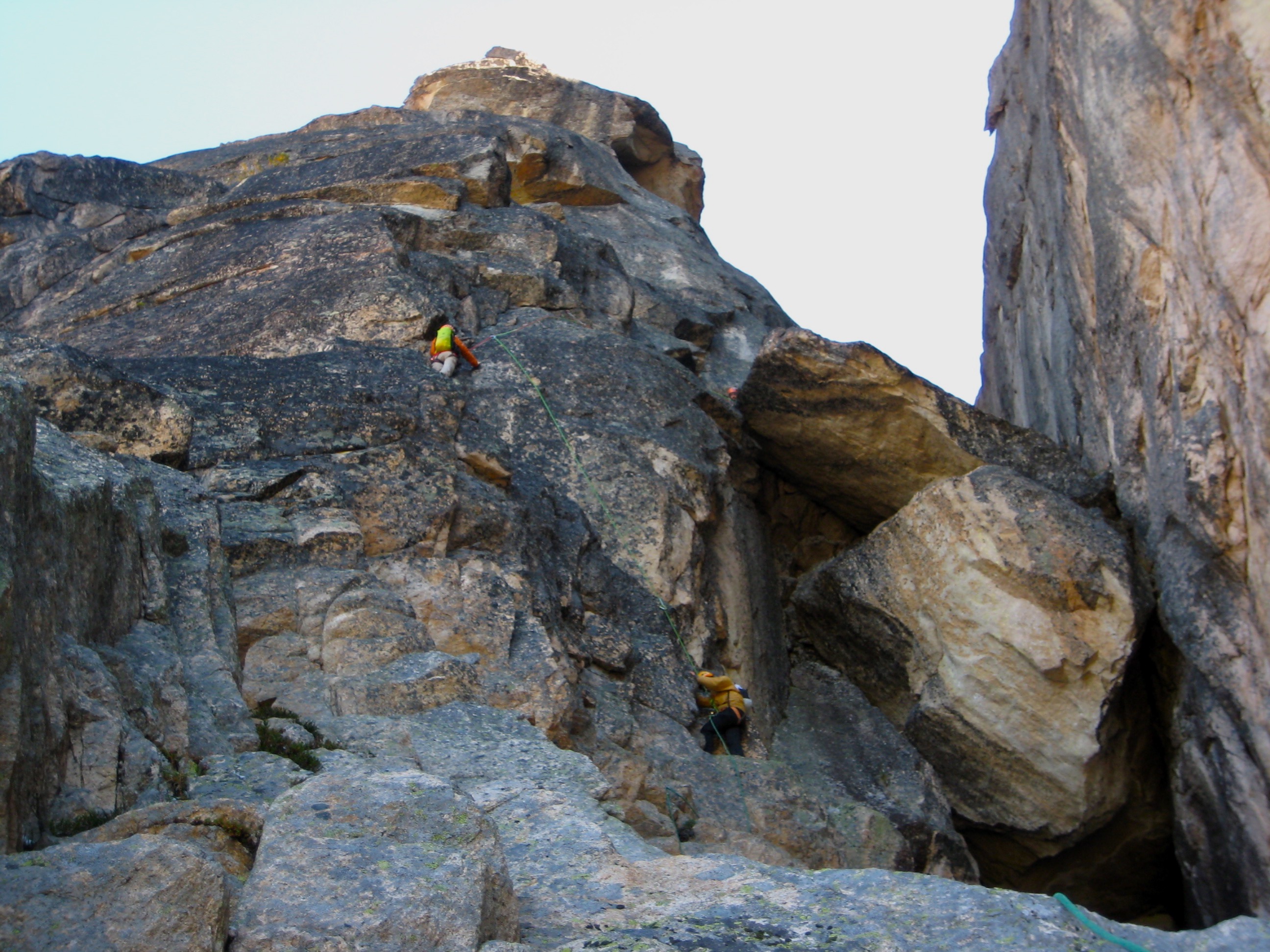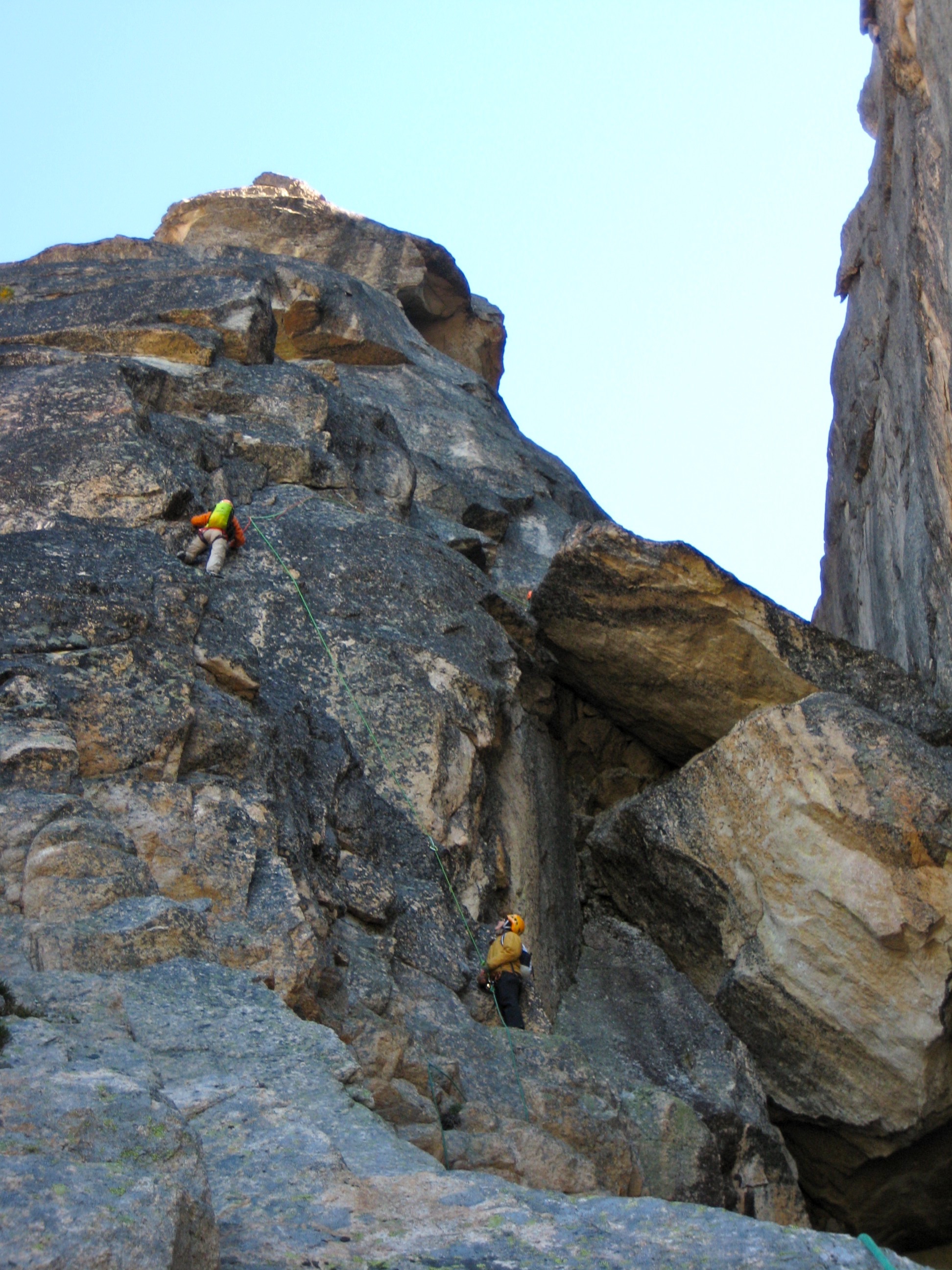 With our fingers having lost all feeling due to the cold air and rock, this Class 5.7 crux felt every bit like 5.8 or more. We inched across the granite face not knowing exactly what we were hanging onto, all the while expressing our opinion with loud grunts and curses. Even Larry, who routinely leads Class 5.12 rock pitches, stated that climbing and protecting this crux with numb fingers gave him some difficulties.