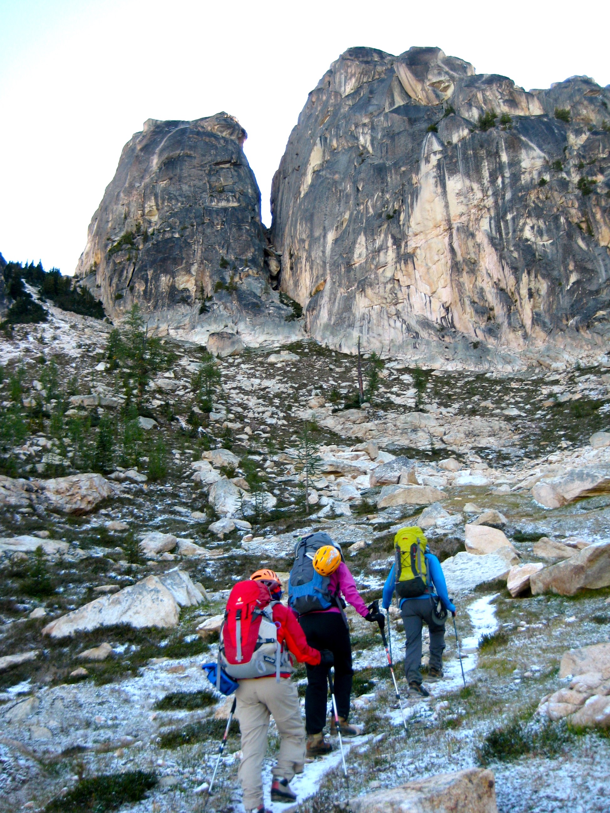 Fay, Eileen, and I met Larry at the Blue Lake Trailhead on a frigid Tuesday morning (strictly speaking, this was one day before Fay’s birthday, so she was still a youthful 69.997 years old). The temperature was 28 degrees and there was a skiff of snow on the ground. This was quite a shocking change from our long stretch of summer weather and would undoubtedly affect our climb. (Without Larry to lead us, we certainly would have changed our plans.) We divided up the group gear, shouldered packs, and hiked up through frosty Liberty Bowl toward the awesome, sweeping, granite faces of NEWS and SEWS.