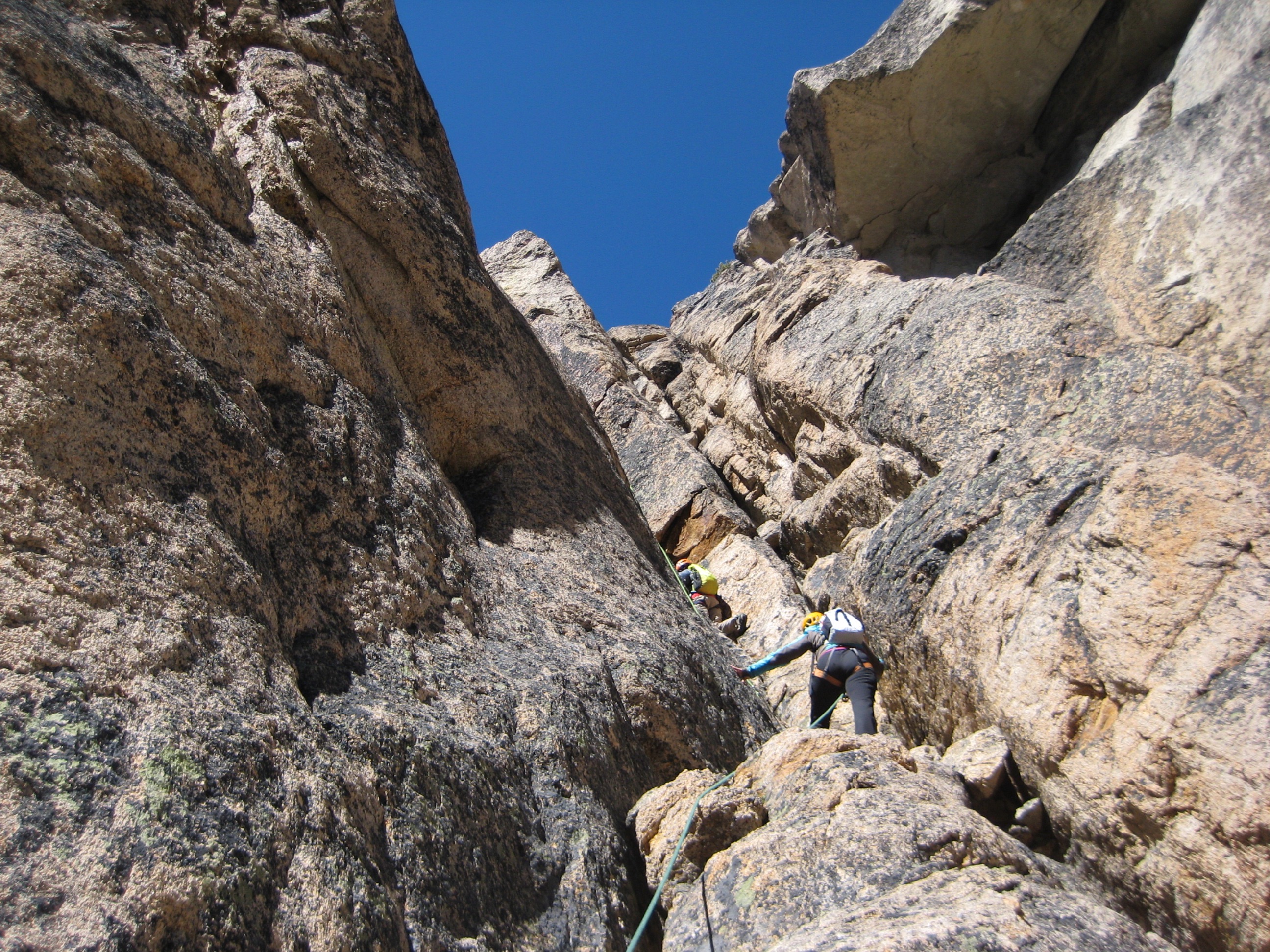Since there were four of us, Larry had us climb using the typical technique for a 3:1 client-to-guide ratio: Fay and Eileen moved simultaneously on two staggered ropes, while I moved separately on a trailing rope. Pitch 1 went up a series of cracks and ramps along the left edge of the southwest gully. Pitch 2 continued up the gully a short distance until almost underneath the giant chockstone, then veered left up an ever-steepening series of ledges and cracks before making a delicate crux traverse back to the top of the chockstone.