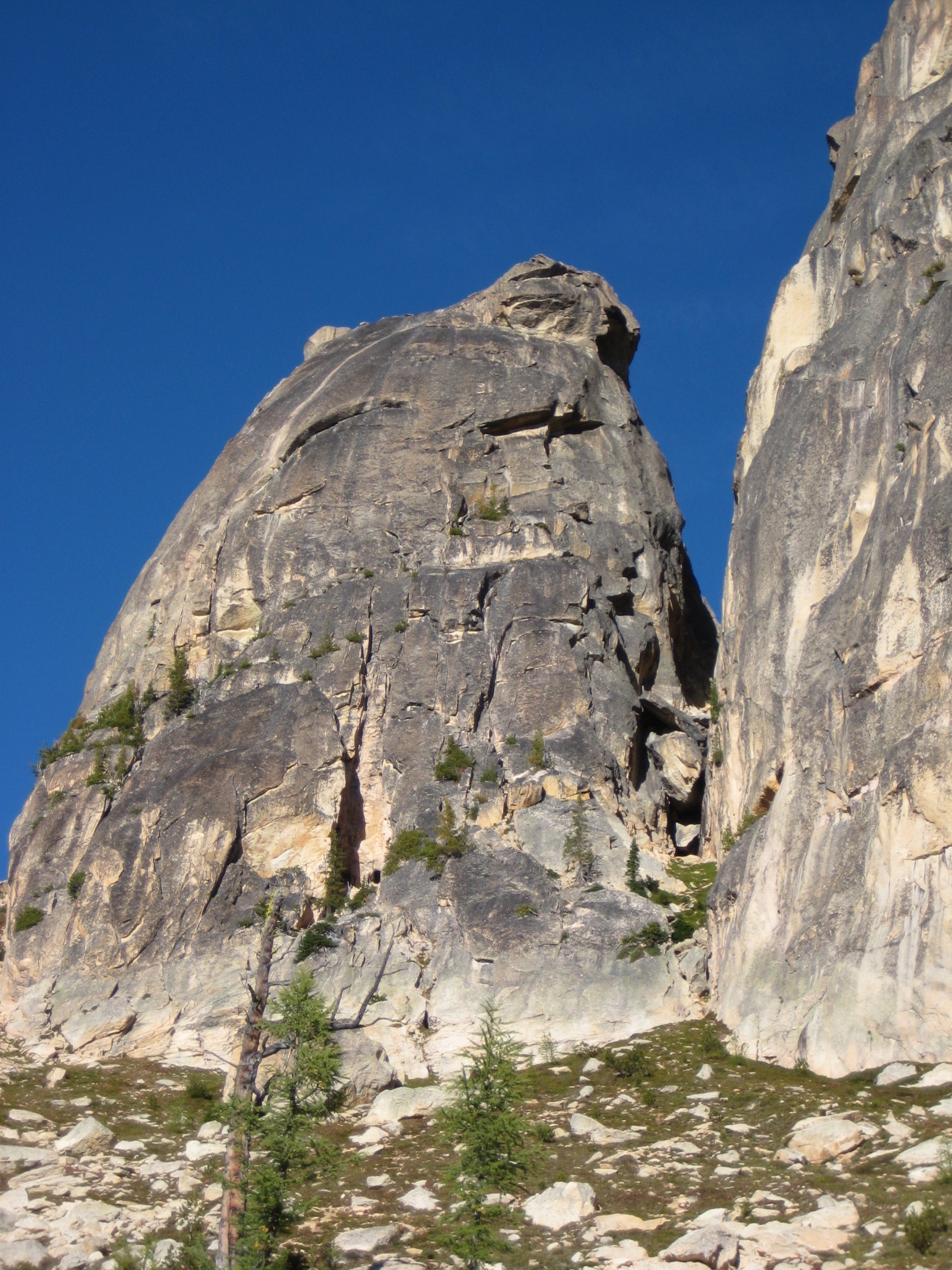 Our chosen route up NEWS was the Southwest Gully and South Face, which locals call the “Chockstone Route” because the key feature is a famously giant chockstone located in the upper gully. Beckey states that nowadays this route is shunned by rock climbers in favor of the more difficult, solid, and direct routes nearby. However, it has historical significance as the first route ever completed on NEWS (in 1950), and the numerous old pitons we saw along the way indicate this was probably a standard route for many years after that first ascent.