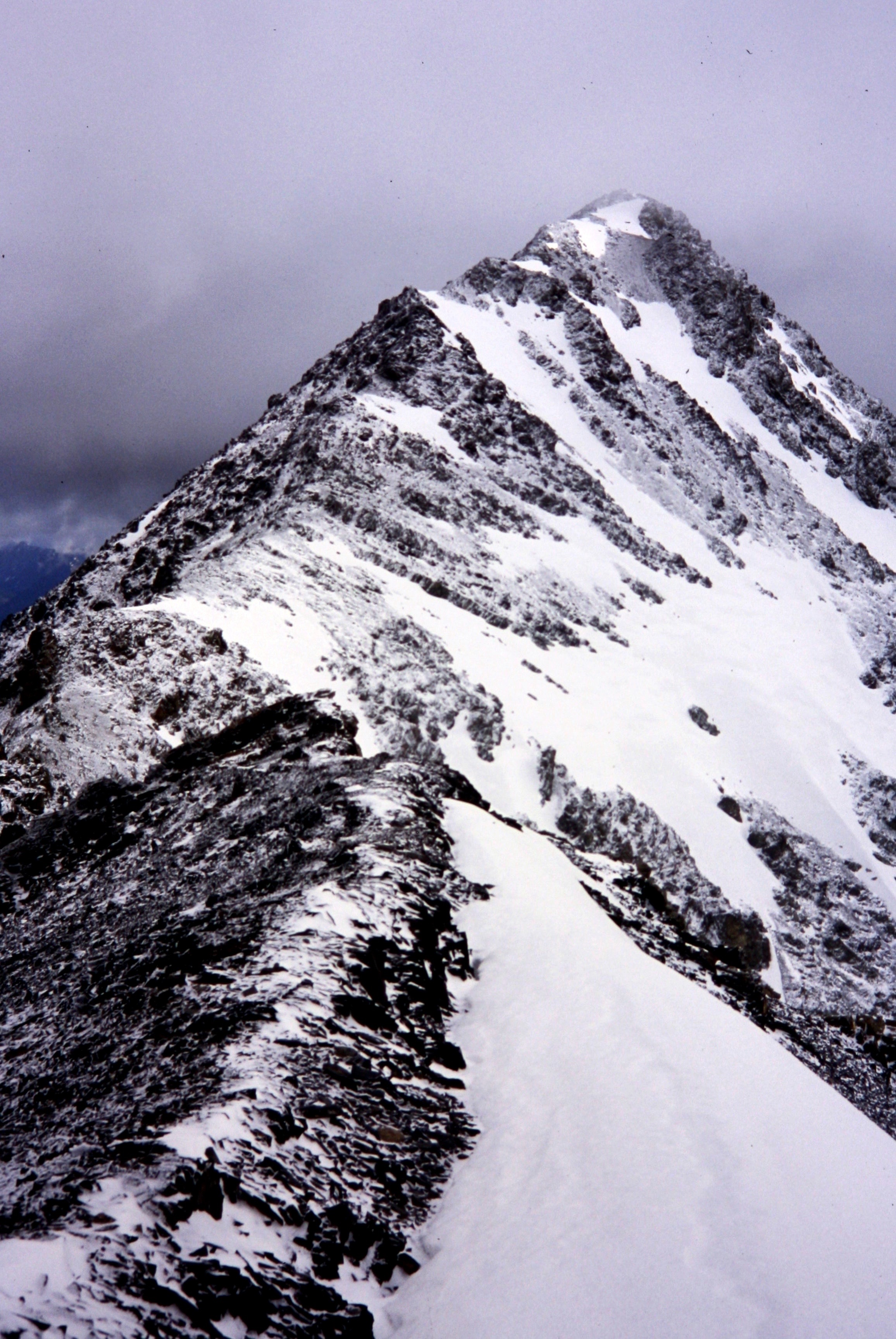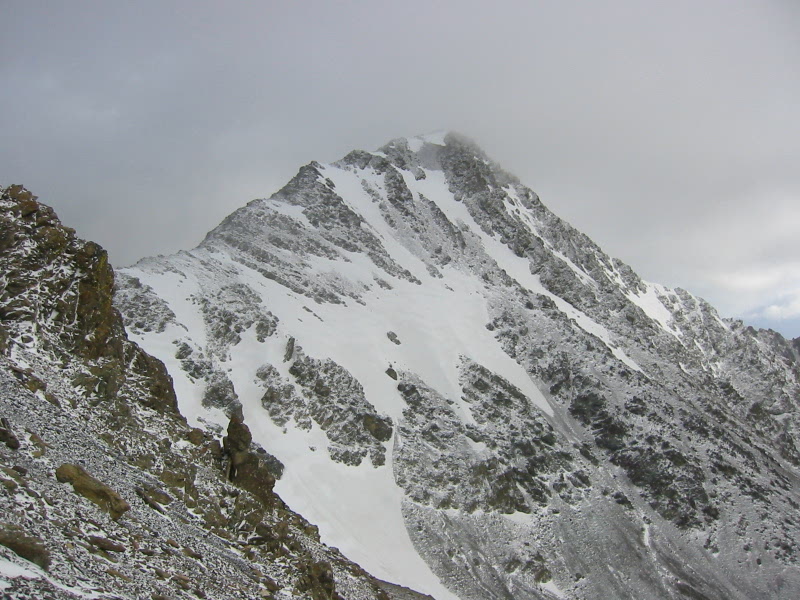 We crouched down and donned extra clothing—everything we had brought—and assessed our situation. Janet found that the wind and fresh snow were overriding her summit desires, so she decided to retreat to a sheltered spot. Beth and I decided to give it a try, with hopes that a lower-level ridge traverse might get us out of the brunt. We dropped down the west side several hundred feet and contoured under some ridge horns, then crossed back over to the east side. Graciously, the wind abated a bit, and the snowy rock didn’t present much trouble on this mostly Class 1-2 route.