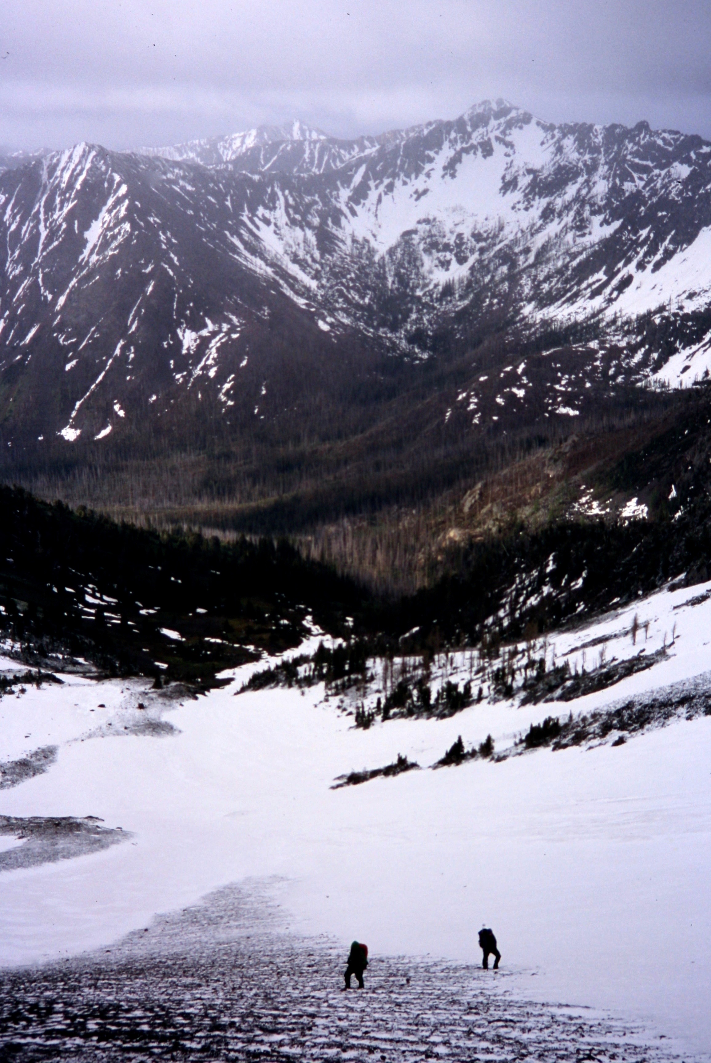 Where the meadow flattens out (about 10 miles in), we ascended off-trail grassy slopes to the north for several hundred feet, then contoured 1 mile northwestward toward Wolf Creek Basin. Staying between 6200 and 6400 feet to avoid groves of silver snags with jack-strawed deadfall, we eventually were able to drop into the soggy but cute little basin and establish a camp at 6250 feet (6.5 hours from TH).