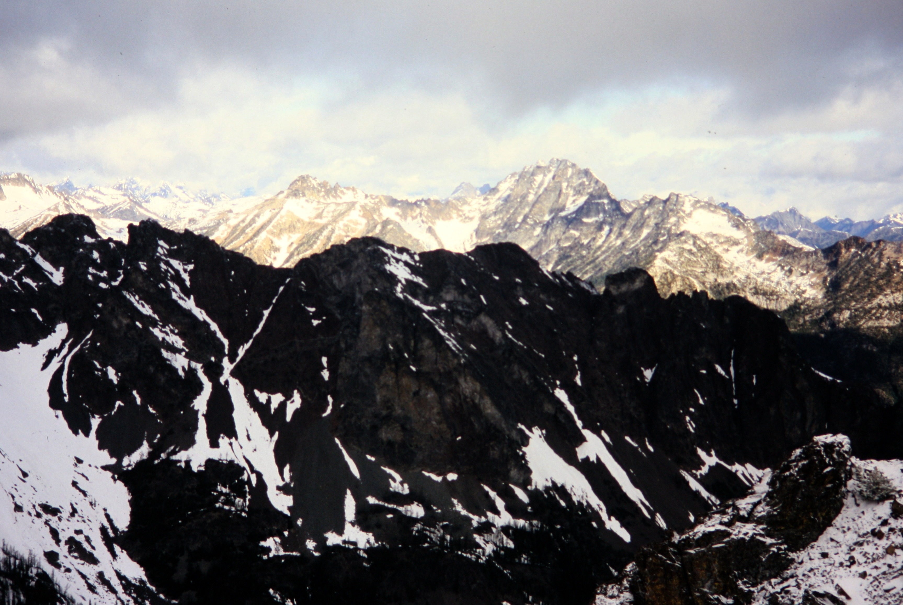 Given two full days to play, yet perhaps the most unfavorable weekend weather forecast of the spring, I headed over the passes once again. Beth and Janet joined me for an attempt on North Gardner Mountain from the southern side. Beth and I had found ourselves in that seemingly small category of people who have climbed Gardner Mountain but not its higher neighbor, whereas Janet was looking forward to her first trip into the Gardner area. We all hoped the rainshadow might bless us once more, despite the weatherman’s gloomy prediction. What we actually got was not what we had hoped for, but it was something we would long remember.