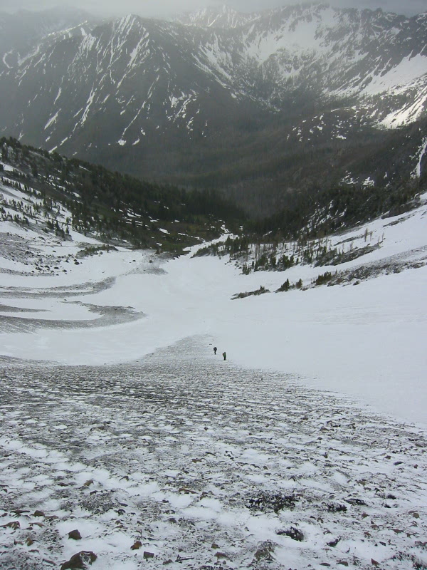 During our descent, the sky steadily cleared and the sun grew warmer. We collected Janet and made a rapid descent to camp, first plunging down scree, then glissading down snow, then slipping down grass. We took a sunny lunch break in camp (1.5 hours from summit) before packing up and heading back to the trailhead.