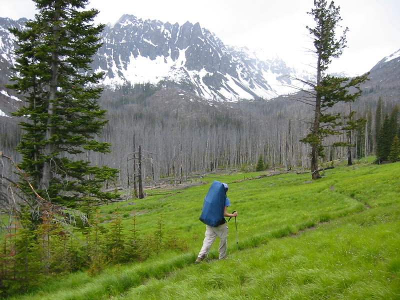 Just before noon, we started up the Wolf Creek Trail in pleasantly sunny and mild weather. Gradually, though, the clouds took over, and it started to rain as we passed the 7-mile mark. We tarped up our packs and bodies, and continued up to Gardner Meadows, encountering a mile-long stretch of annoying blowdowns along the way.