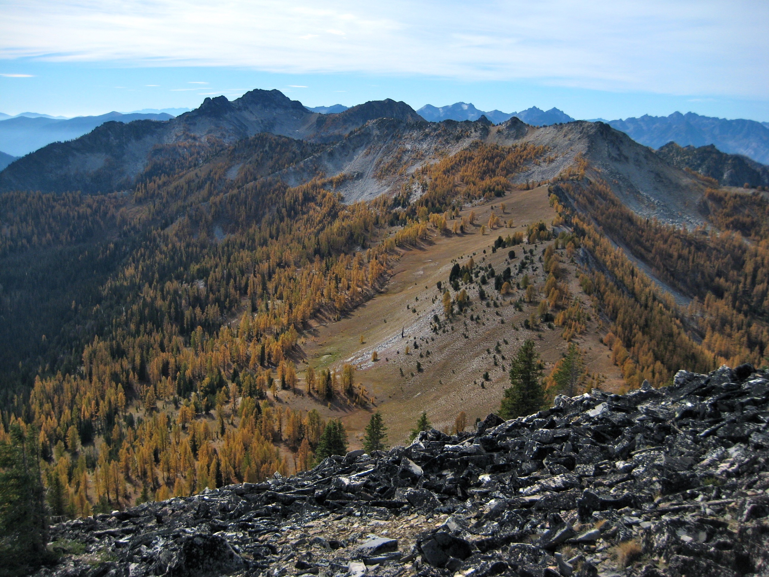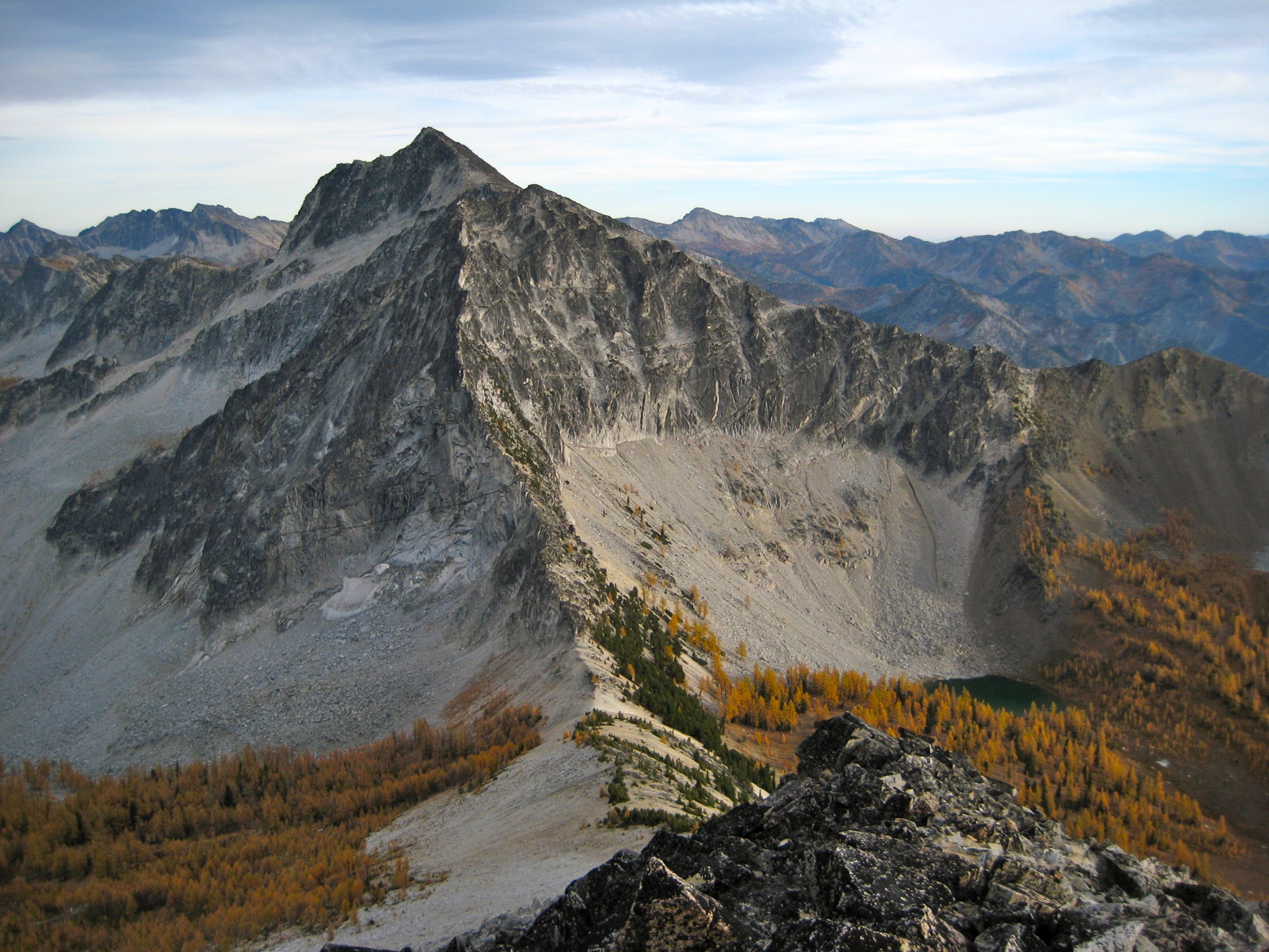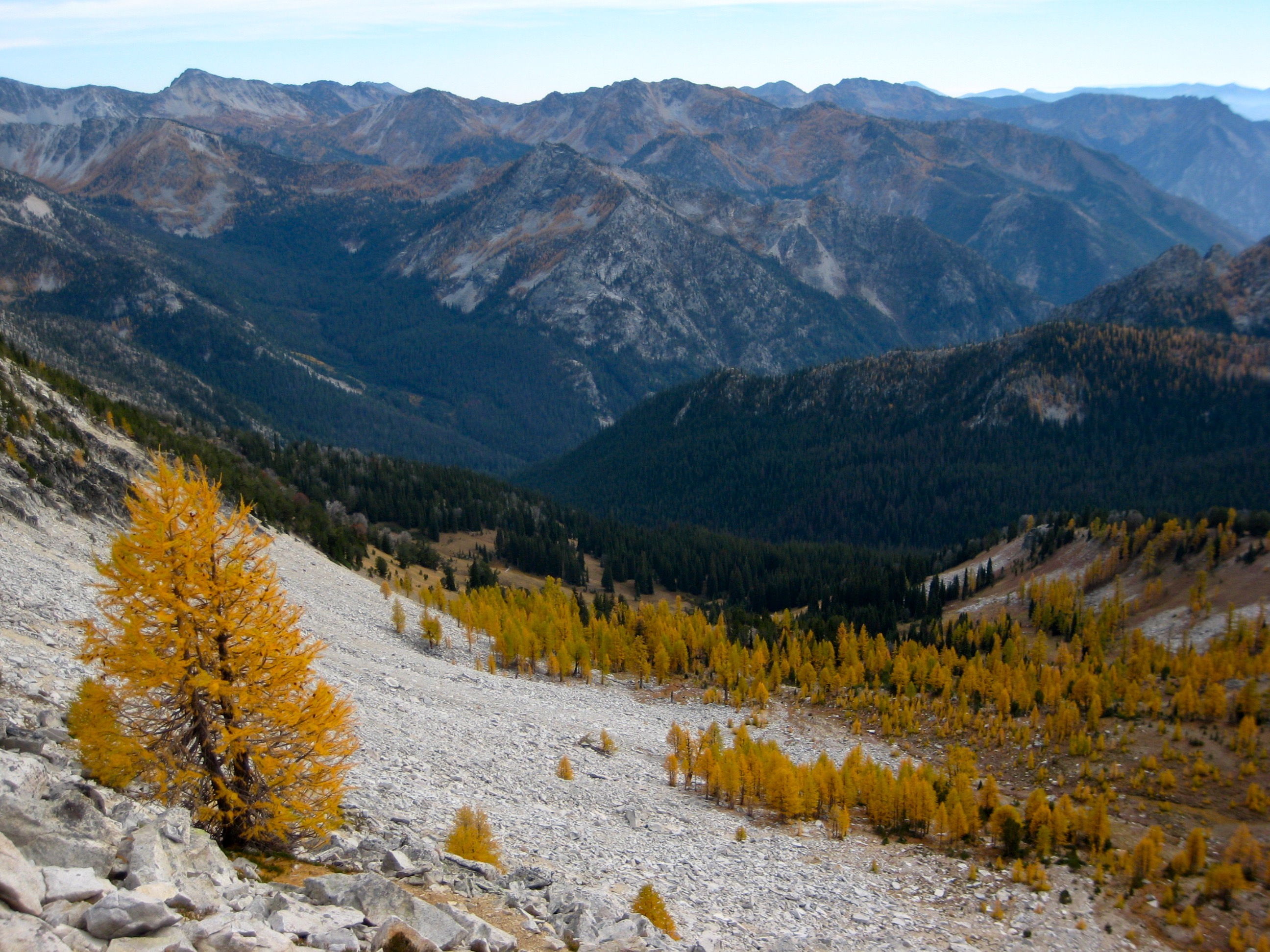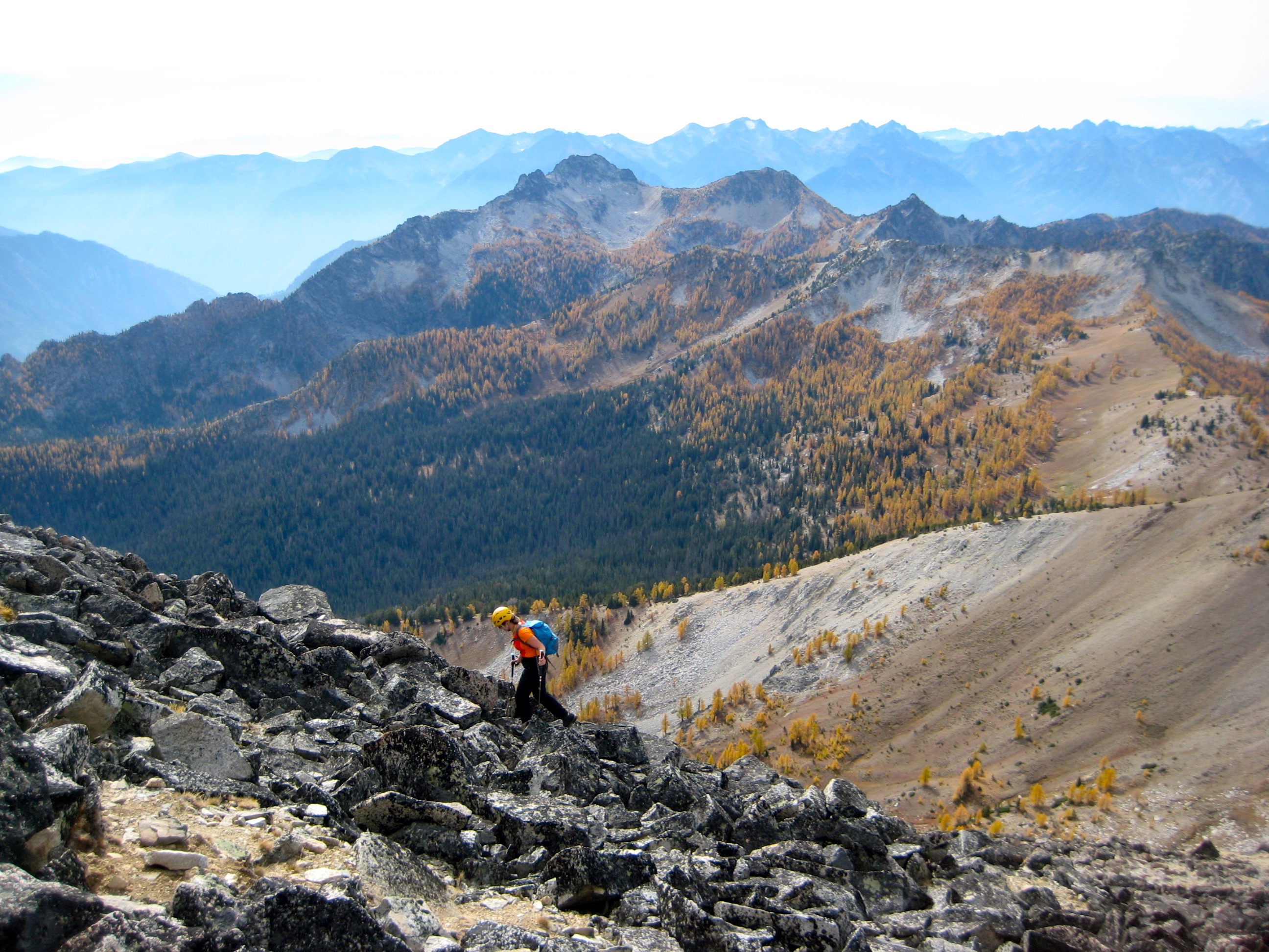 Back at camp, we hooked up with Doug, who had just returned from a successful jaunt out to Oval Peak. It was a warm evening, and the setting sun turned the Star Lake basin ablaze with larch color.