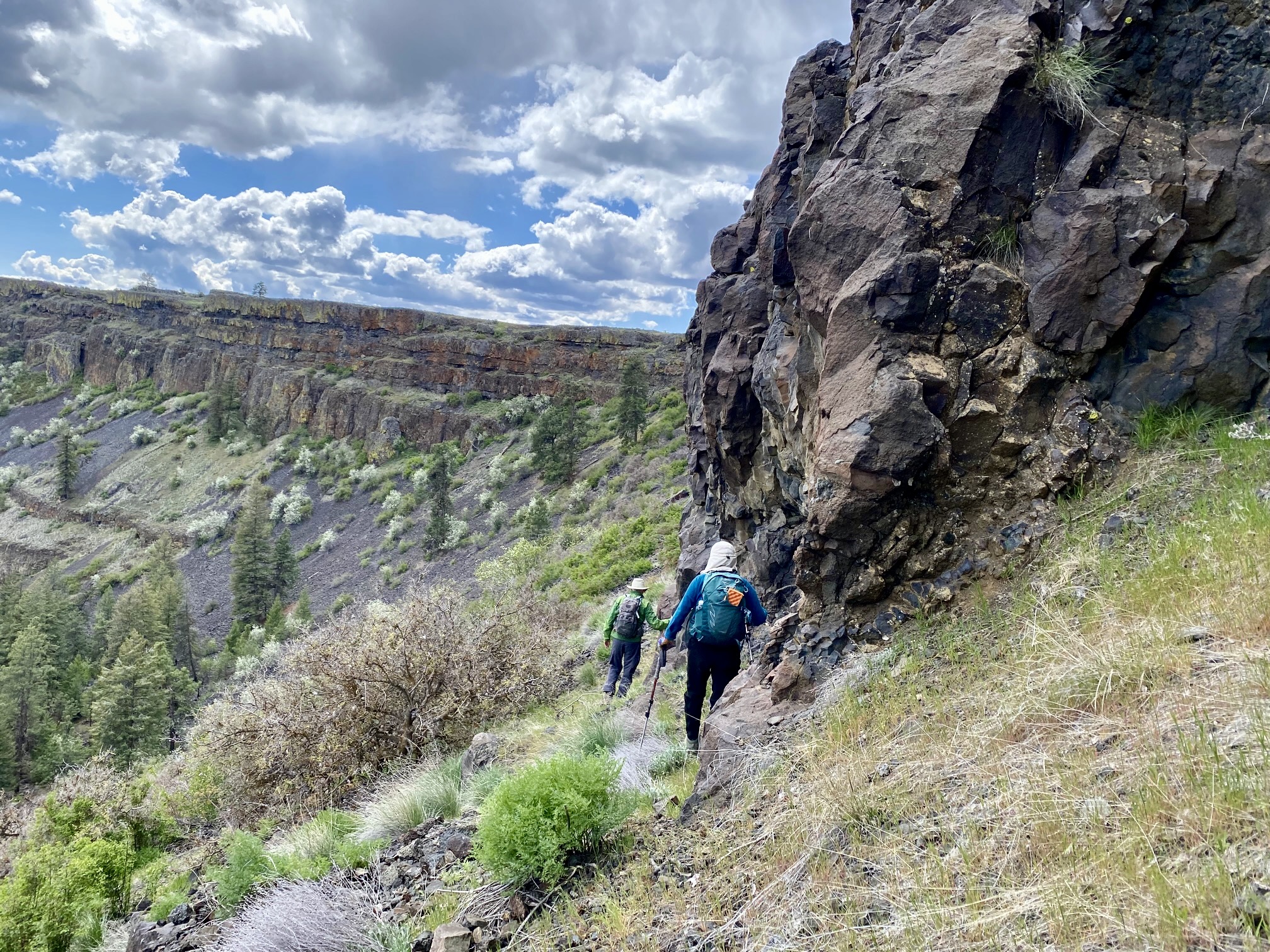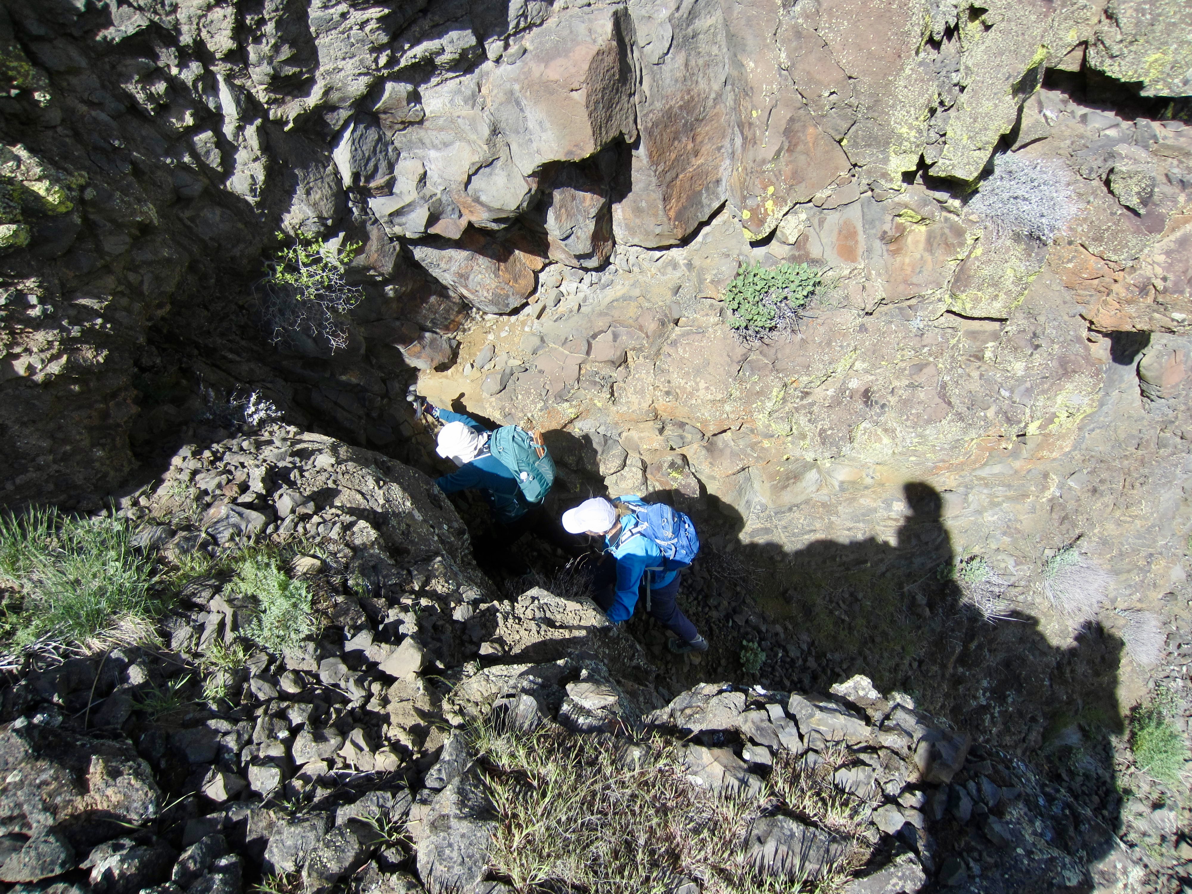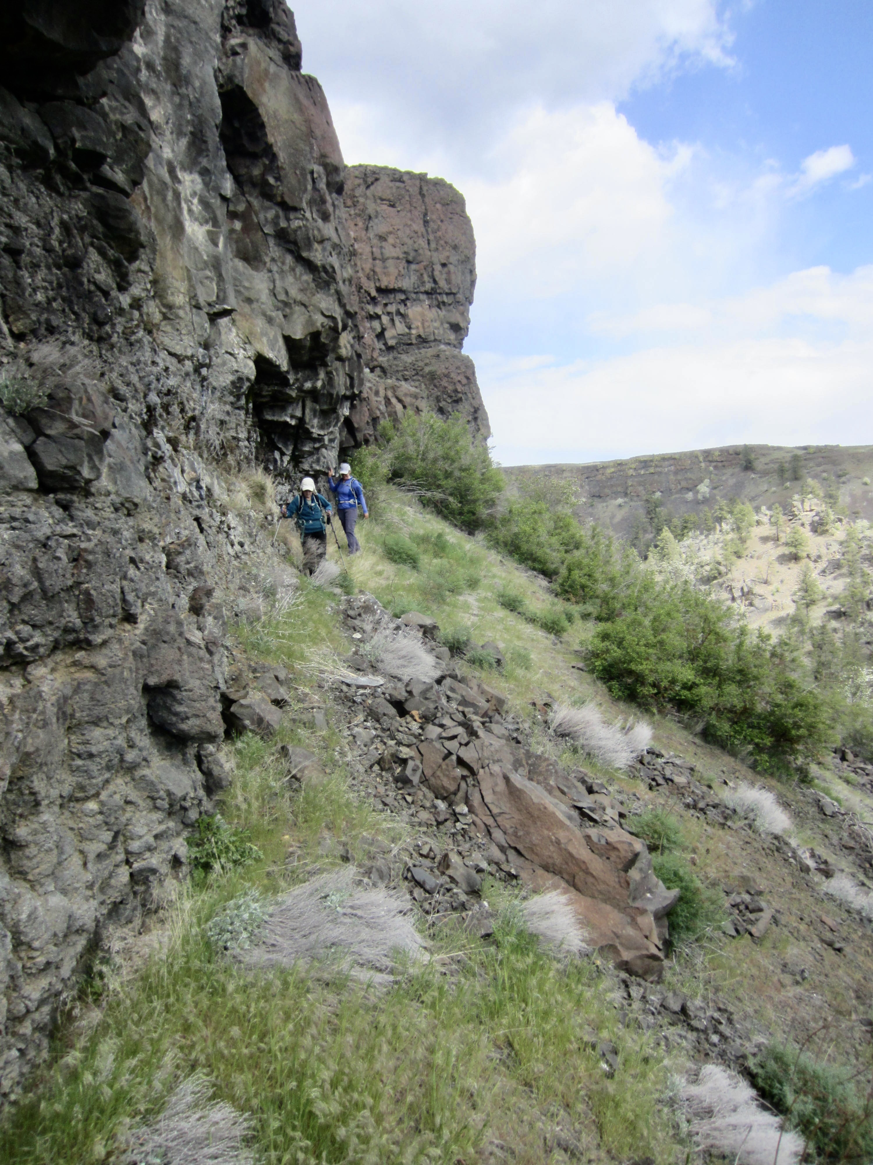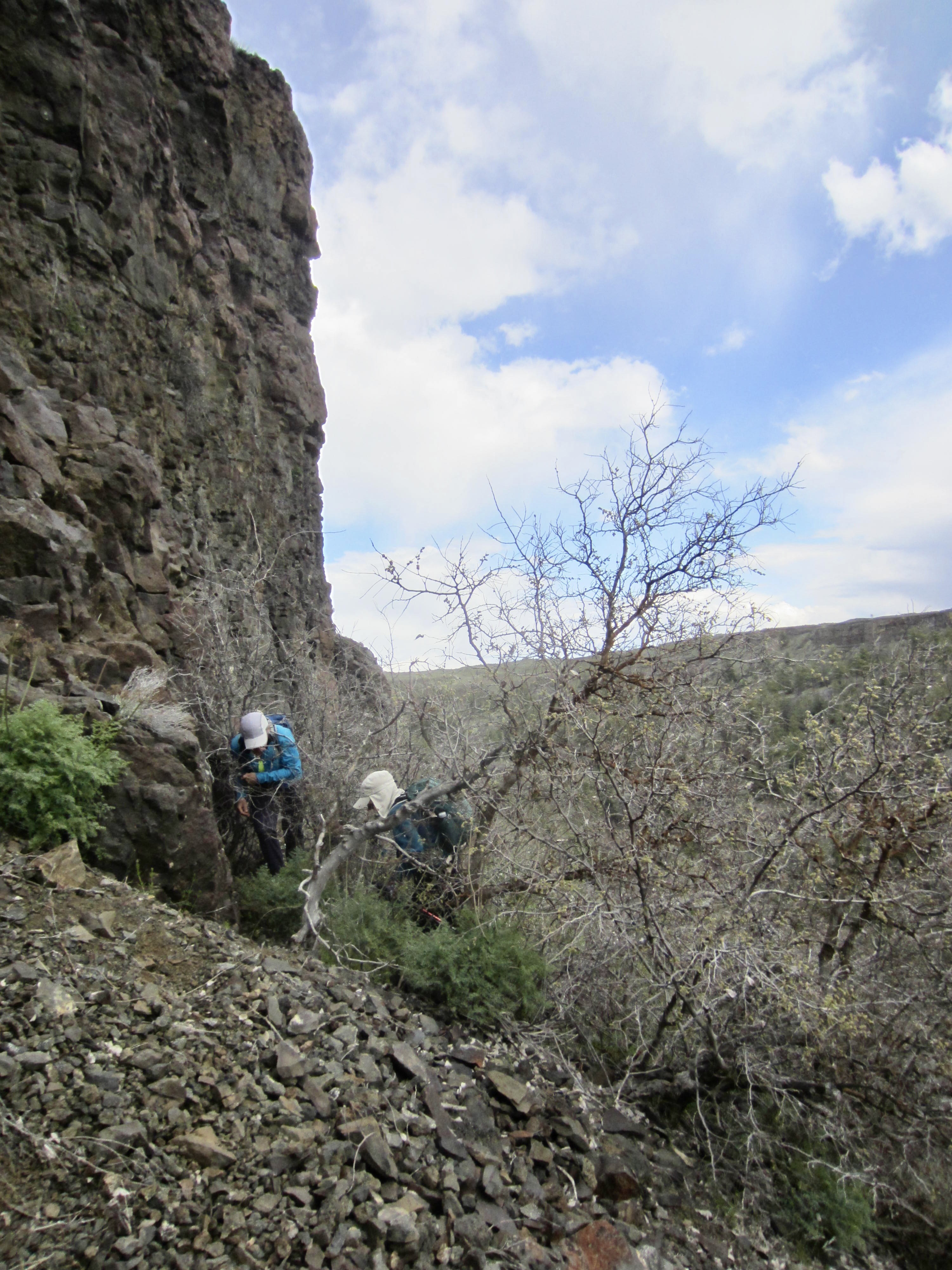 After ¼ mile of traversing below the tall cliff band, we came to a weakness that offered a possible exit route. We poked around a bit and found a short Class 3 slot that would get us up. The rock was fractured and crumbly—like all of the basalt in Northrup Canyon, it seems—but doable. We topped out in mid-afternoon (4.3 hours + 1000 feet from TH).