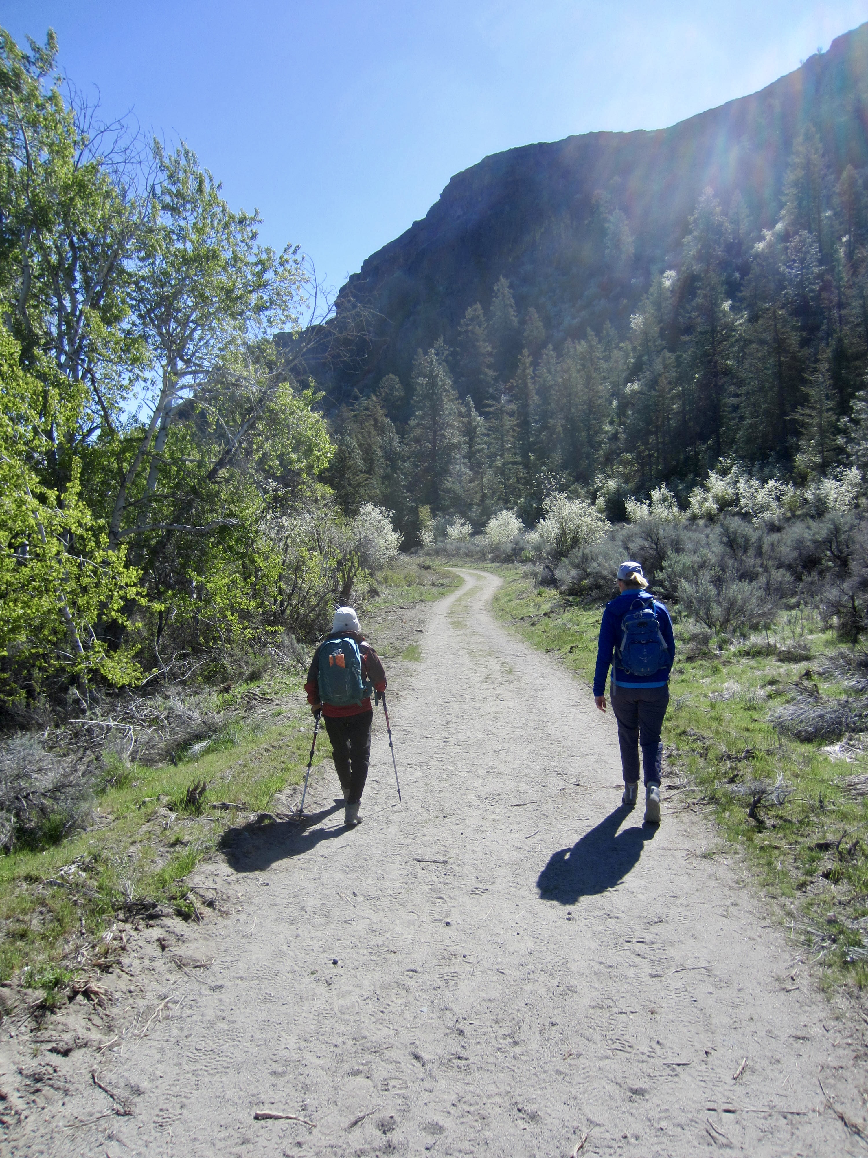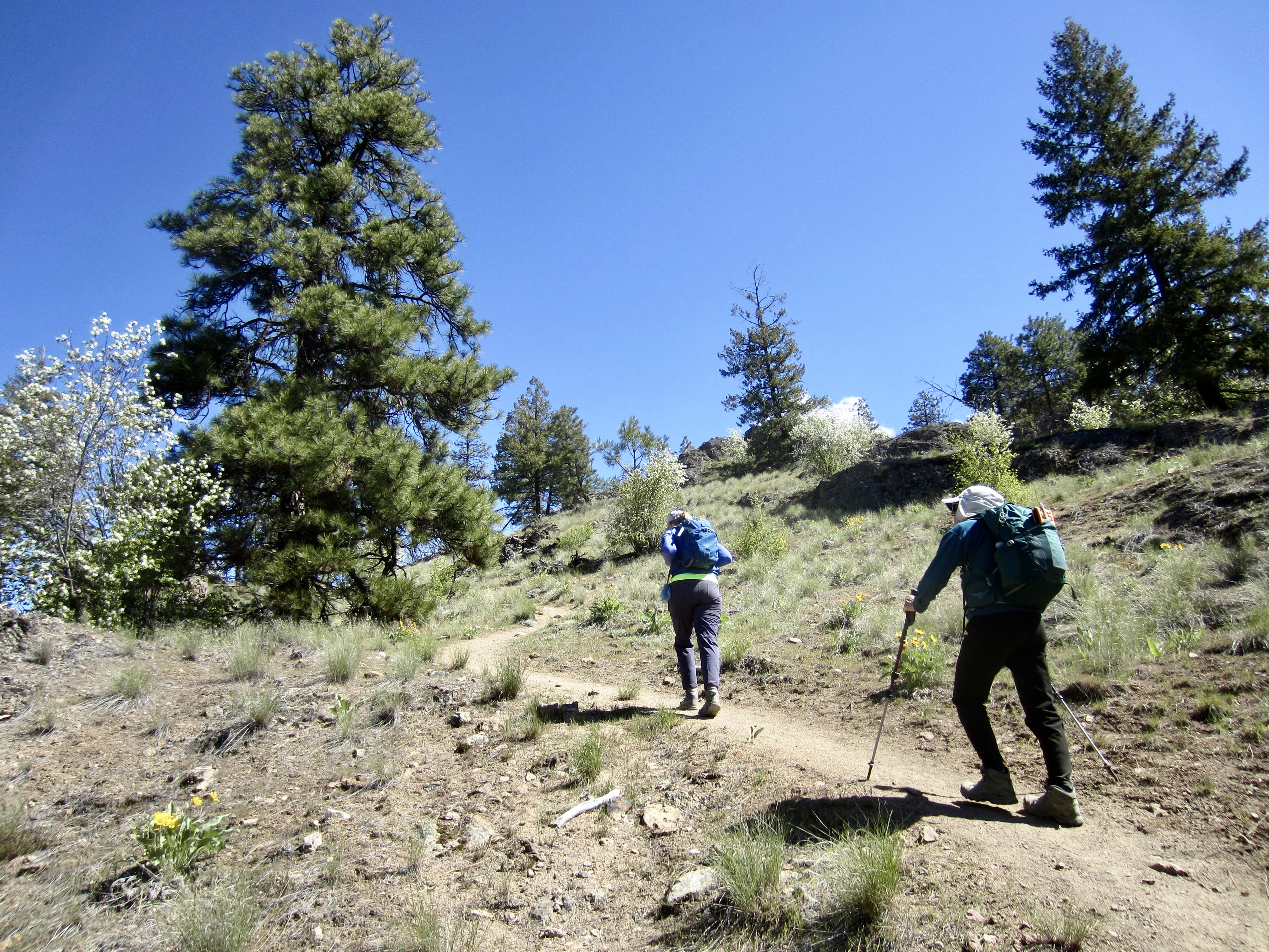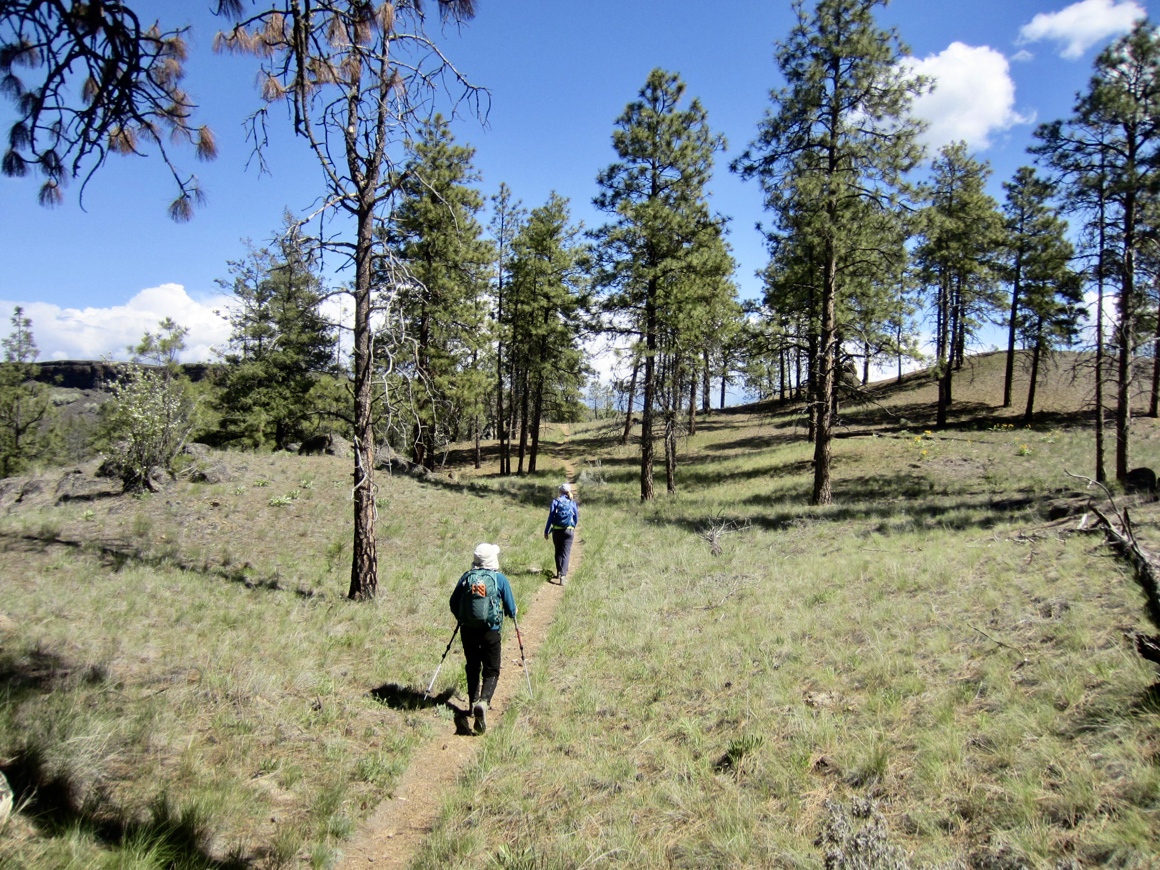 From the Northrup Canyon Trailhead, we followed an old road into the broad canyon, which represents a floodwater-eroded coulee. The winding road took us past outcrops of rounded granite, fields of fragrant sagebrush, clumps of flowering serviceberry (saskatoon) bushes, and groves of quaking aspen trees. It didn’t take us long to discover why this hike is so popular.