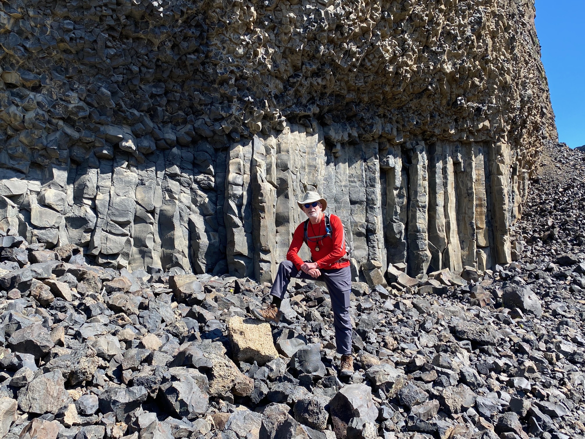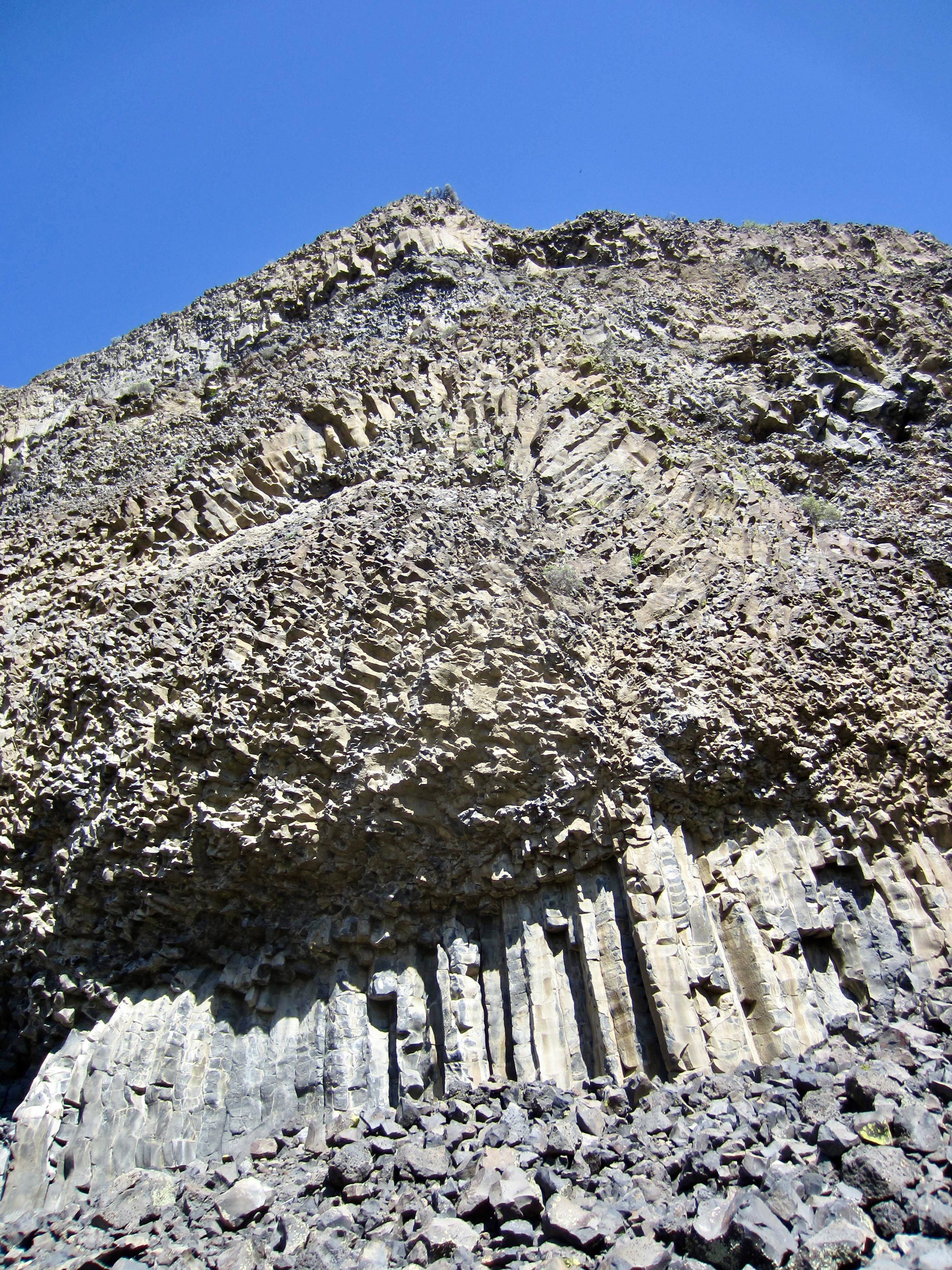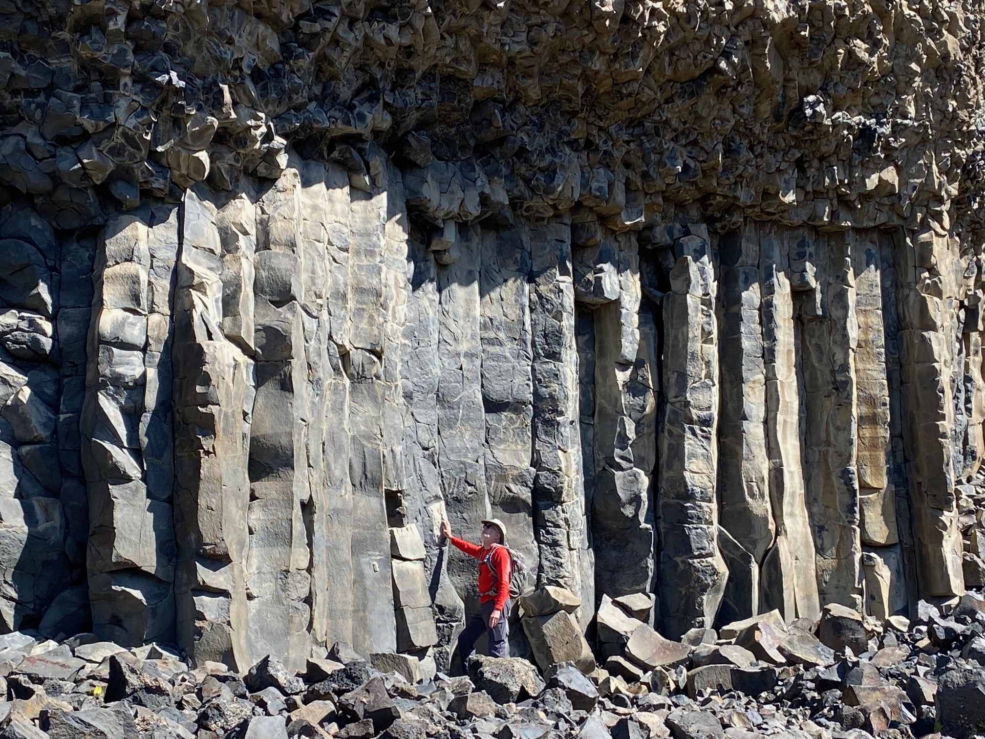 Shortly after crossing Northrup Creek on a relatively new bridge, we paused to marvel at a most bizarre-looking basalt cliff. Here, a 20-foot-high wall of vertical columns is capped by a tall, overhanging brow of chaotically textured basalt. The upper layer consists of smaller columns arranged in every possible orientation—some perpendicular to the cliff face, others forming huge fans and arches. By chance, celebrity geologist Nick Rhyolite happened to walk past at this moment, so we asked him to explain how this crazy deposit formed. Nick made a close examination of the exposed rock but, in the end, was at a rare loss for words.