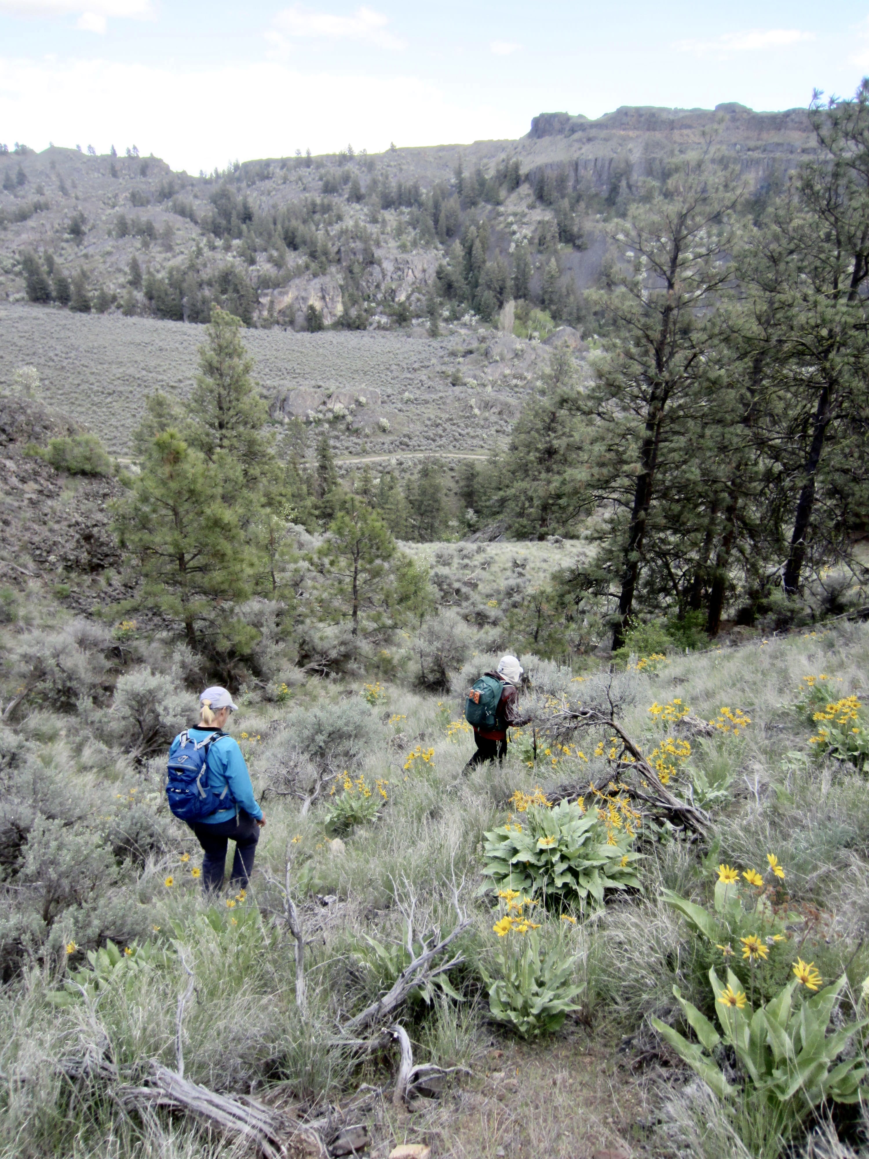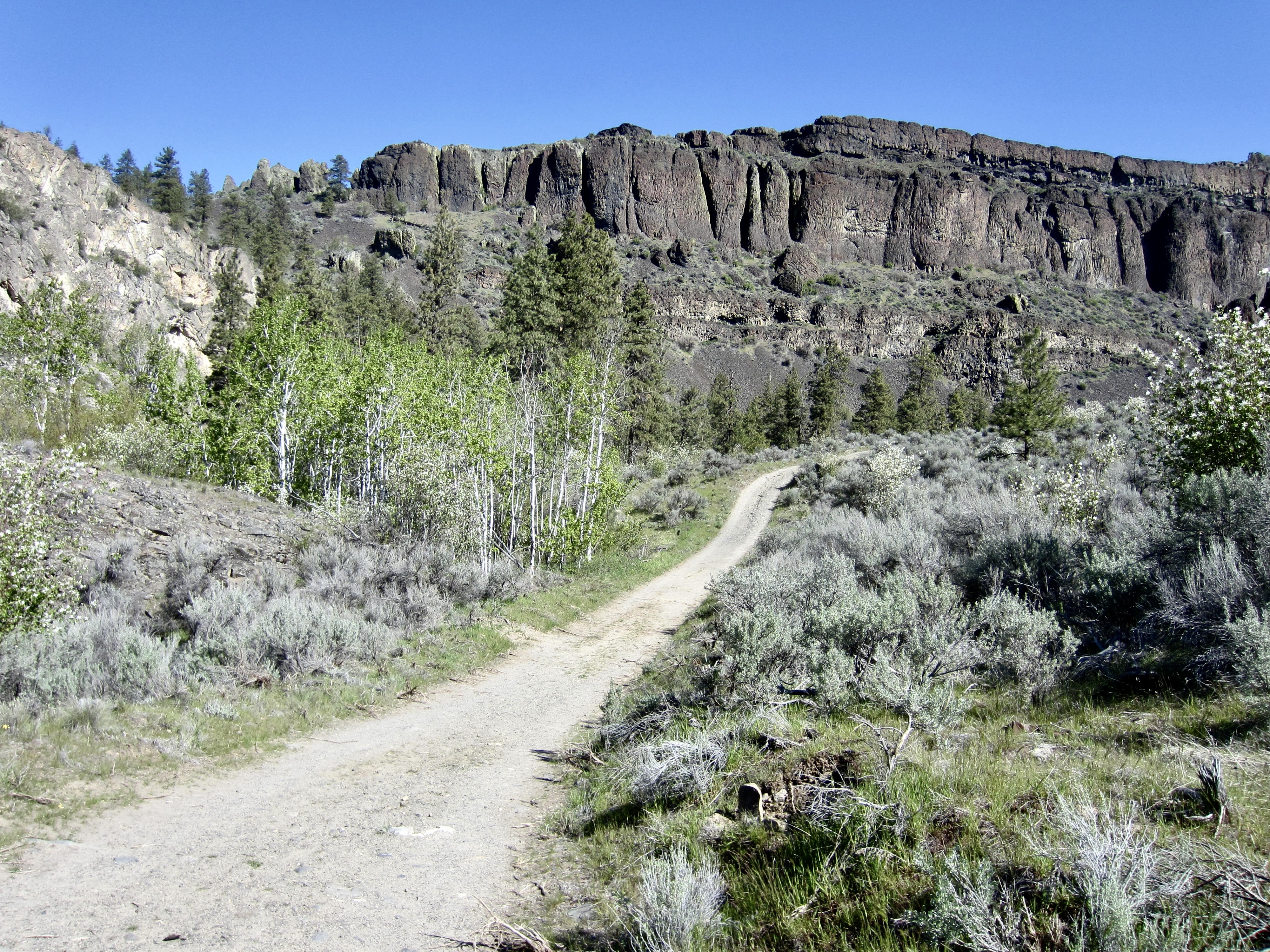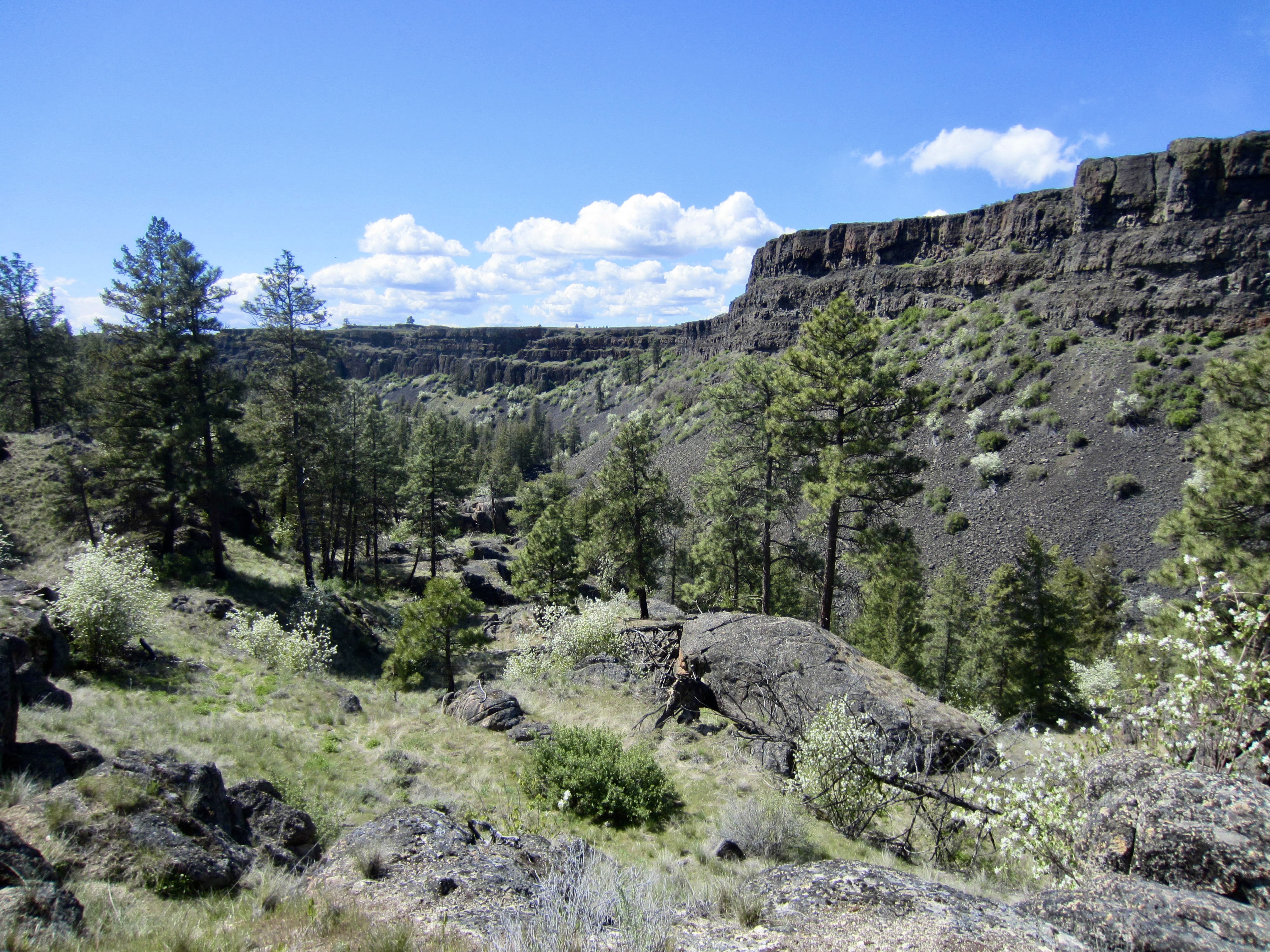 The Northrup Homestead marks the end of the old road and the head of the lower canyon, which features relatively flat terrain. From there, a single-track trail continues northward into the steeper and narrower upper canyon. We hiked past scattered ponderosa pine trees and granite outcrops, far below a palisade of black, brown, and yellow basalt flows.