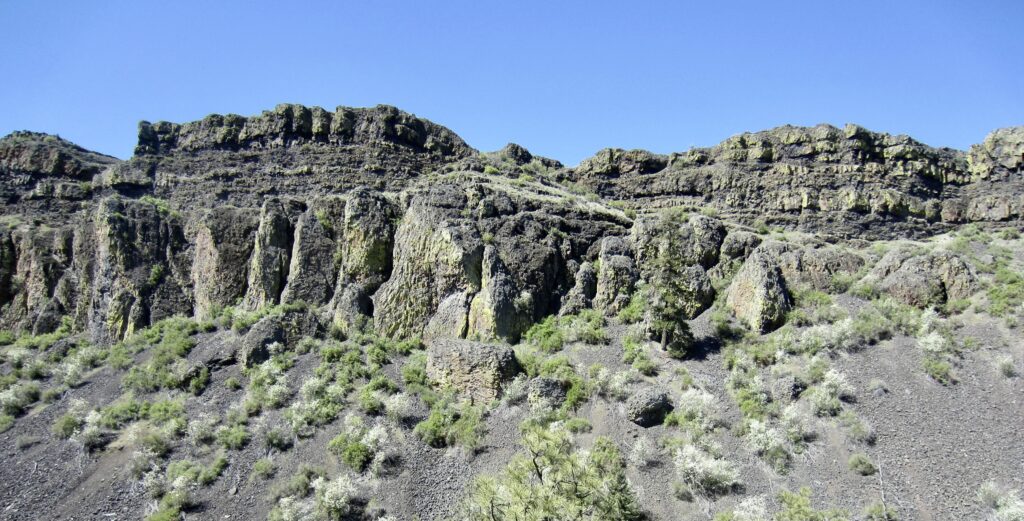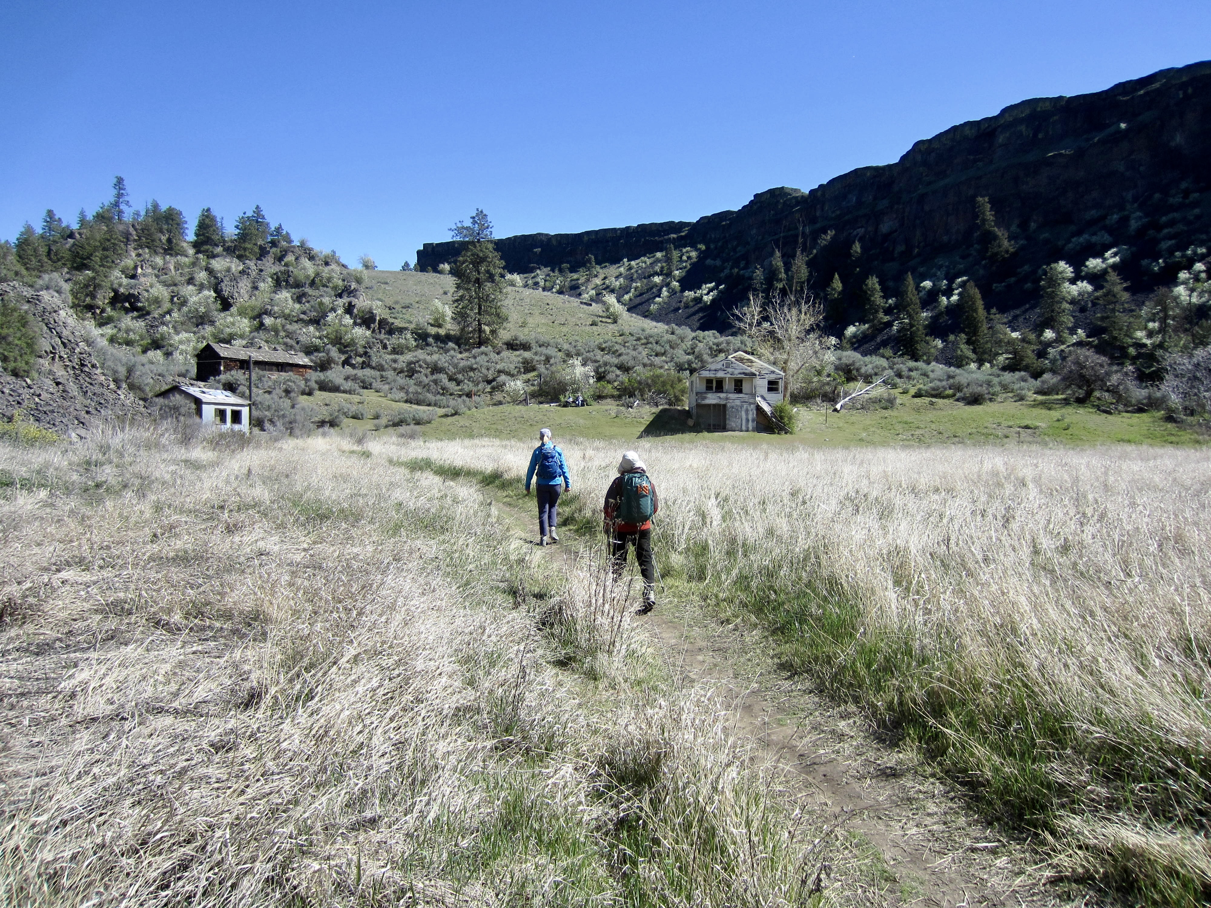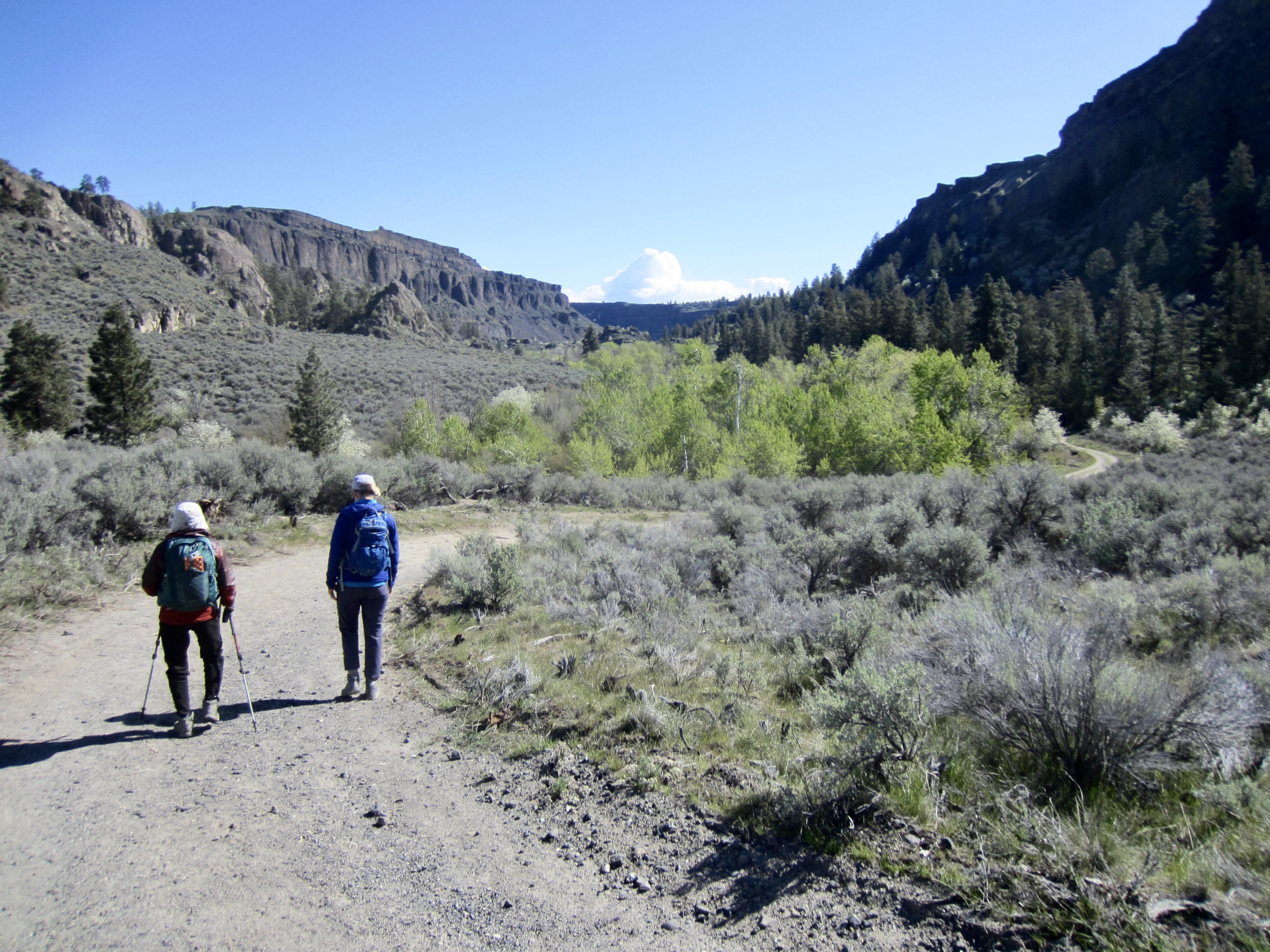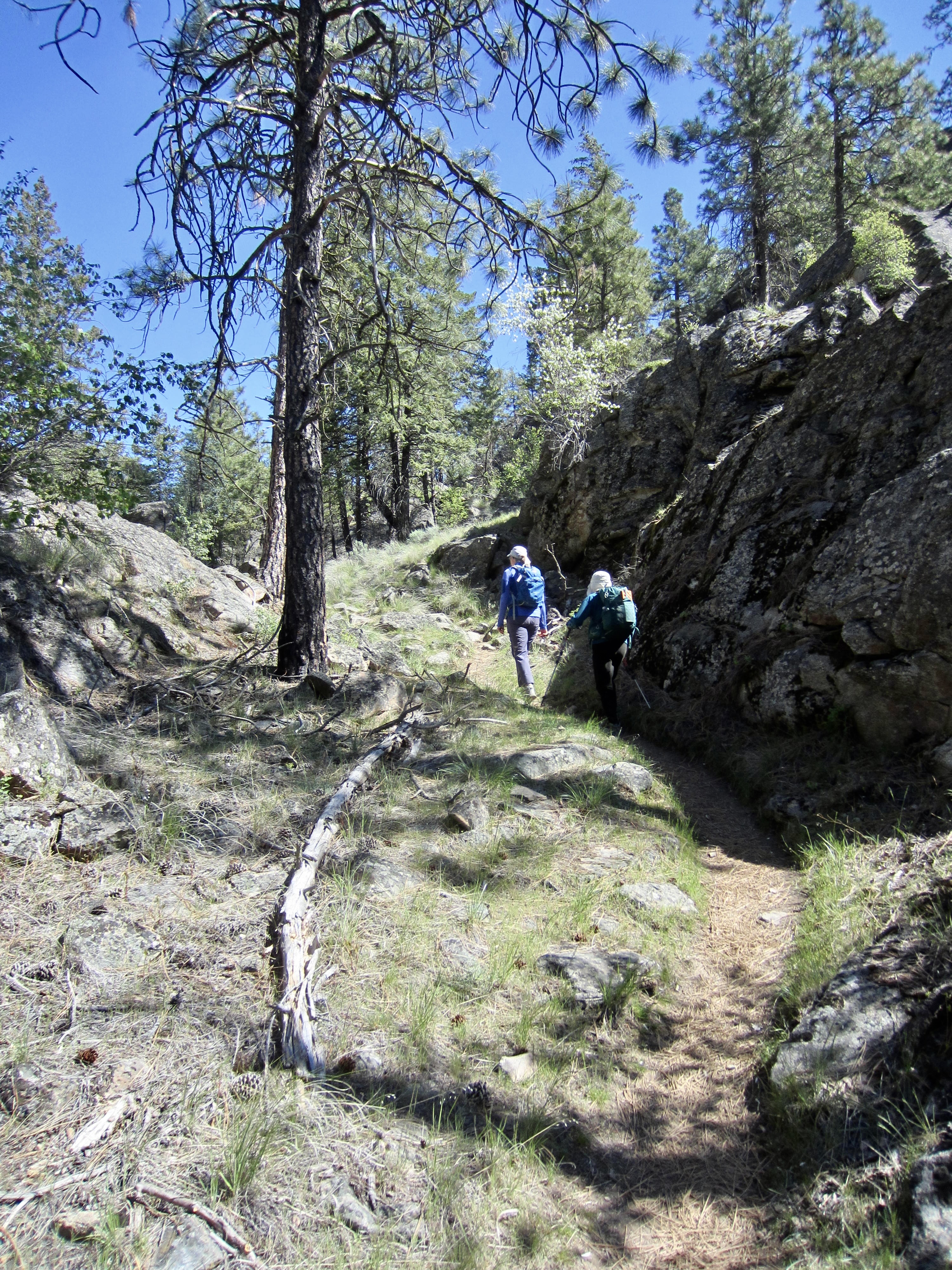 The Northrup Homestead marks the end of the old road and the head of the lower canyon, which features relatively flat terrain. From there, a single-track trail continues northward into the steeper and narrower upper canyon. We hiked past scattered ponderosa pine trees and granite outcrops, far below a palisade of black, brown, and yellow basalt flows.