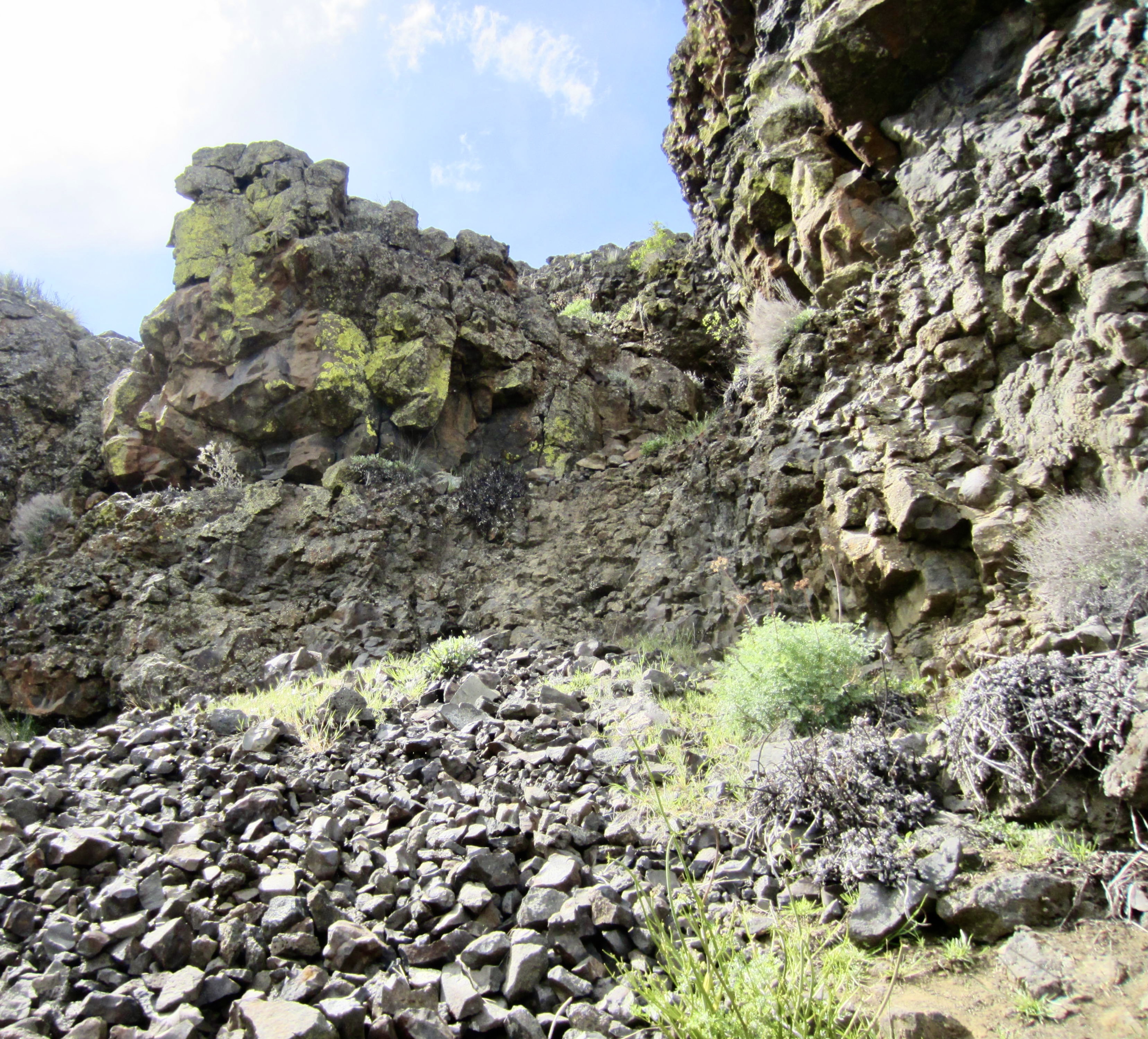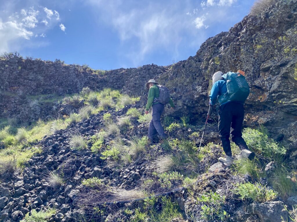Our descent of the promontory arm led us to a grassy gap at 2070 feet. From there, we turned south and easily dropped down a grassy draw that appeared to represent a geologic contact between the older granite bedrock on our right and the newer basalt flows on our left.